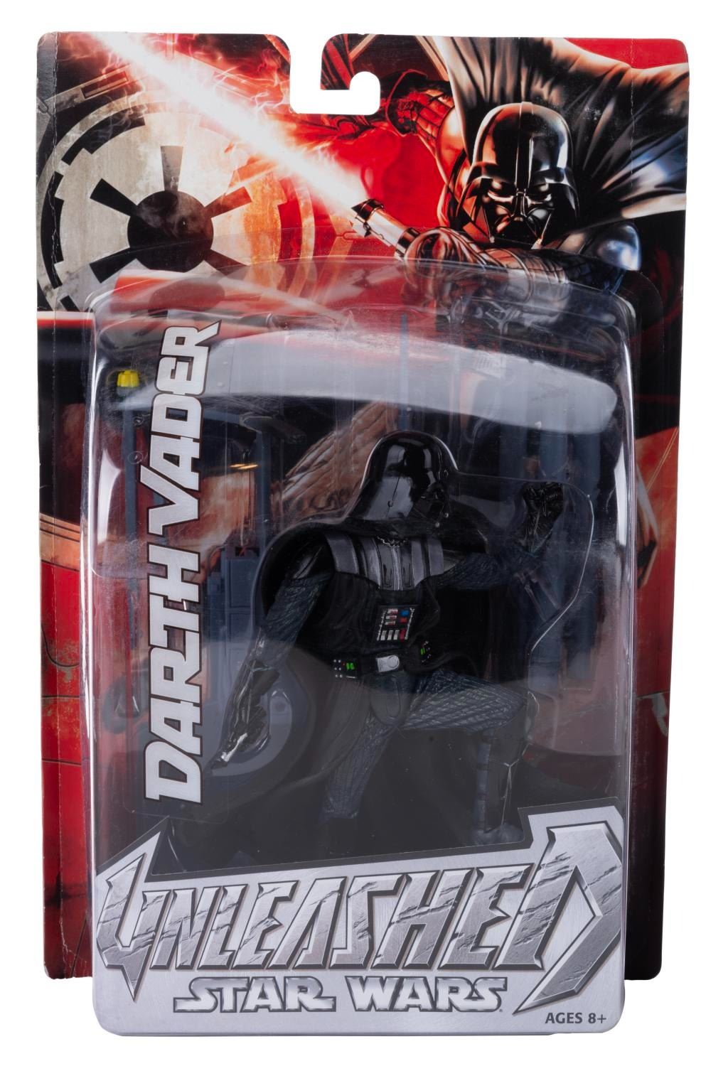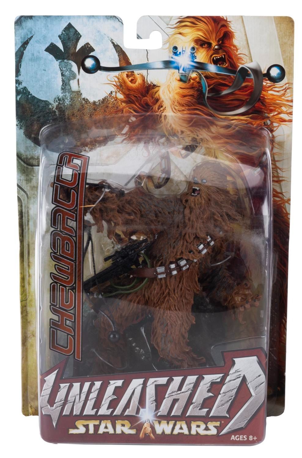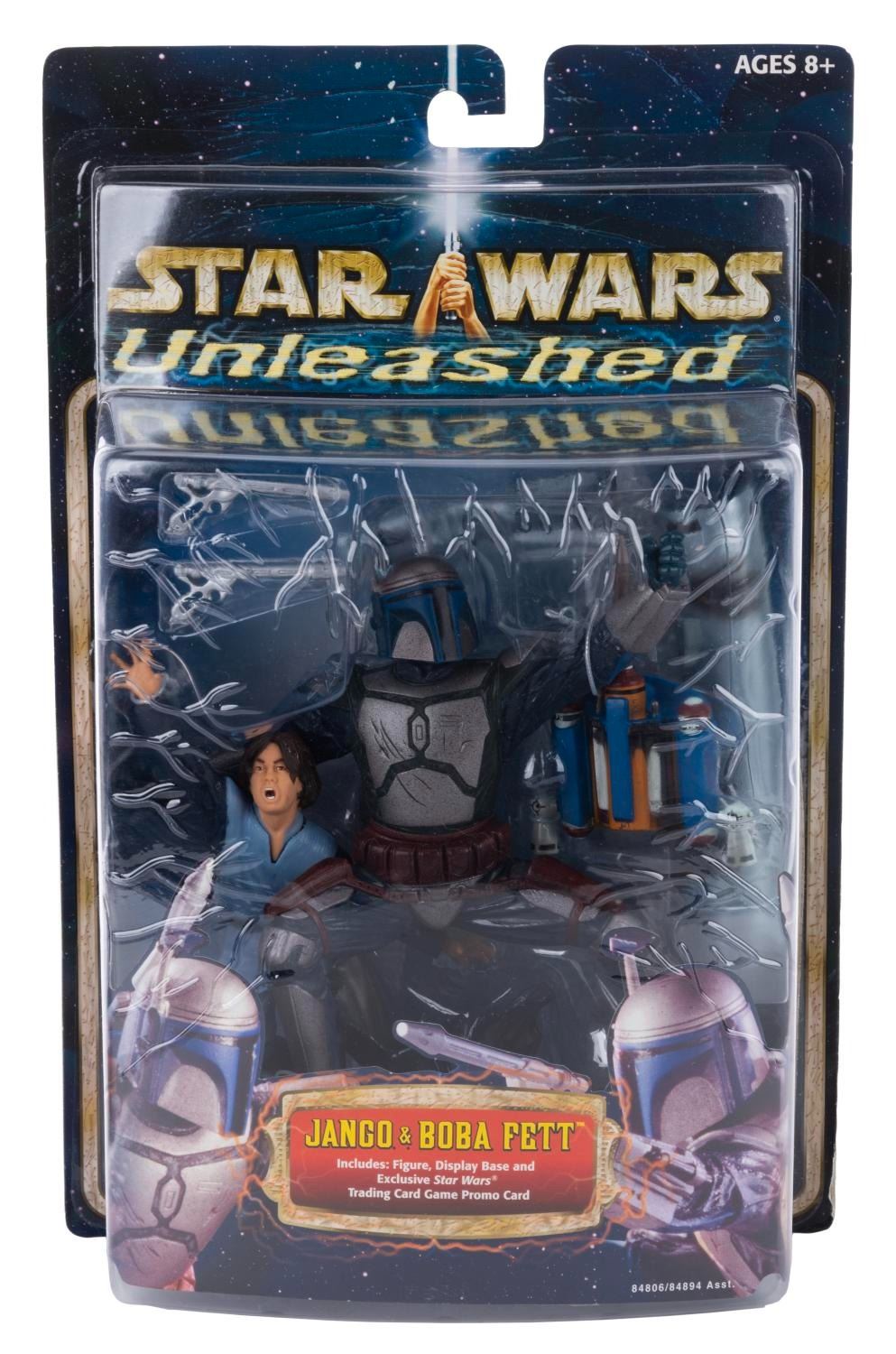 (Hasbro, 2002-2004) A collection of four unopened Star Wars Unleashed figures including Darth Vader, Boba Fett, Chewbacca, and Jango with a young Boba Fett. Measuring 8.75” x 3.75” x 13.75”, the figures display in good condition with wear and creasing to the backing cards.