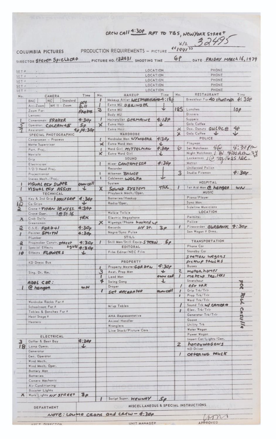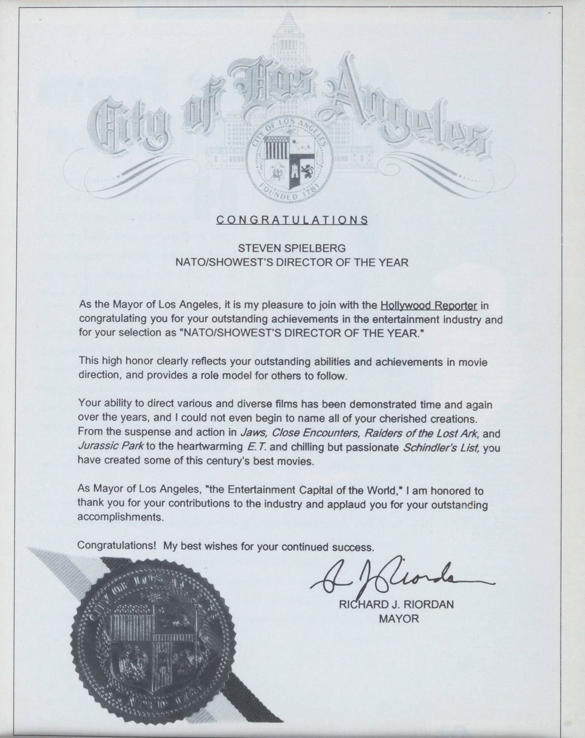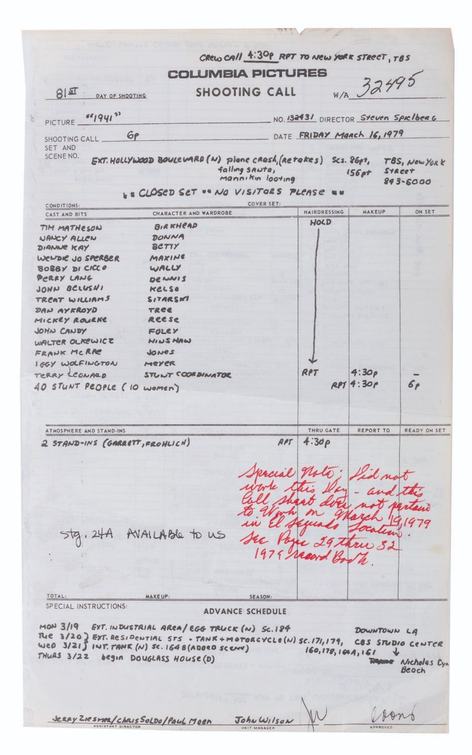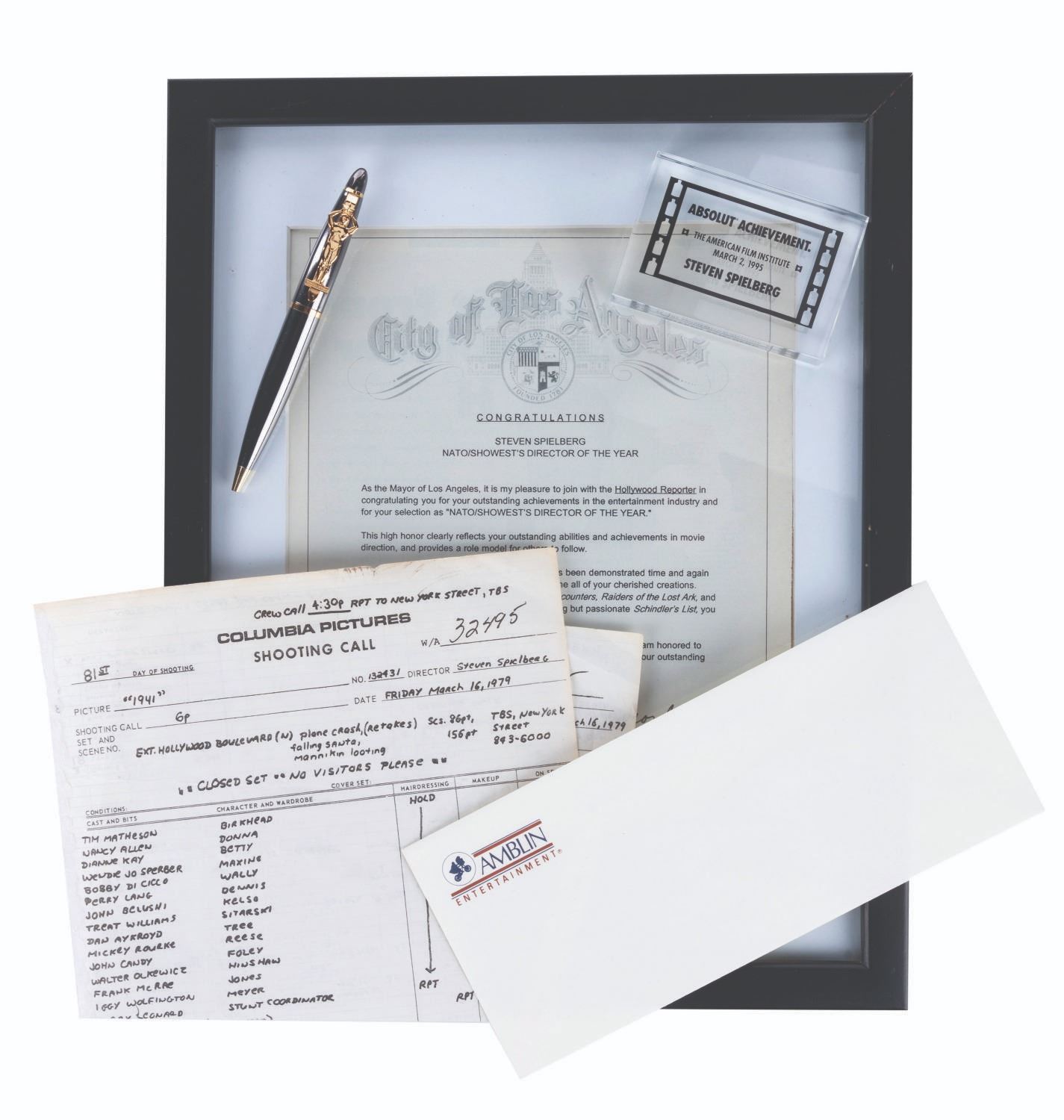 (Spielberg, 1980s-1990s) A collection of ephemera related to famed director and producer Steven Spielberg. Included in the lot are a call sheet from the production of 1941, an envelope from Spielberg's company Amblin Entertainment, a framed copy of a Variety congratulations ad from Los Angeles Mayor Richard Riordan honoring Spielberg, a Universal Pictures pen, and Spielberg's AFI lifetime achievement award lucite plaque that was sent to Amblin, with a ticket to that award's presentation ceremony. Measuring various sizes, the items are in very good condition, with the call sheet good showing wear from age and handling.