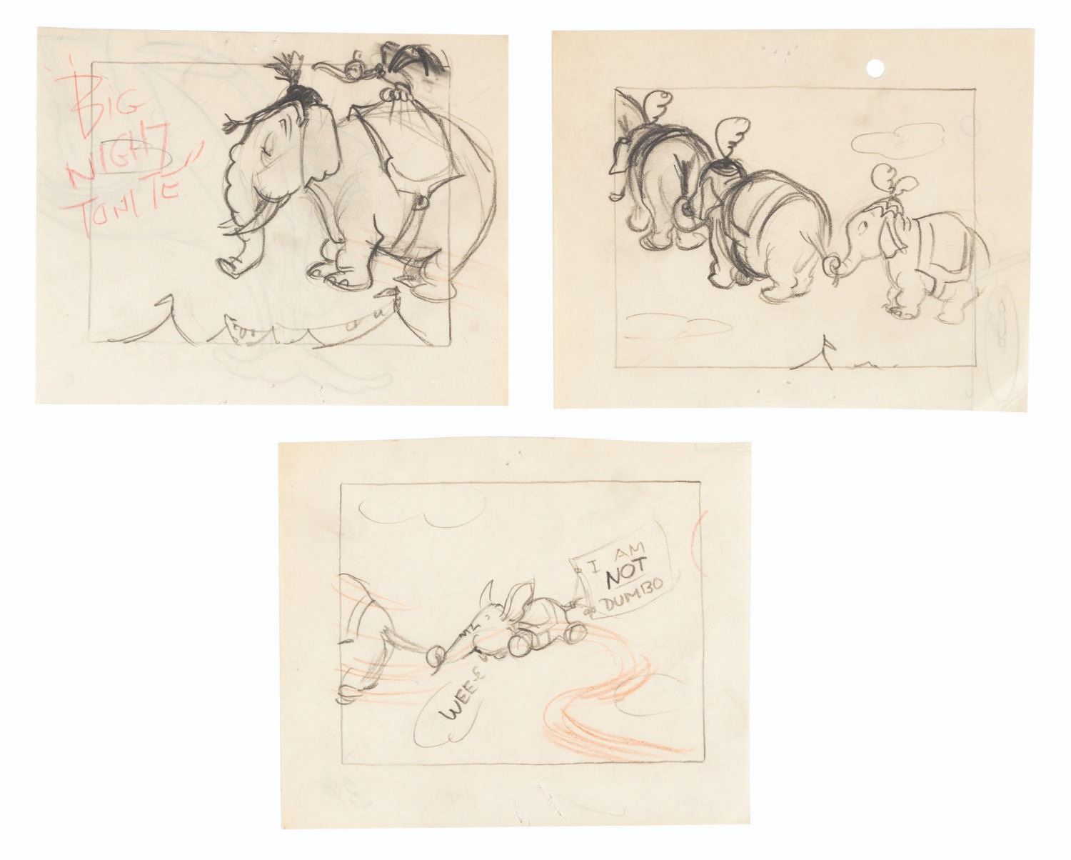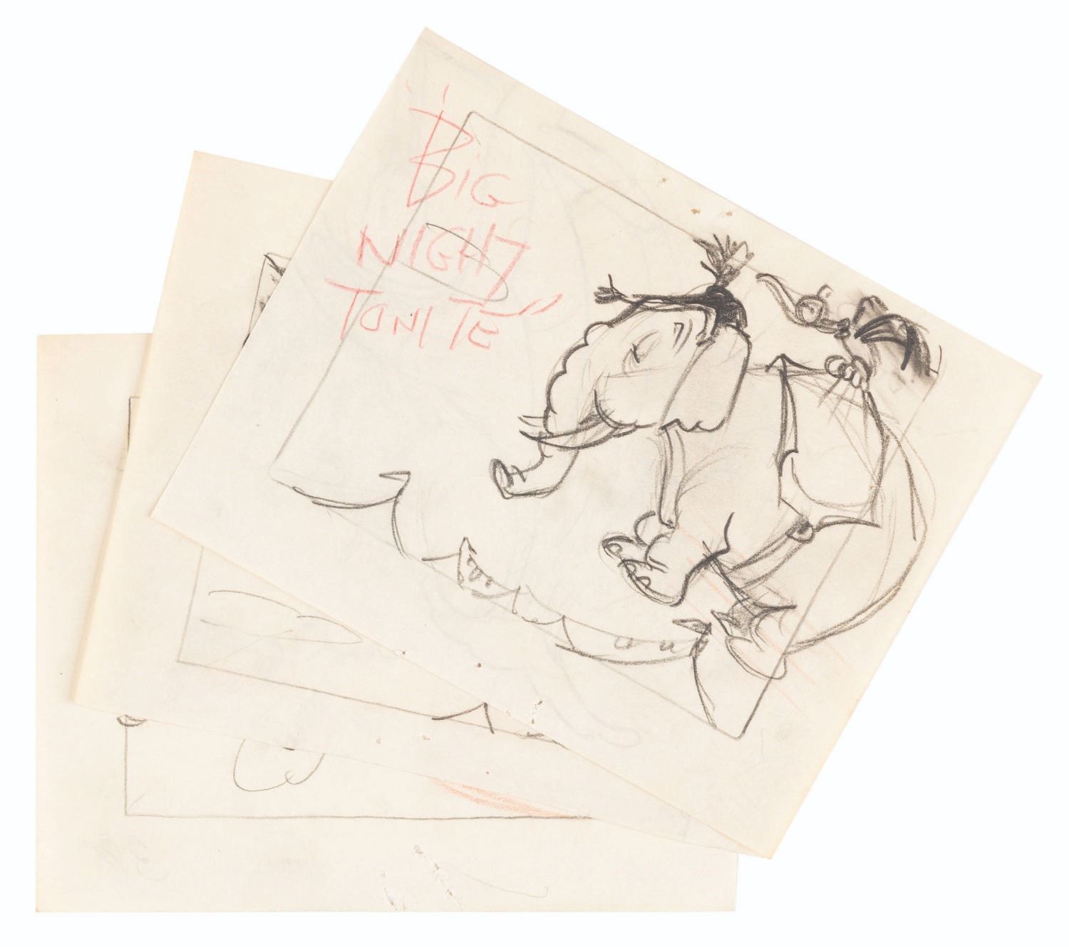 (Warner Bros., 1945) A collection of three storyboard panels of Elephants from the Bob Clampett-directed Looney Tunes short “The Bashful Buzzard.” The panels feature production drawings from the Looney Tunes short “Porky’s Five and Ten” on their reverse sides. This practice was not uncommon, as Warner Bros. would save costs by cutting old production drawings into quarters, using the backs as storyboard paper. Measuring 4.5” x 6”, the panels display in very good production-used condition with creases, pinholes with some corner tears, and light discoloration from age.