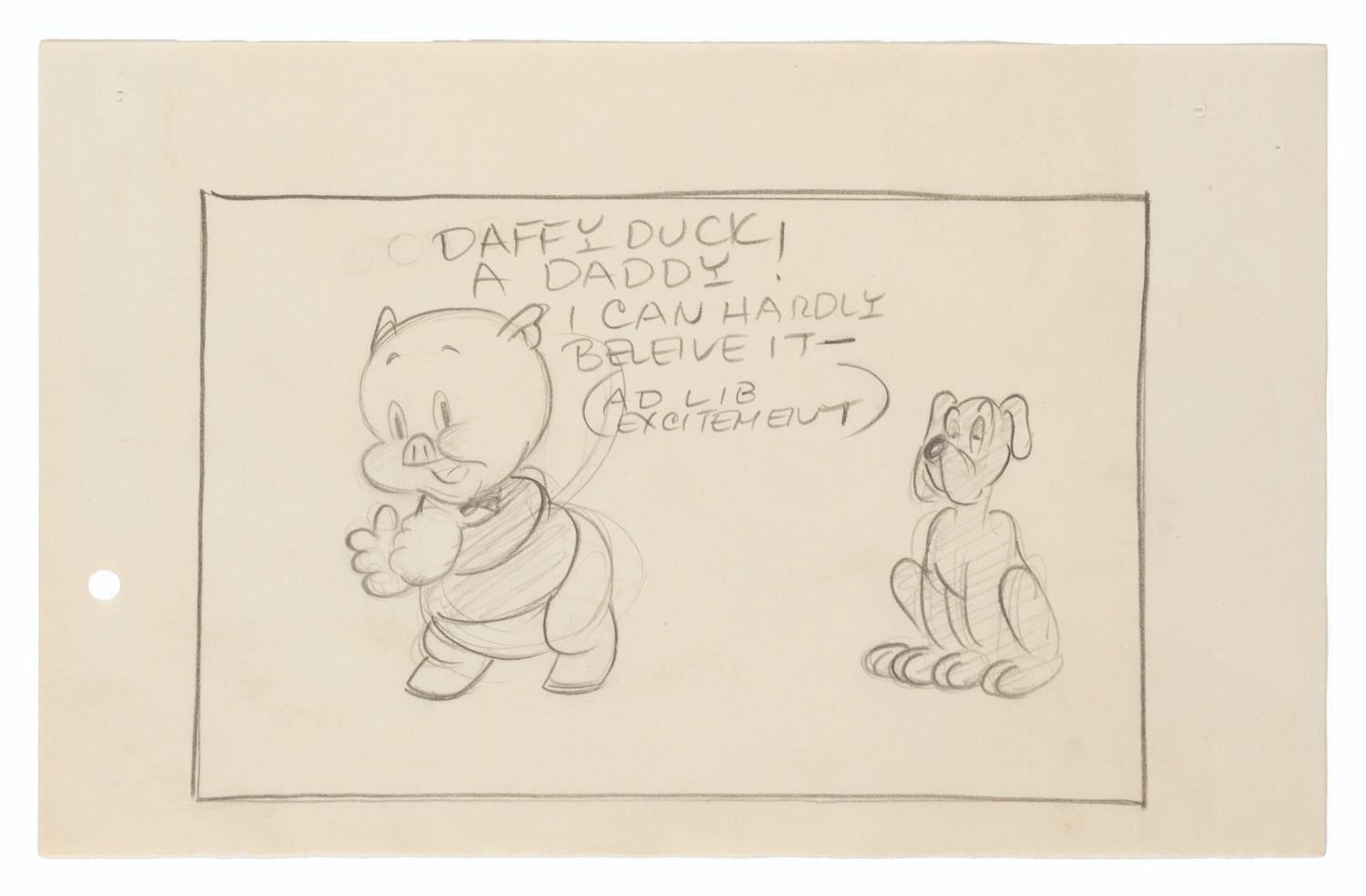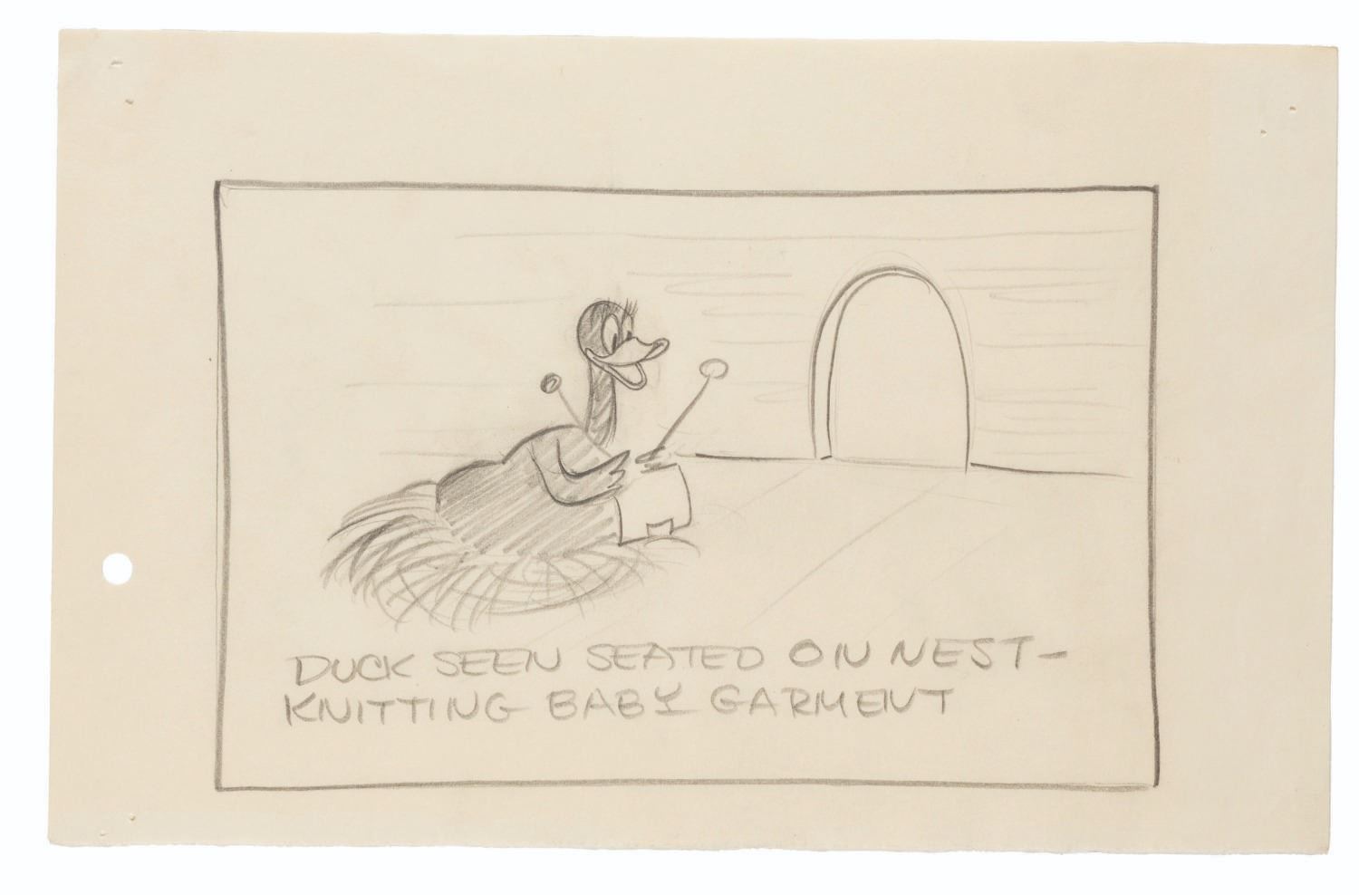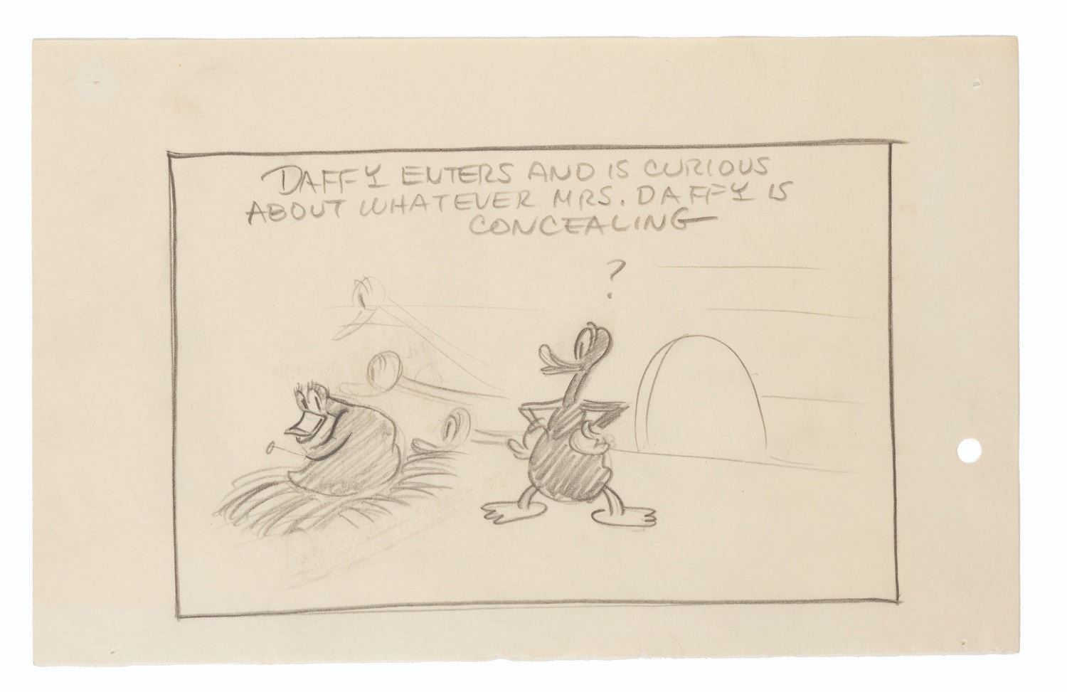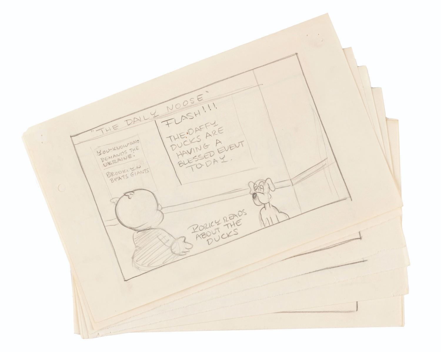 (Schlesinger, 1939) A collection of nine storyboard panels featuring Porky, Daffy, and Mrs. Daffy from the Bob Clampett-directed Looney Tunes short “Wise Quacks.” Accomplished in graphite and ranging in size from 6” x 9.5” to 6.5” x 9.5”, the panels display in very good production-used condition with creases, pinholes with some corner tears, and light discoloration from age.