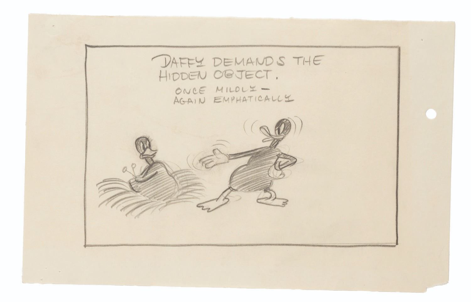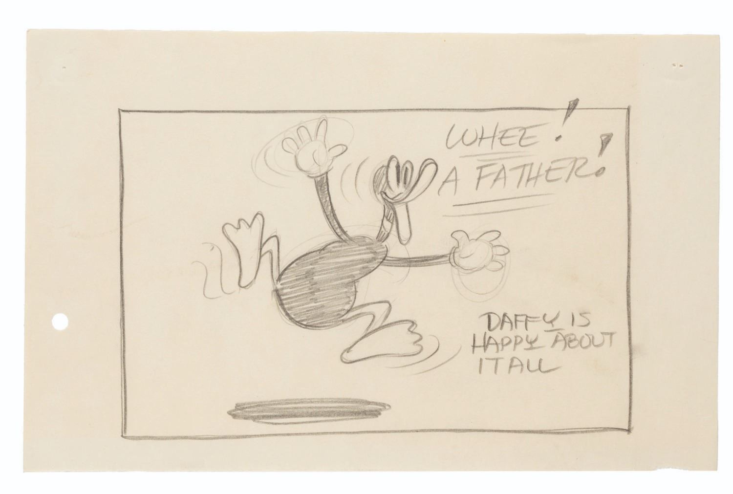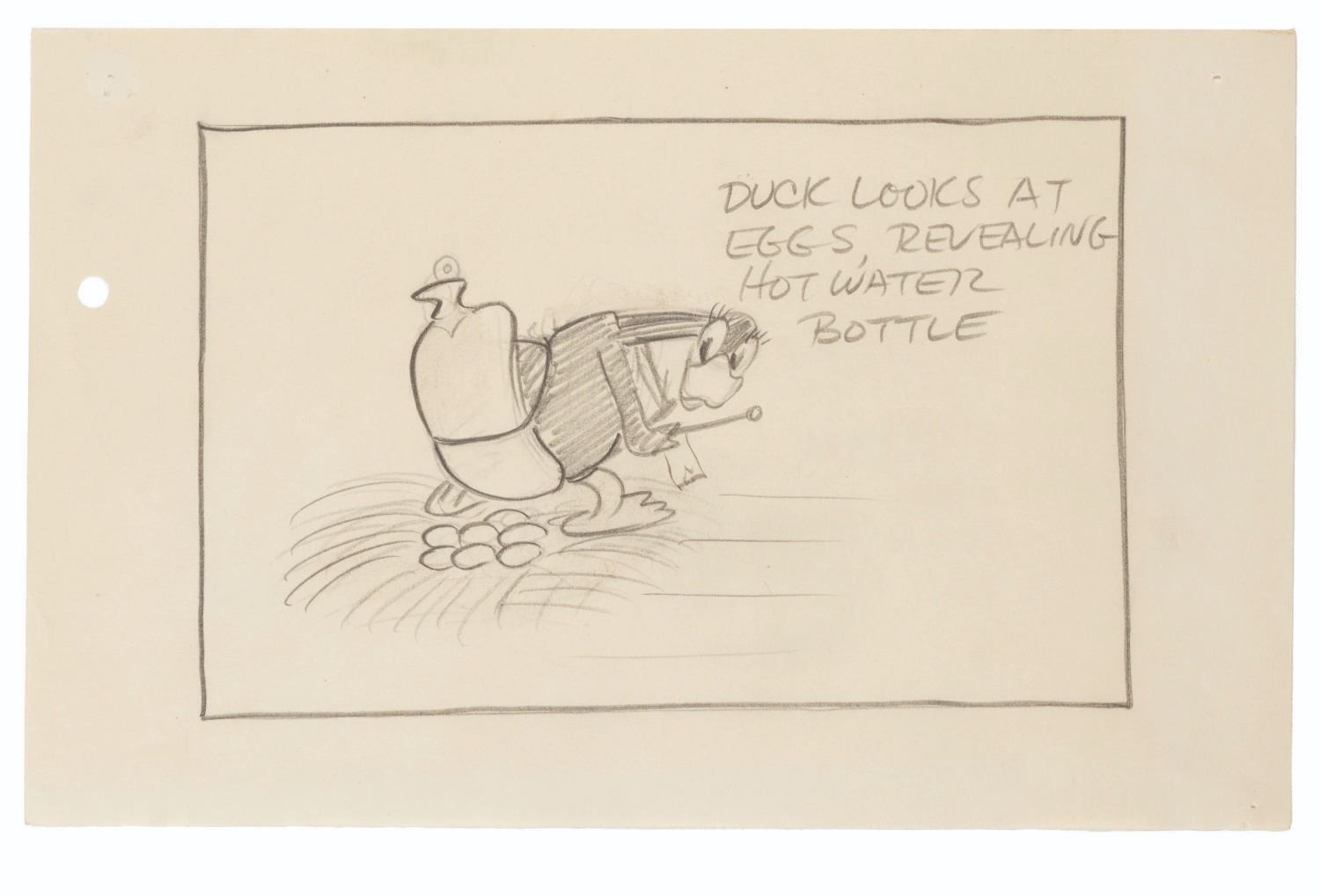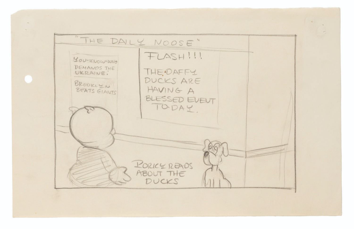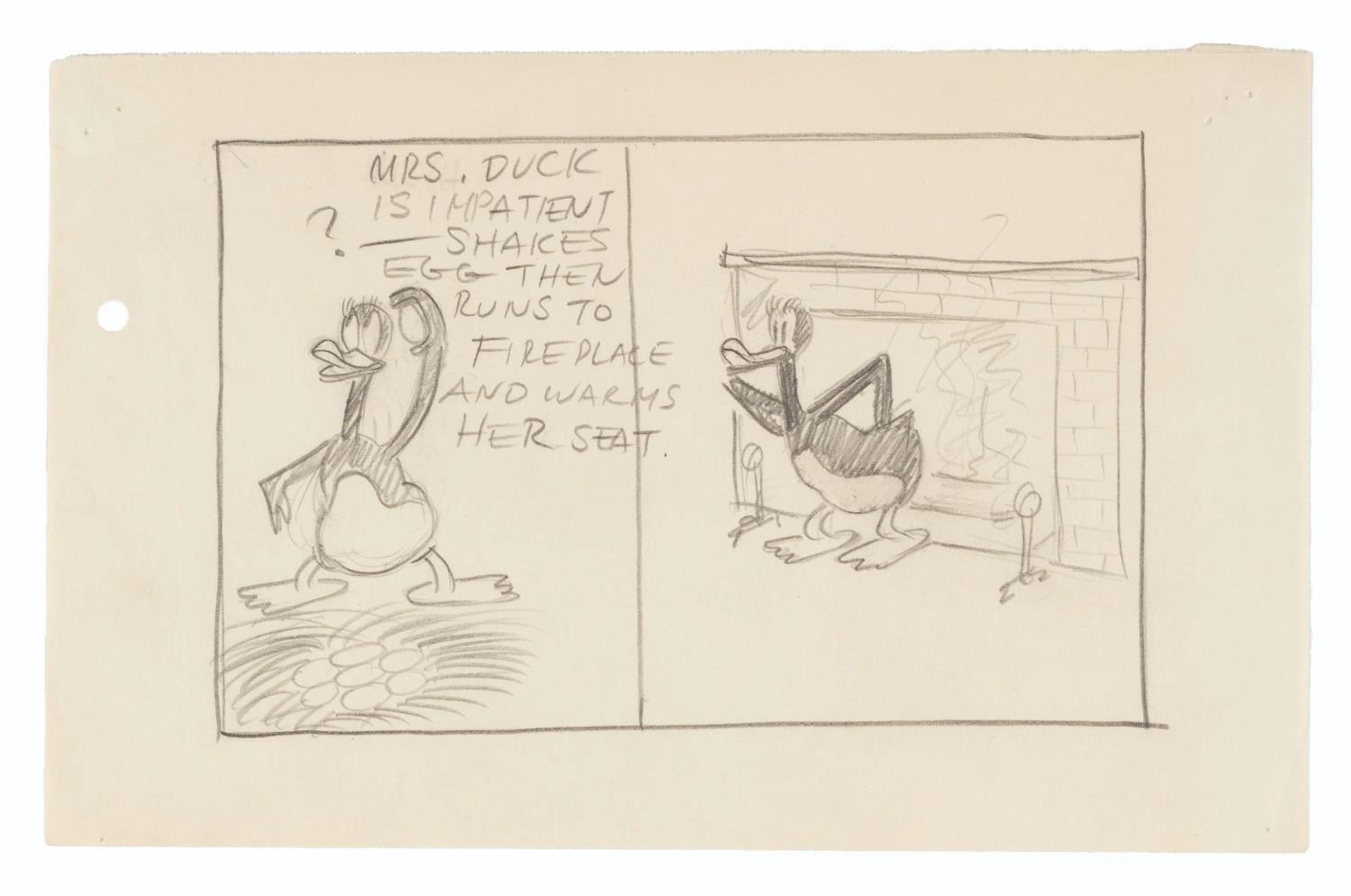 (Schlesinger, 1939) A collection of nine storyboard panels featuring Porky, Daffy, and Mrs. Daffy from the Bob Clampett-directed Looney Tunes short “Wise Quacks.” Accomplished in graphite and ranging in size from 6” x 9.5” to 6.5” x 9.5”, the panels display in very good production-used condition with creases, pinholes with some corner tears, and light discoloration from age.