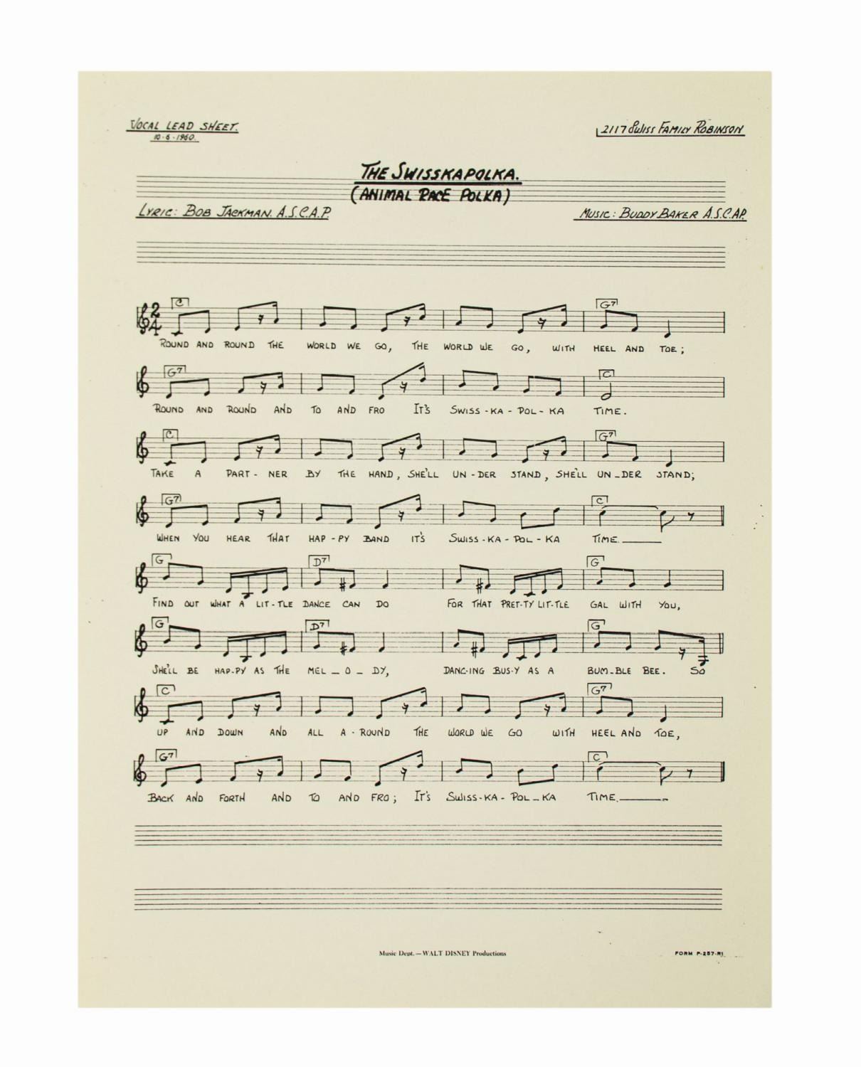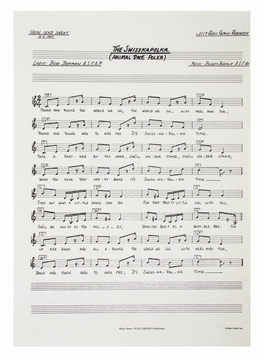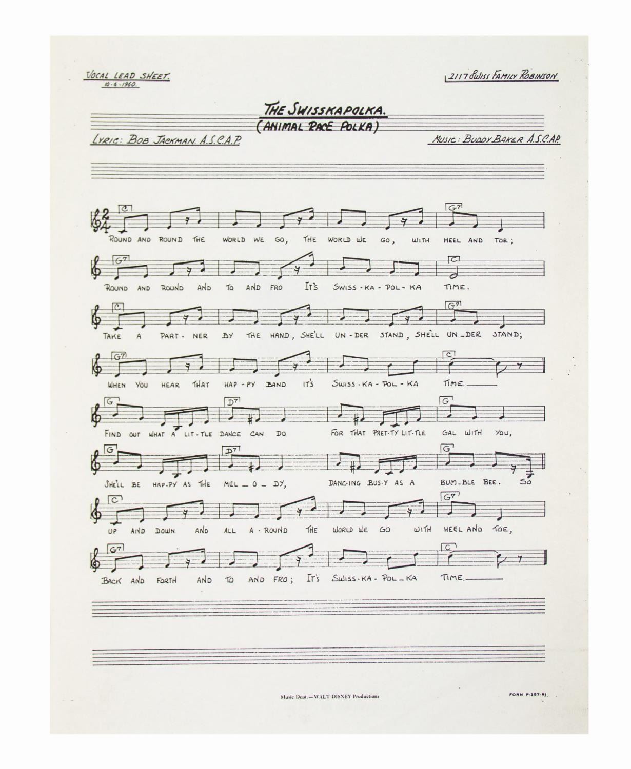 (Disneyland, 1960s-80s) A collection of vocal lead sheet music for “The Swisskapolka (Animal Race Polka)” from the Swiss Family Robinson Treehouse, with music by Buddy Baker and lyrics by Bob Jackman. Ranging in size from 9.5” x 12.5” to 11” x 15.25”, the reprinted sheet music is in very good condition with light wear.