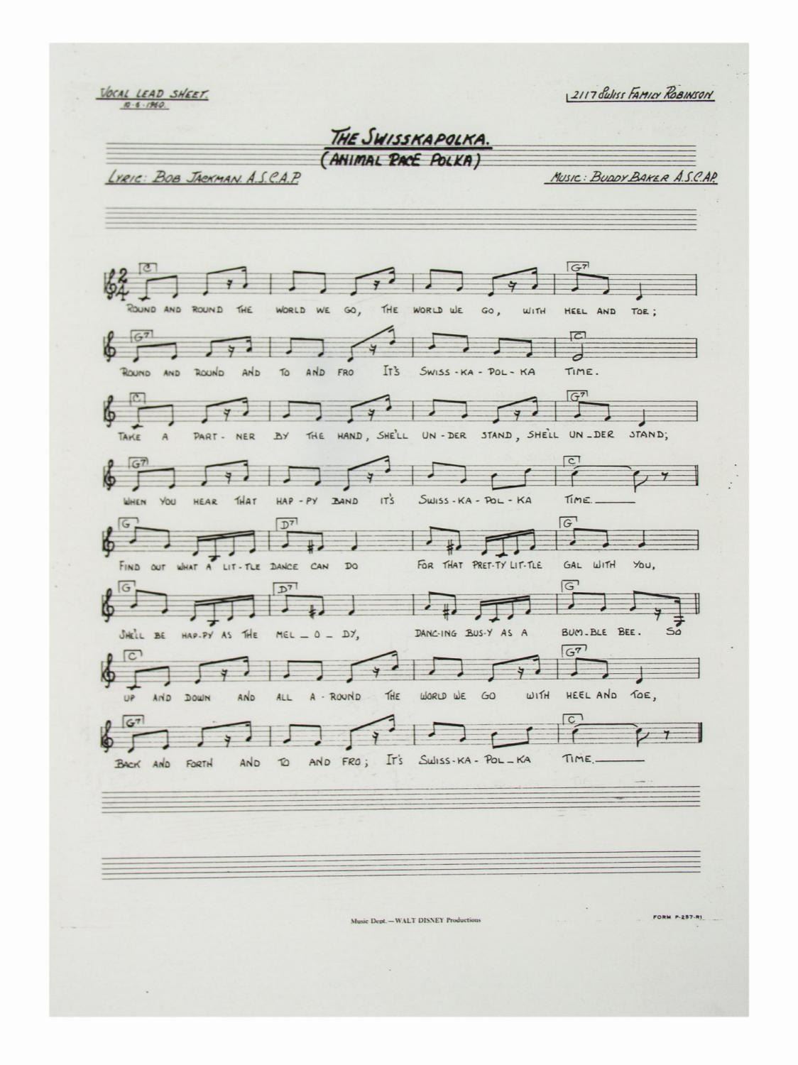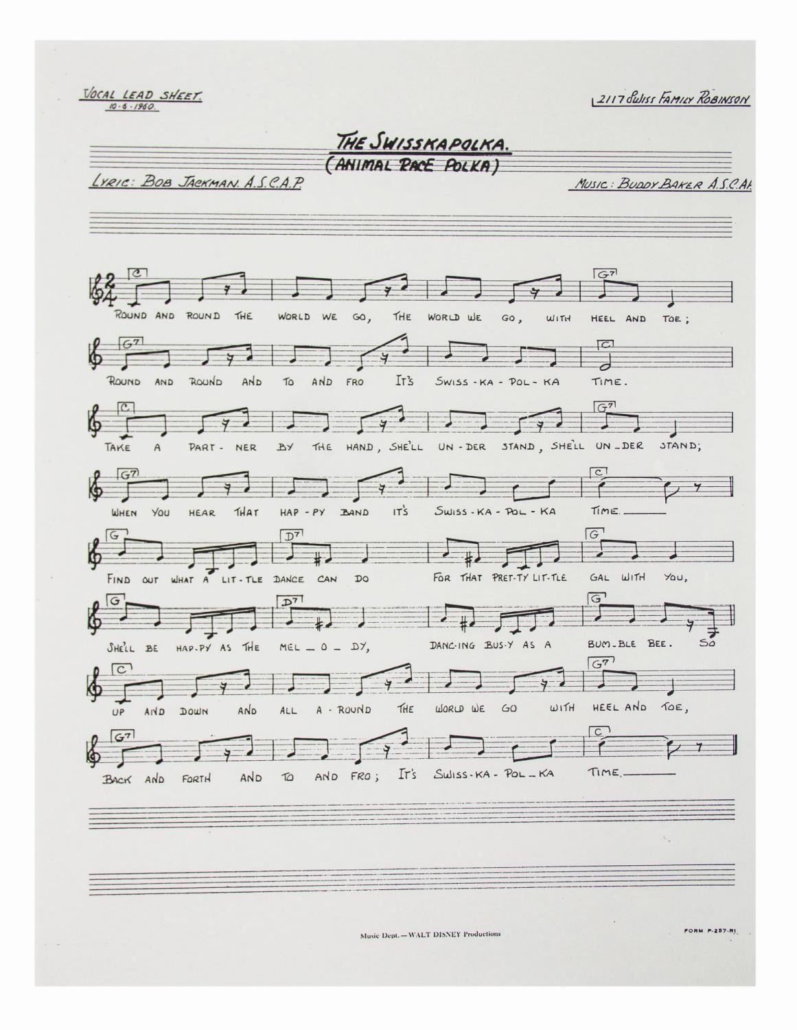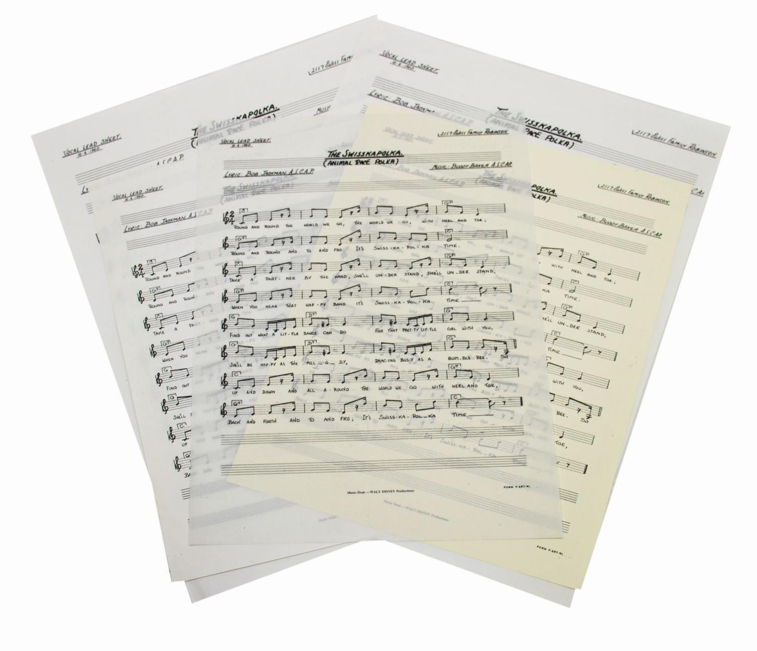 (Disneyland, 1960s-80s) A collection of vocal lead sheet music for “The Swisskapolka (Animal Race Polka)” from the Swiss Family Robinson Treehouse, with music by Buddy Baker and lyrics by Bob Jackman. Ranging in size from 9.5” x 12.5” to 11” x 15.25”, the reprinted sheet music is in very good condition with light wear.