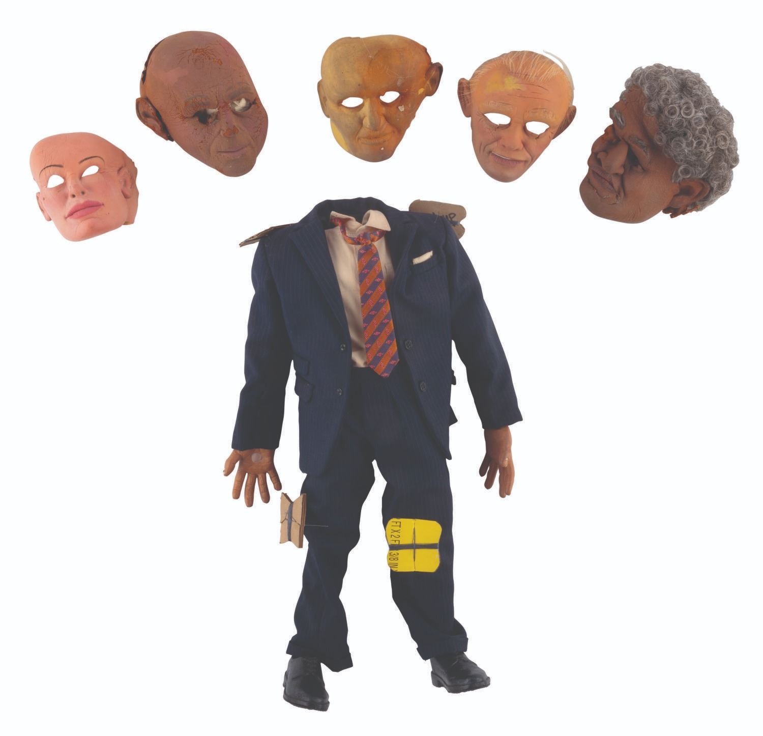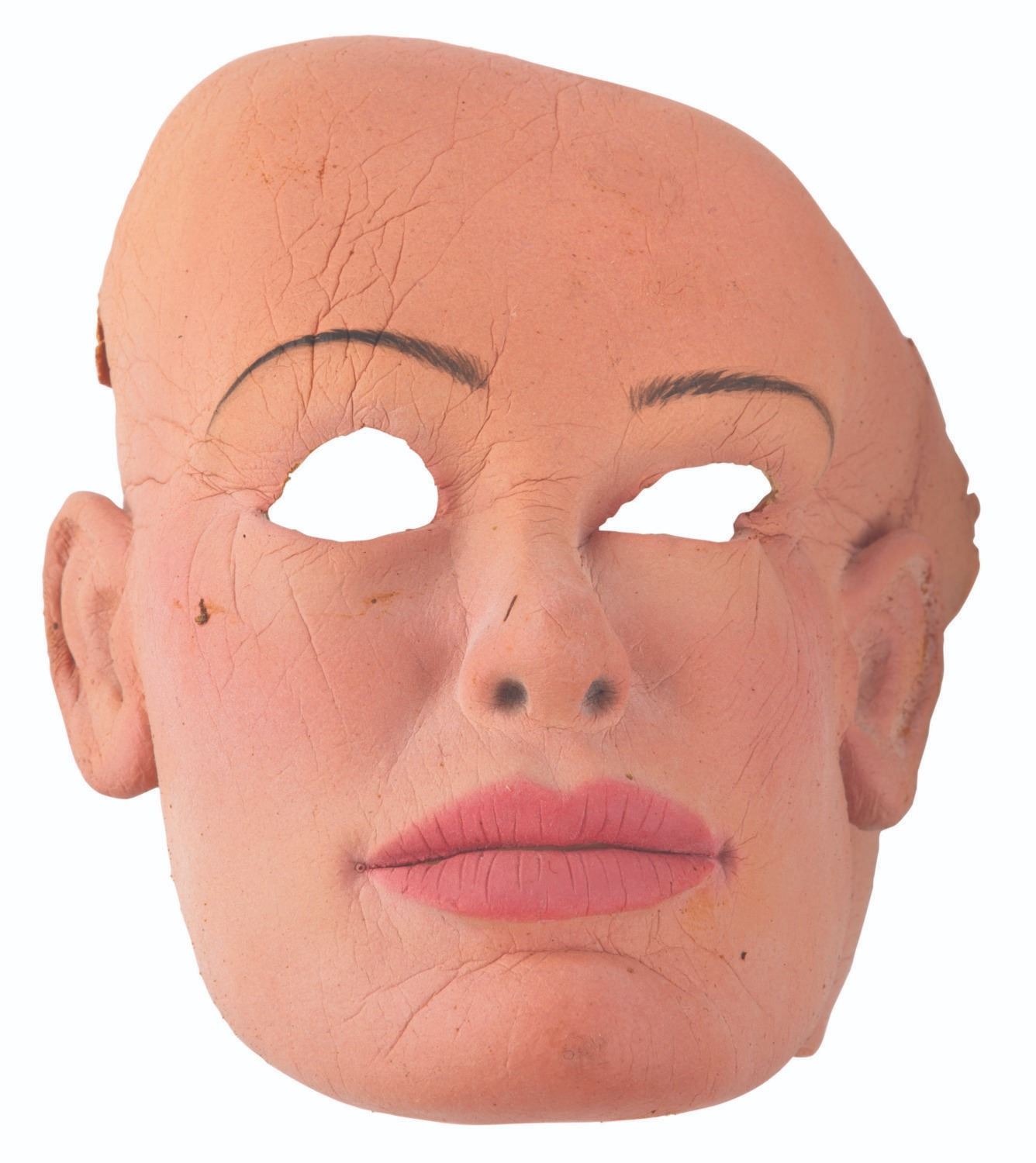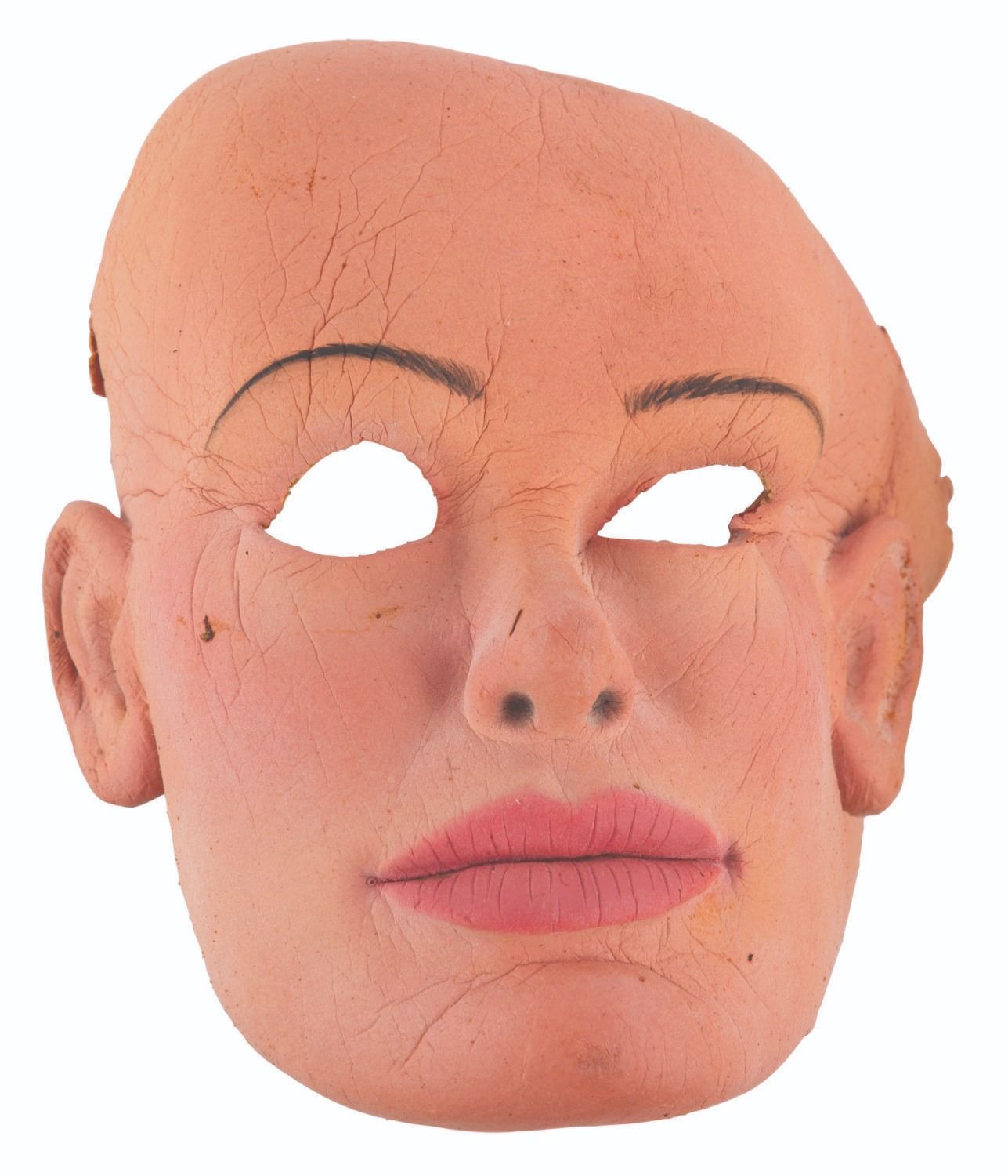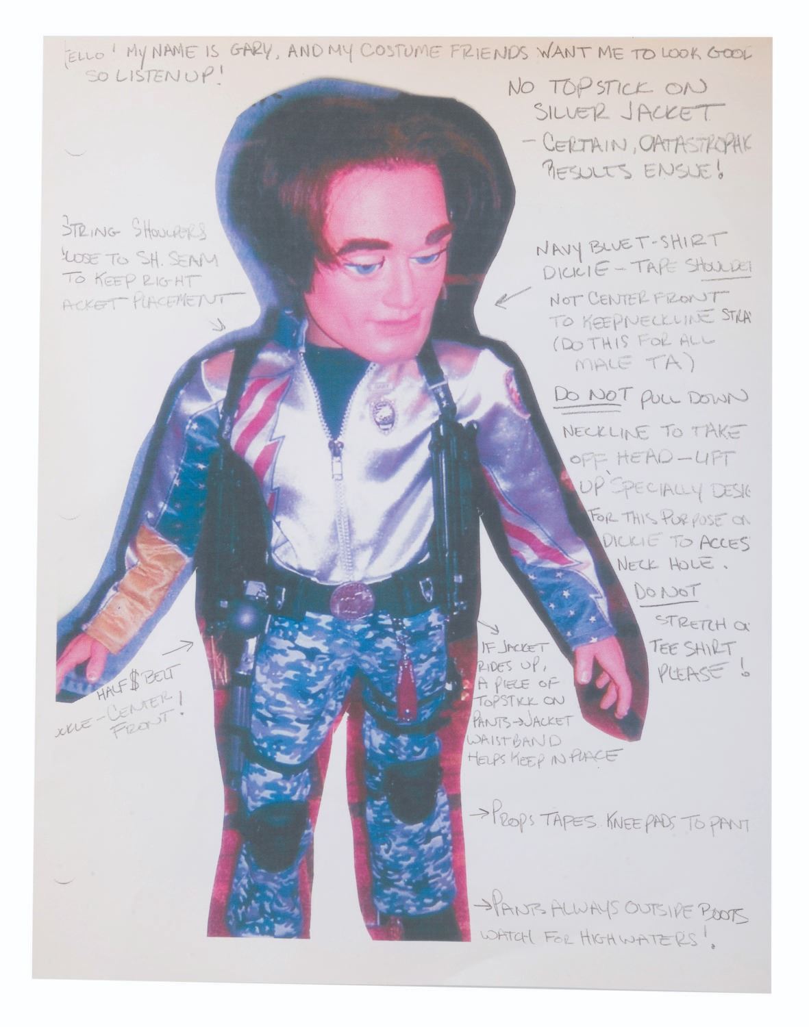 (Paramount, 2004) A collection of puppet props and costume pieces from “Team America: World Police,” the political comedy from the creators of “South Park.” This lot includes the body of Spottswoode, the eccentric team leader, in his full suit costume. Five puppet head skins are included for Spottswoode, female lead Sarah, and three background characters. The lot also has two instructional sheets on how to dress the puppets, two pieces of black fabric, and two female puppet hands, one of which is painted. Ranging in size from the to the 17” tall Spottswoode puppet, the props are in fair to very good condition with tears, cracks, flaking, creases, material loss, and wear from production use.