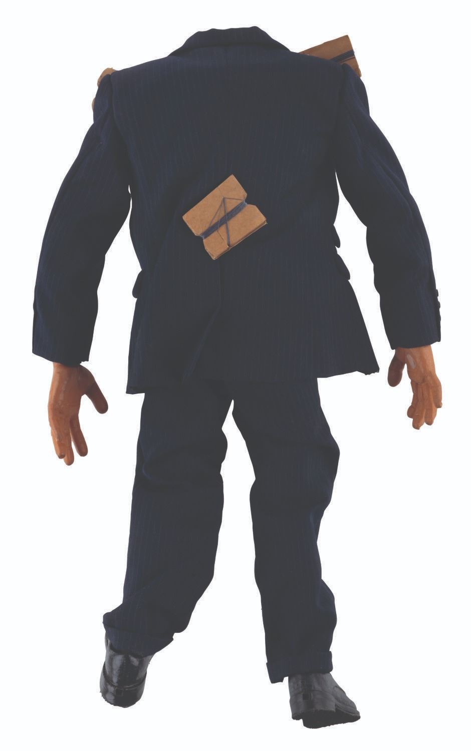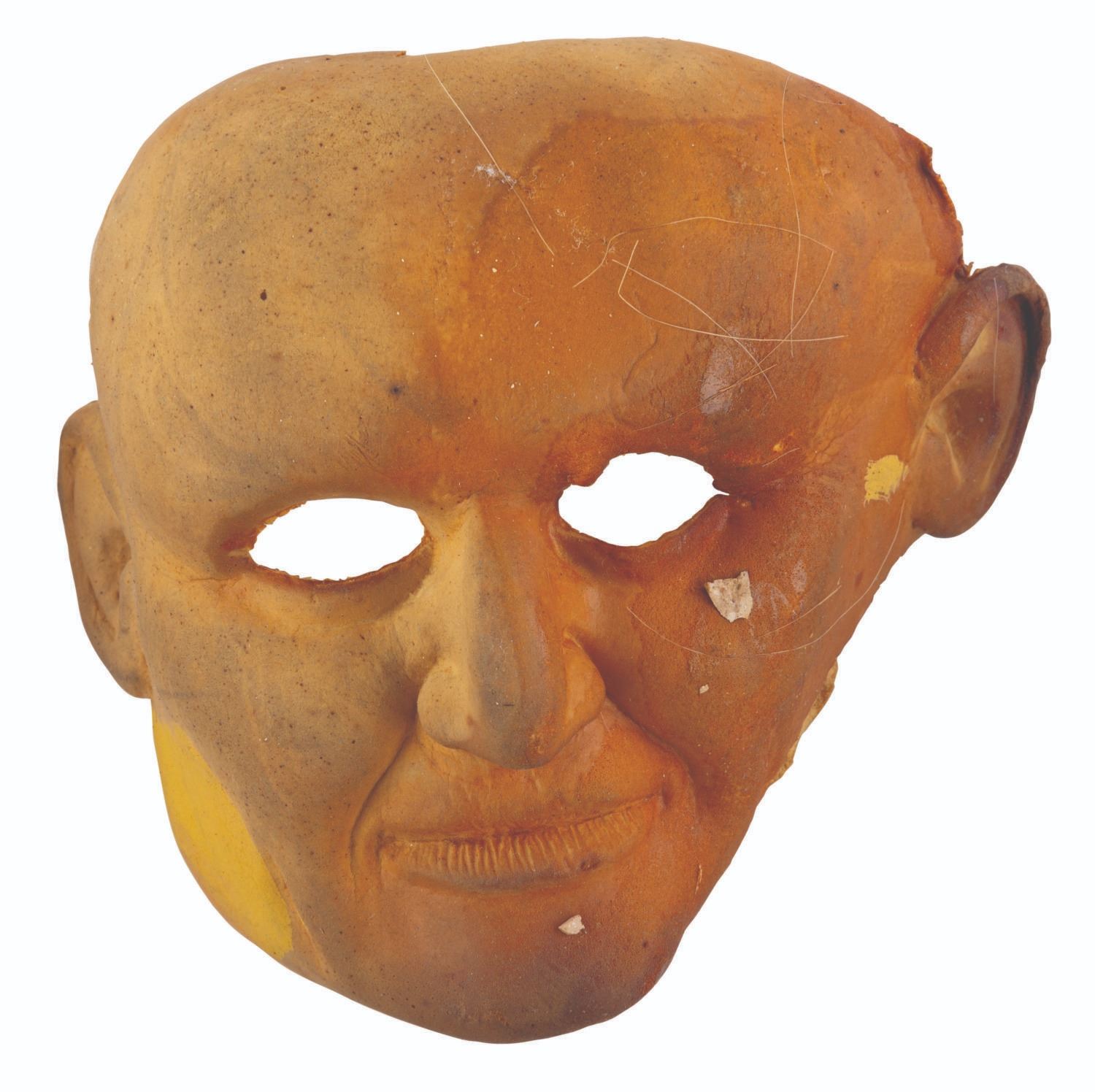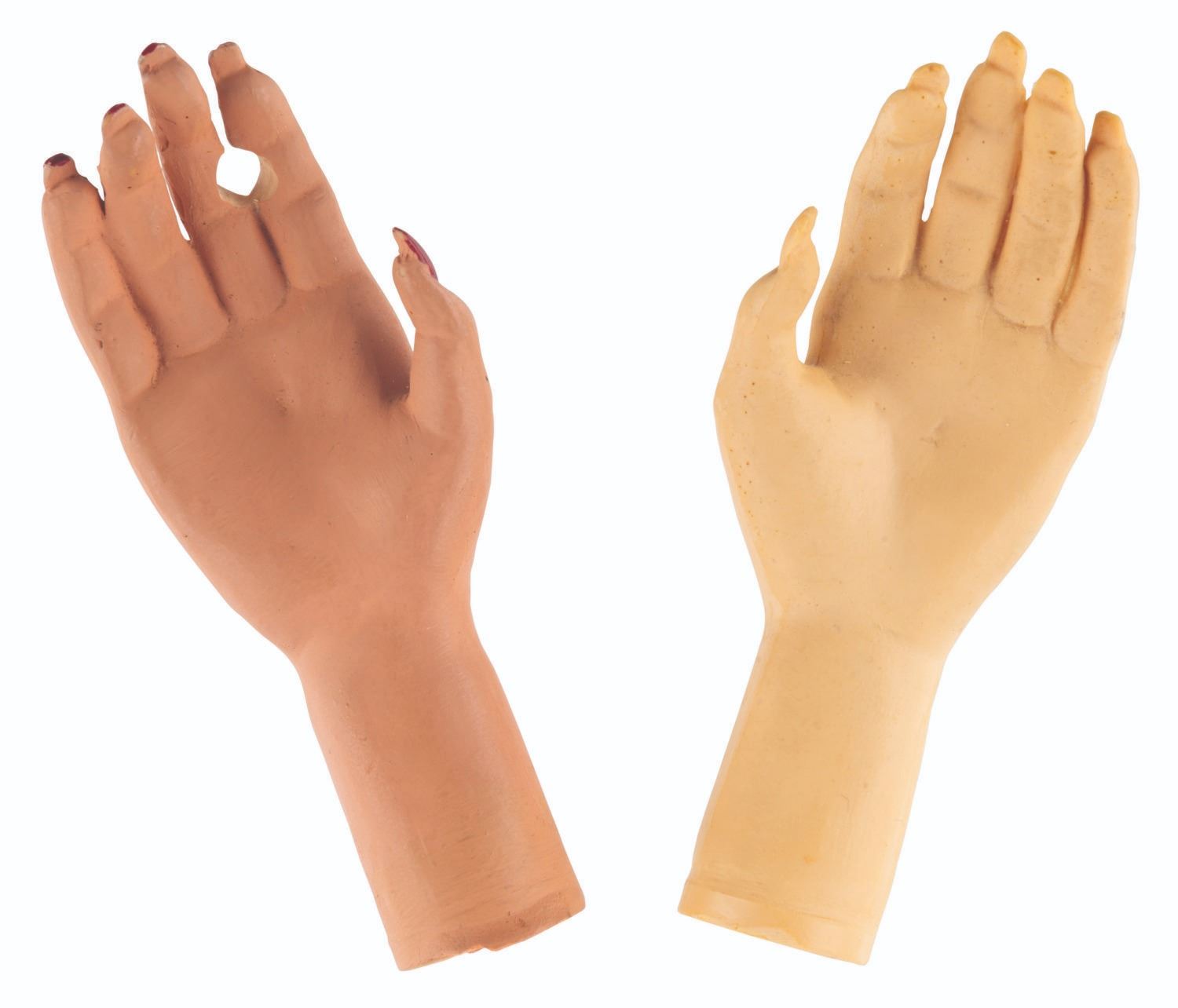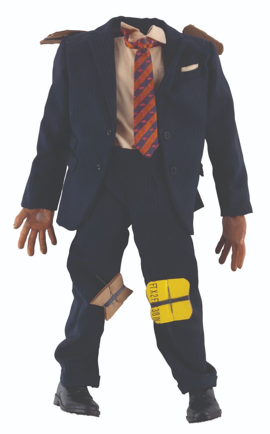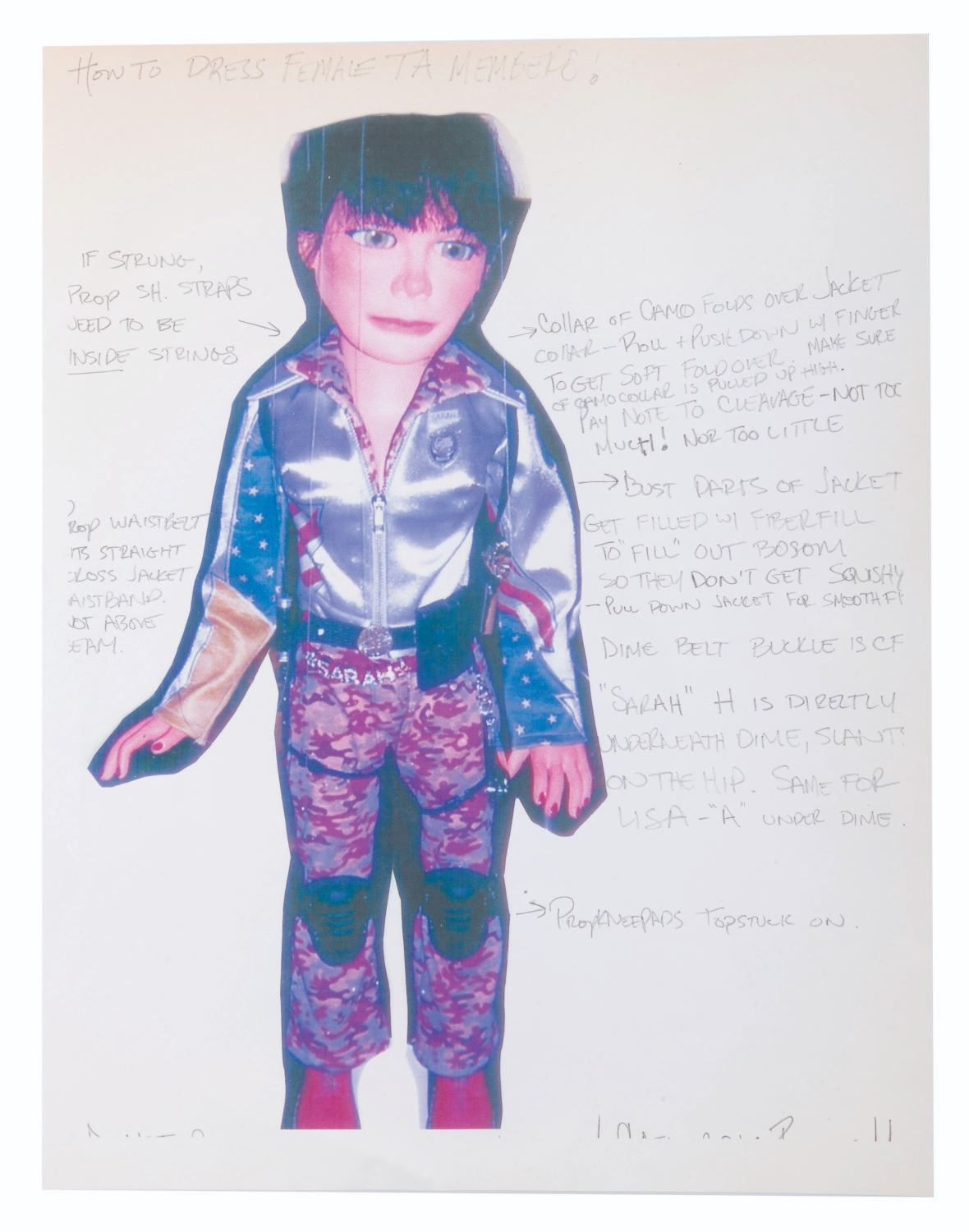 (Paramount, 2004) A collection of puppet props and costume pieces from “Team America: World Police,” the political comedy from the creators of “South Park.” This lot includes the body of Spottswoode, the eccentric team leader, in his full suit costume. Five puppet head skins are included for Spottswoode, female lead Sarah, and three background characters. The lot also has two instructional sheets on how to dress the puppets, two pieces of black fabric, and two female puppet hands, one of which is painted. Ranging in size from the to the 17” tall Spottswoode puppet, the props are in fair to very good condition with tears, cracks, flaking, creases, material loss, and wear from production use.