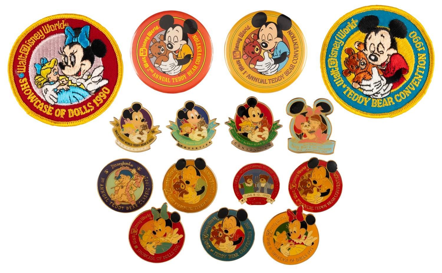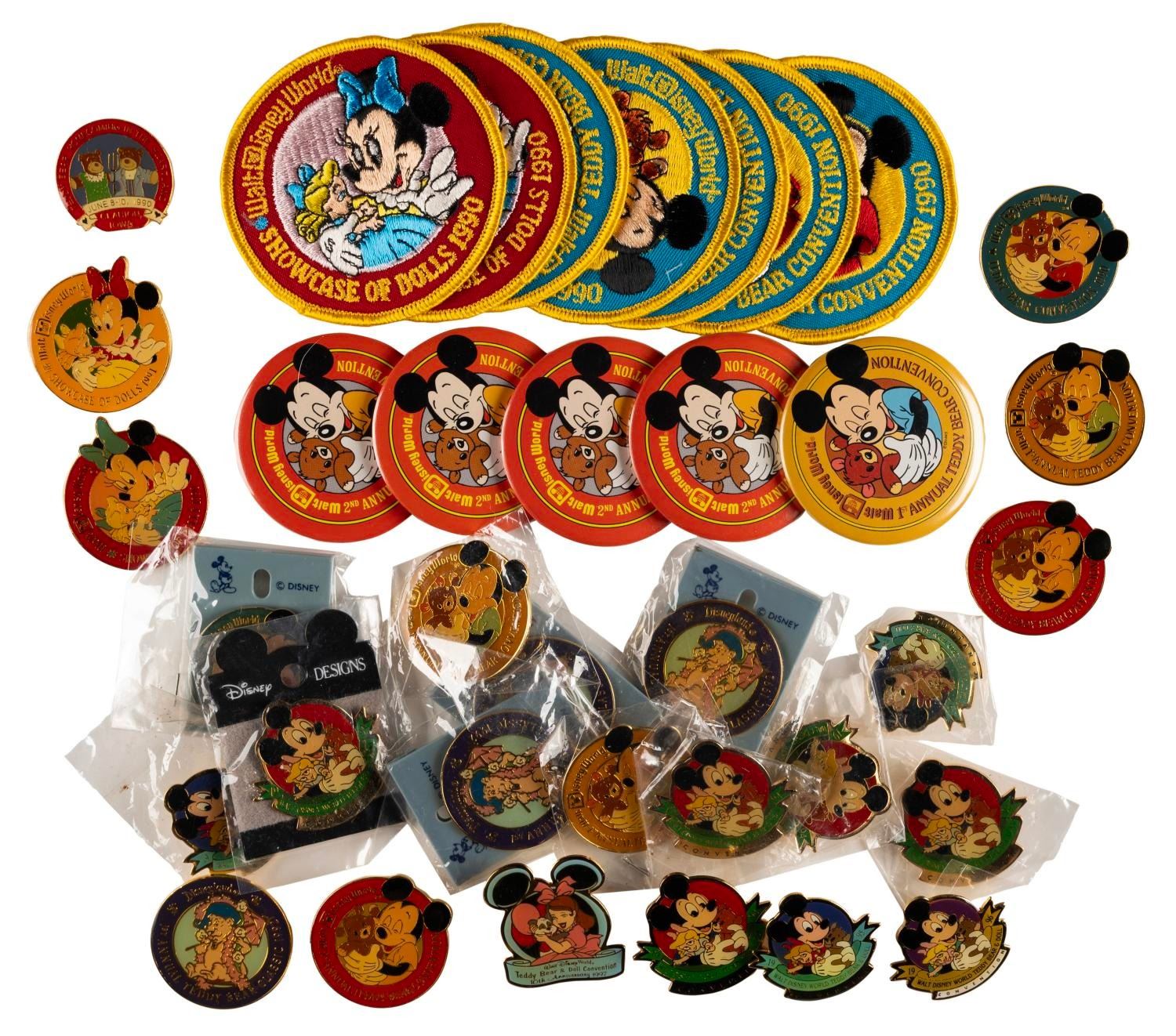 (Walt Disney World, 1990) A collection of buttons, pins, and patches from Walt Disney World's Annual Teddy Bear Convention. Included in this collection are six patches, five buttons, and 24 pins. Measuring between 1.5" and 3" in diameter, the pieces are in fine to very good condition with unopened pins, oxidization to the reverse of some buttons, and light surface scratching.