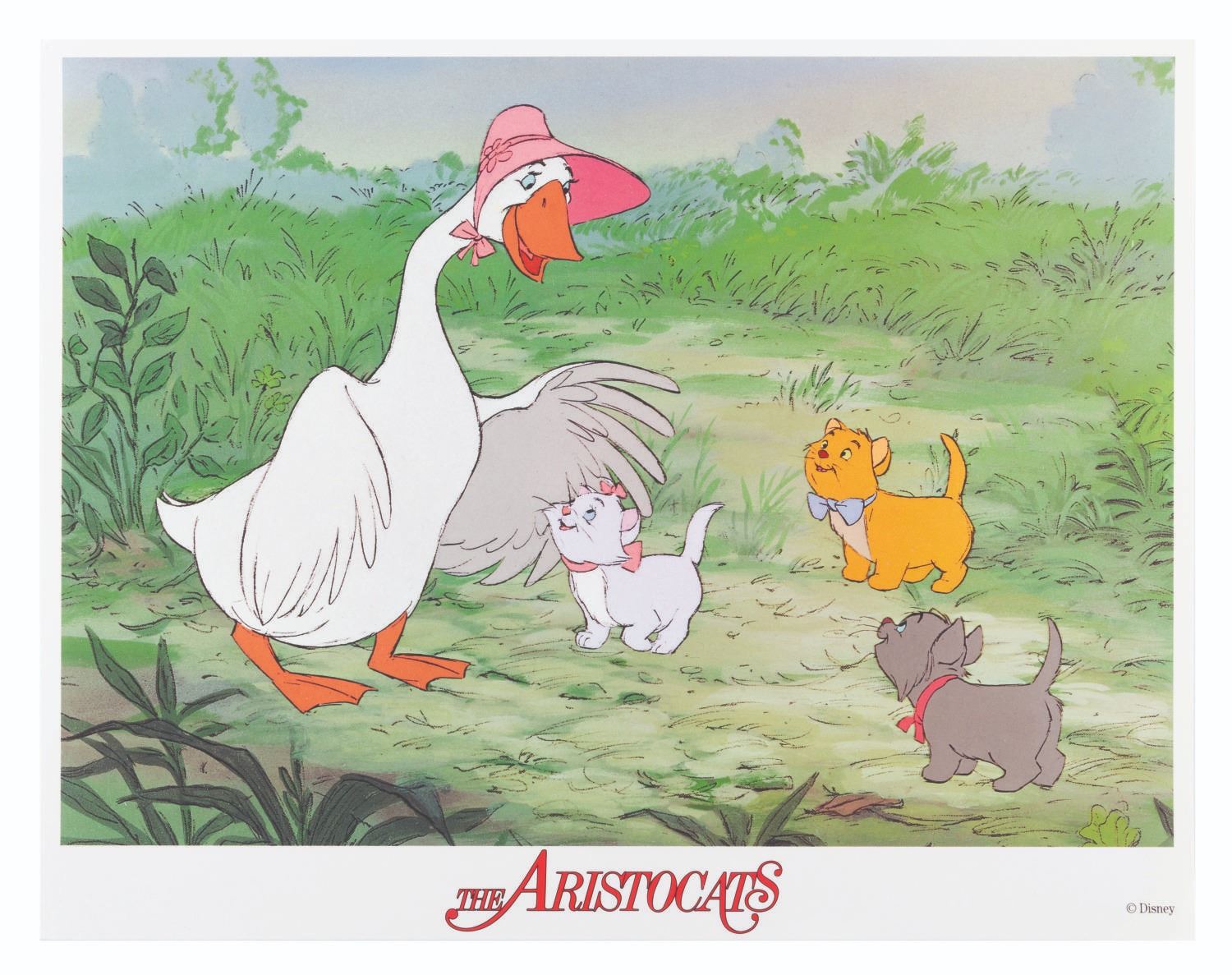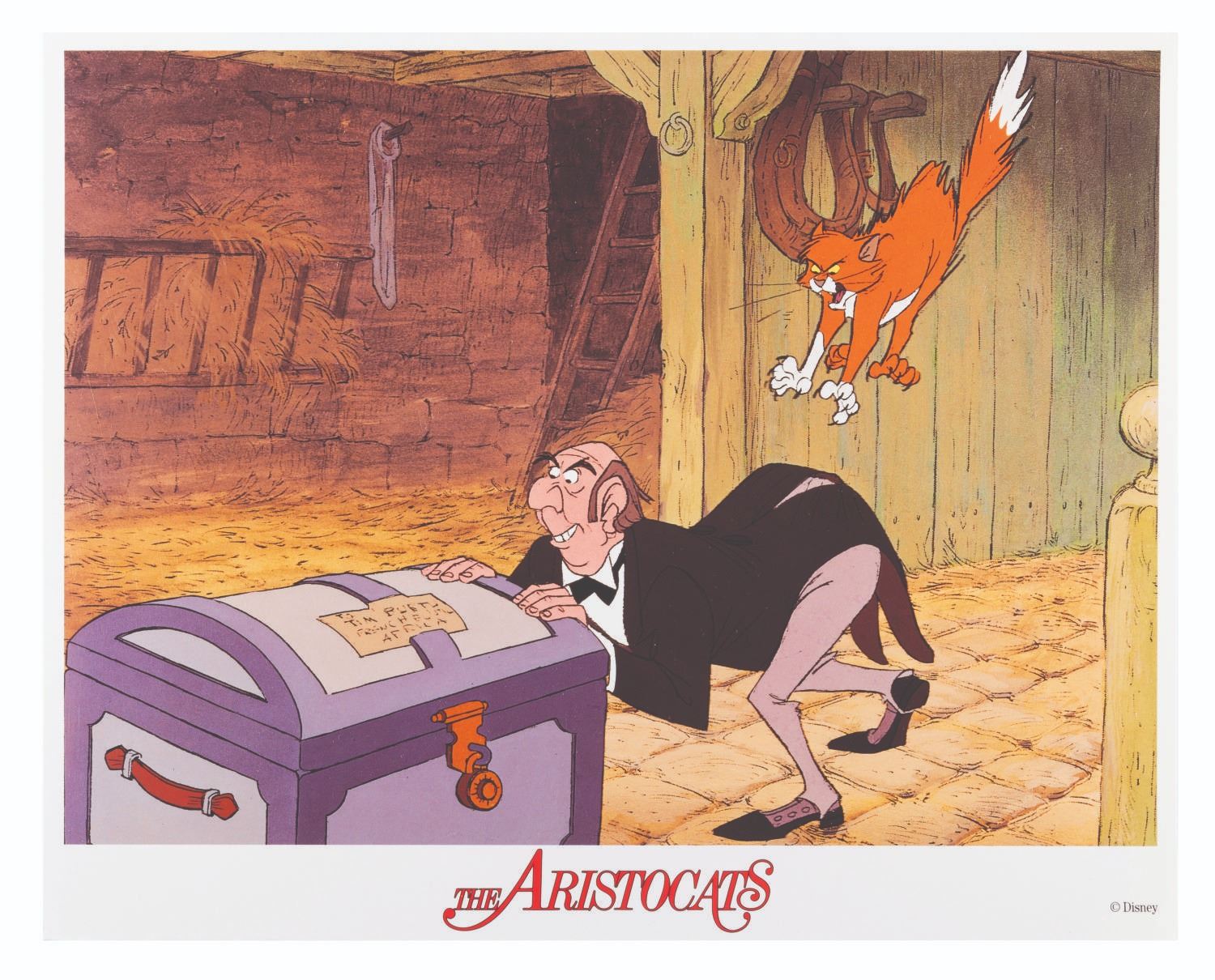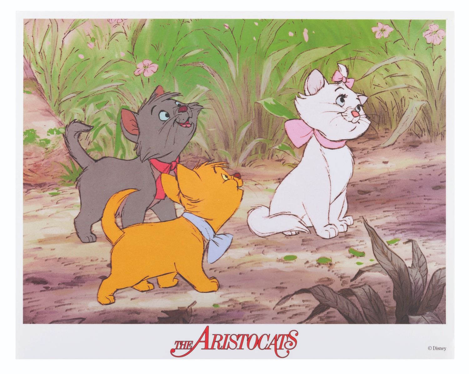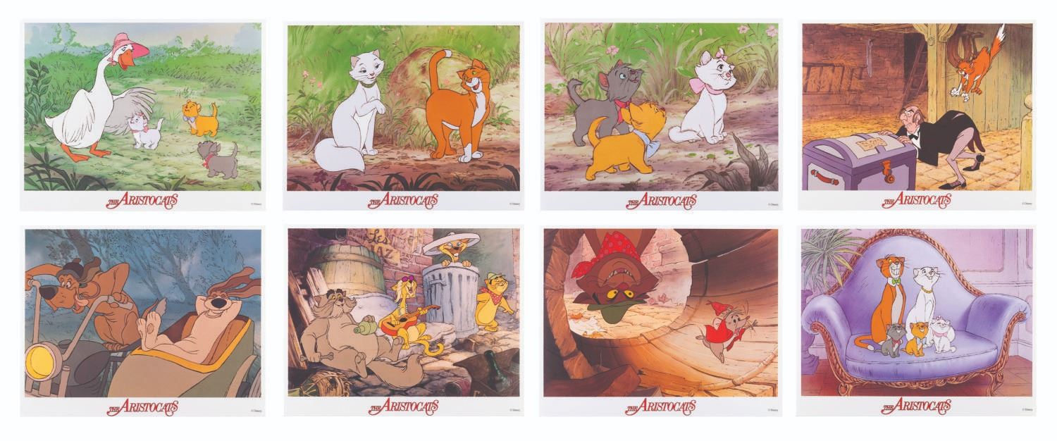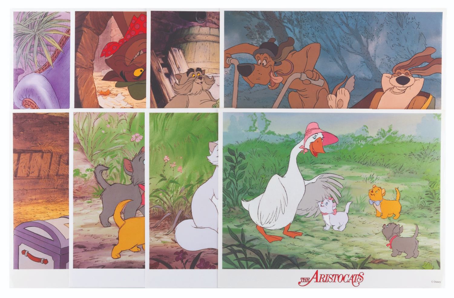 (Disney, 1970) A collection of eight original release lobby cards from “The Aristocats.” The 11” x 14” cards are all in very good condition with a very light crease to the lower right corner on each.