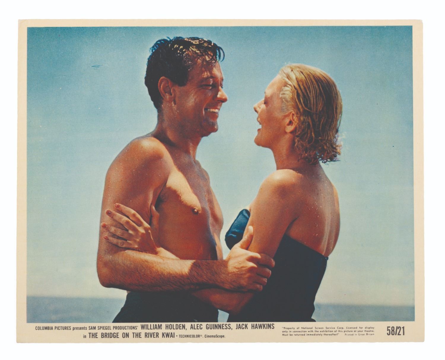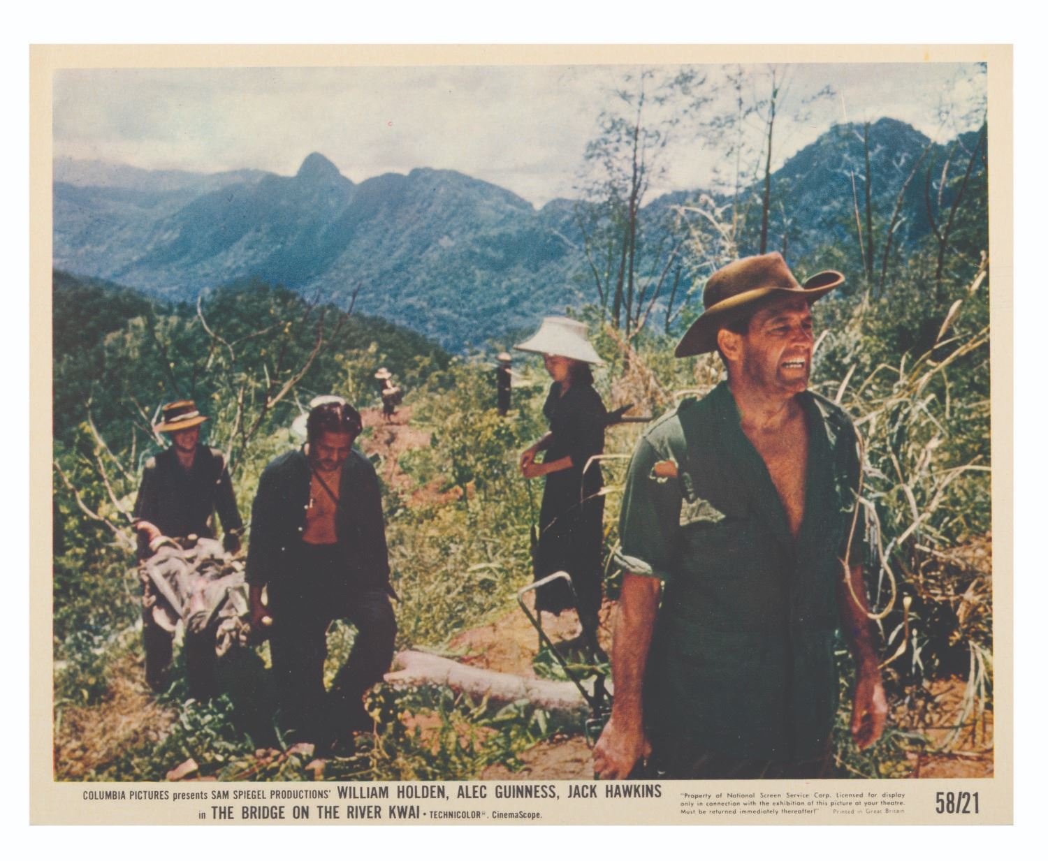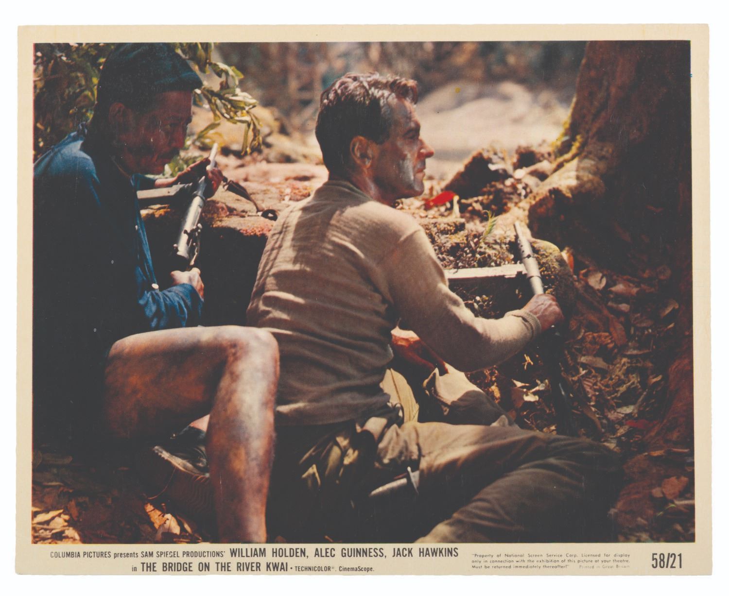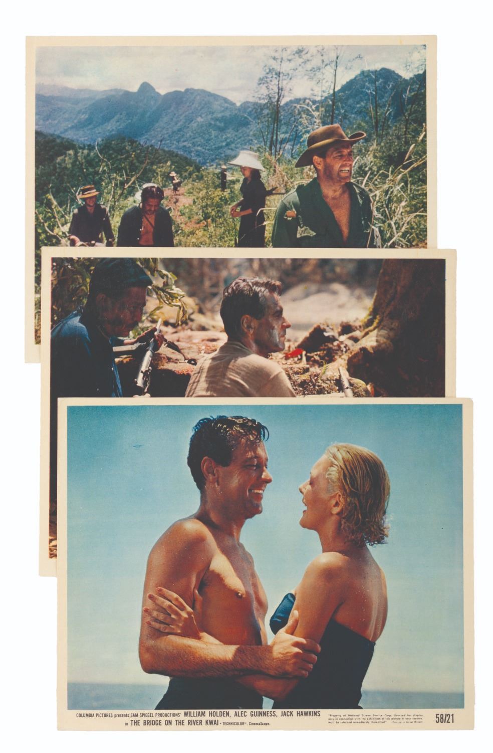 (Columbia, 1957) Three lobby cards for the epic war film "The Bridge Over the River Kwai," starring William Holden, Alec Guinness, and Jack Hawkins. Measuring 8" x 10", the photos are in very good condition with light discoloration, edge wear, and minimal scuffs.