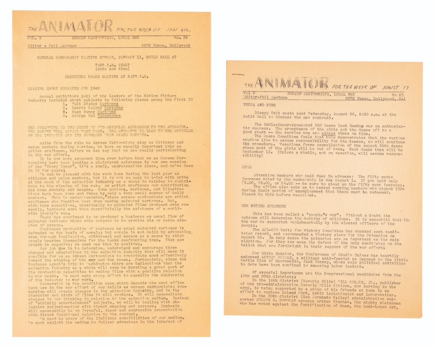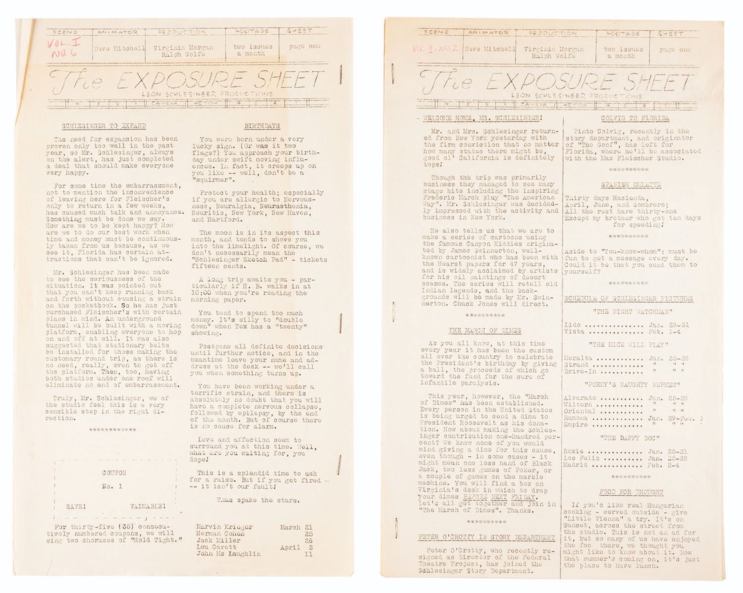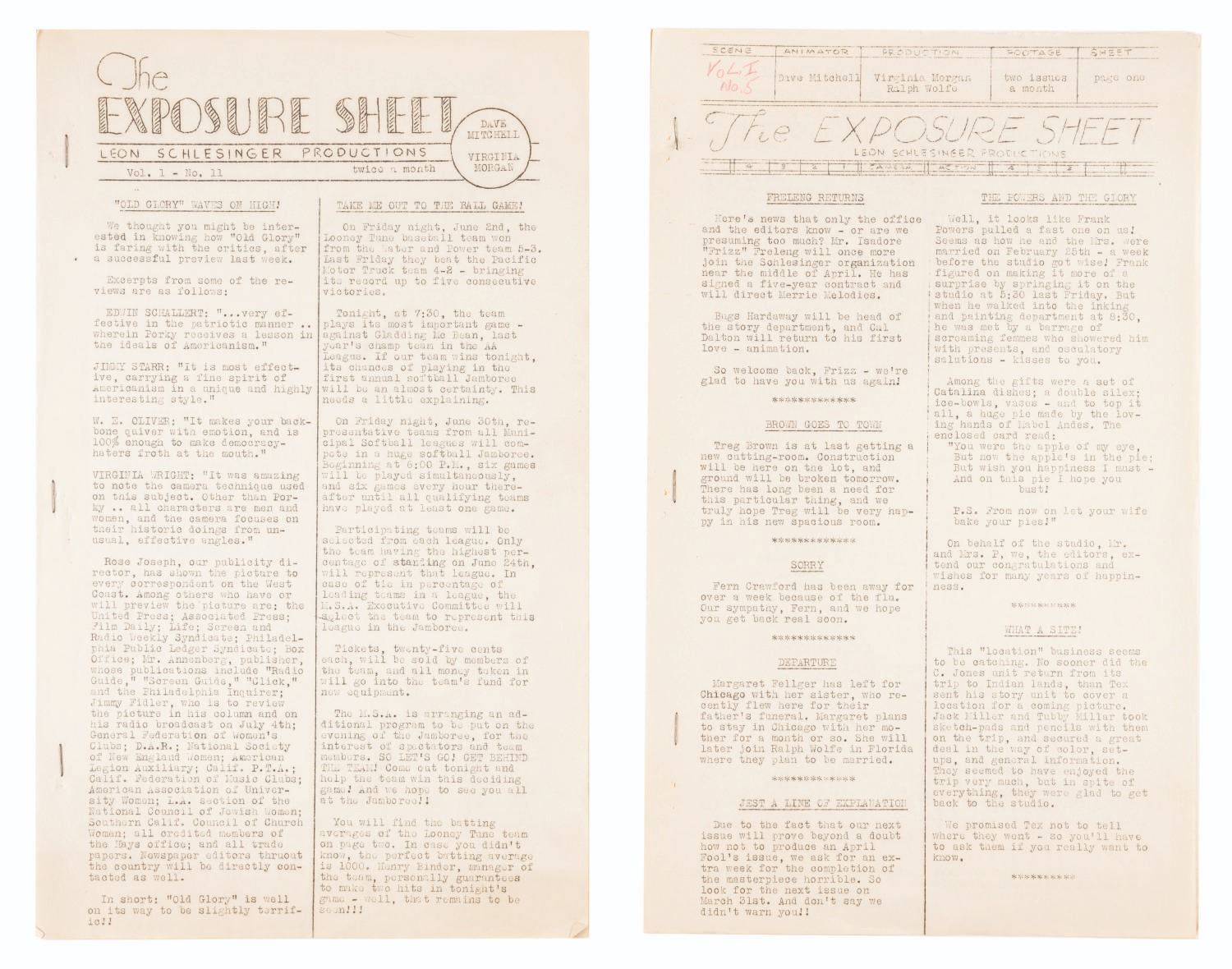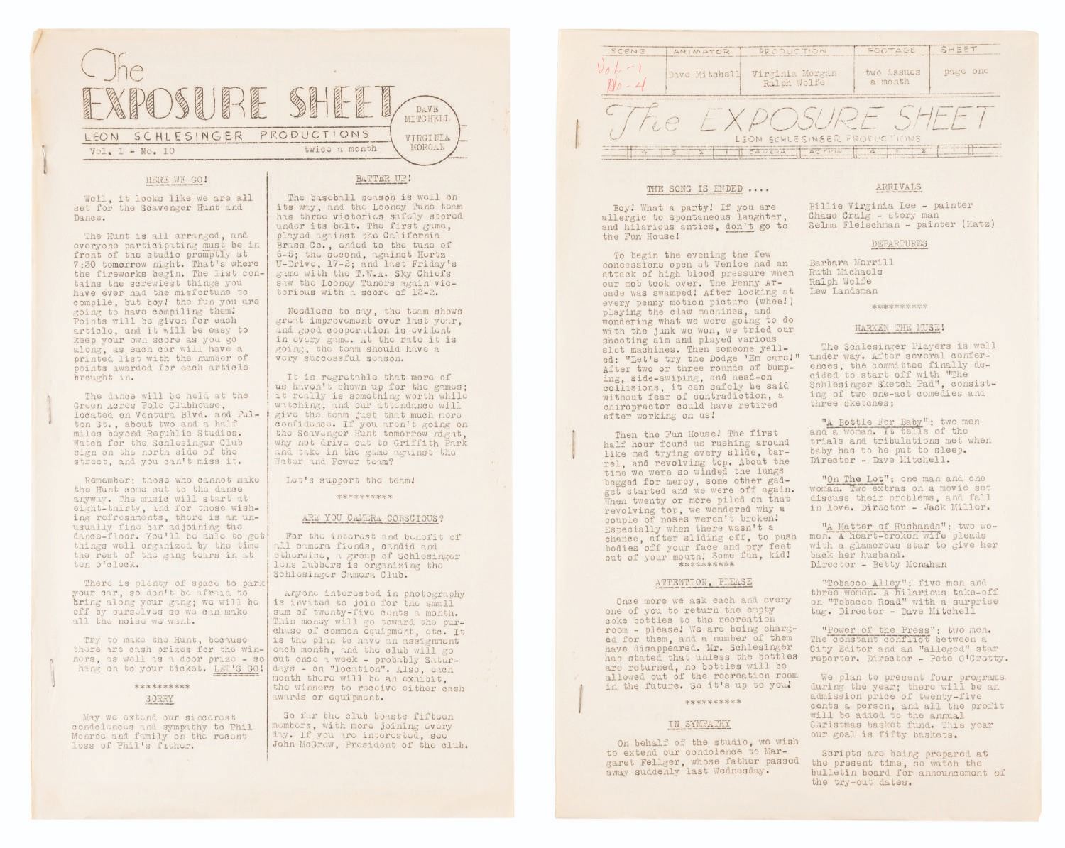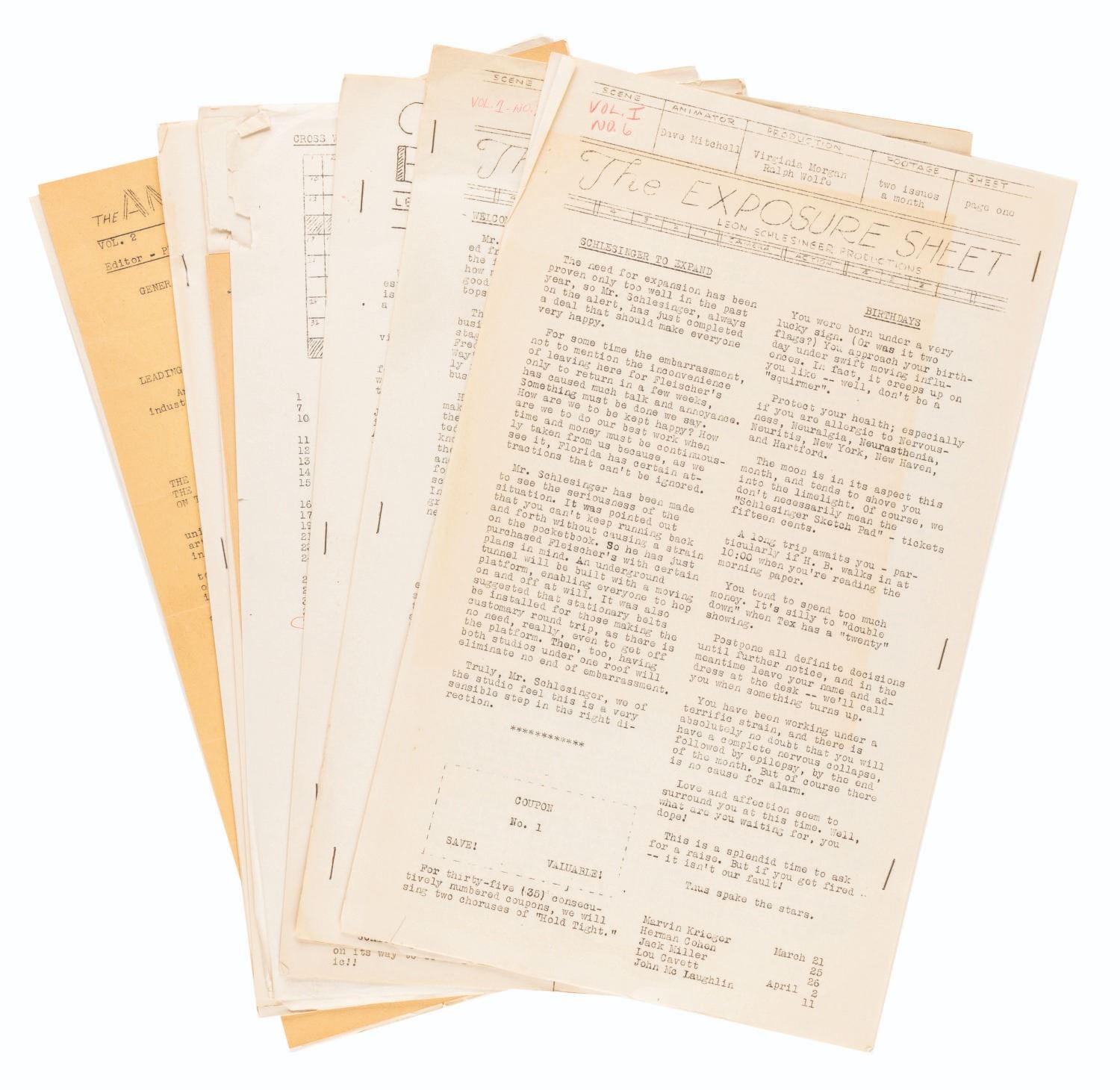 (Schlesinger, 1940s) A collection of seven issues of The Exposure Sheet, the official studio newsletter for Leon Schlesinger Productions, and two issues of The Animator, the weekly newsletter for the Screen Cartoonists Guild. The newsletters measure 14” x 8.5”, except for one copy of The Animator which measures 8.5” x 11”, and are all in good condition with edge wear, creases, and rips, and two pages have detached from one issue of The Exposure Sheet but are included.