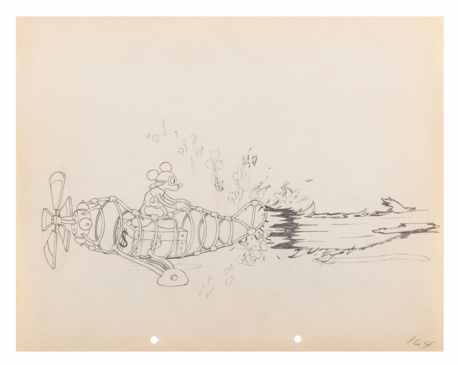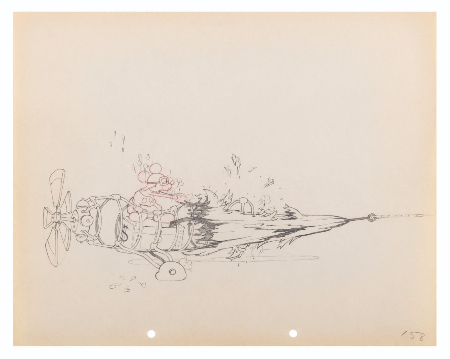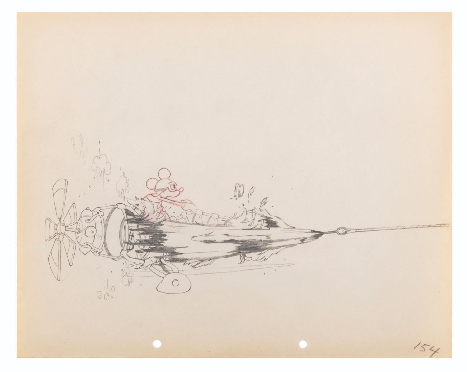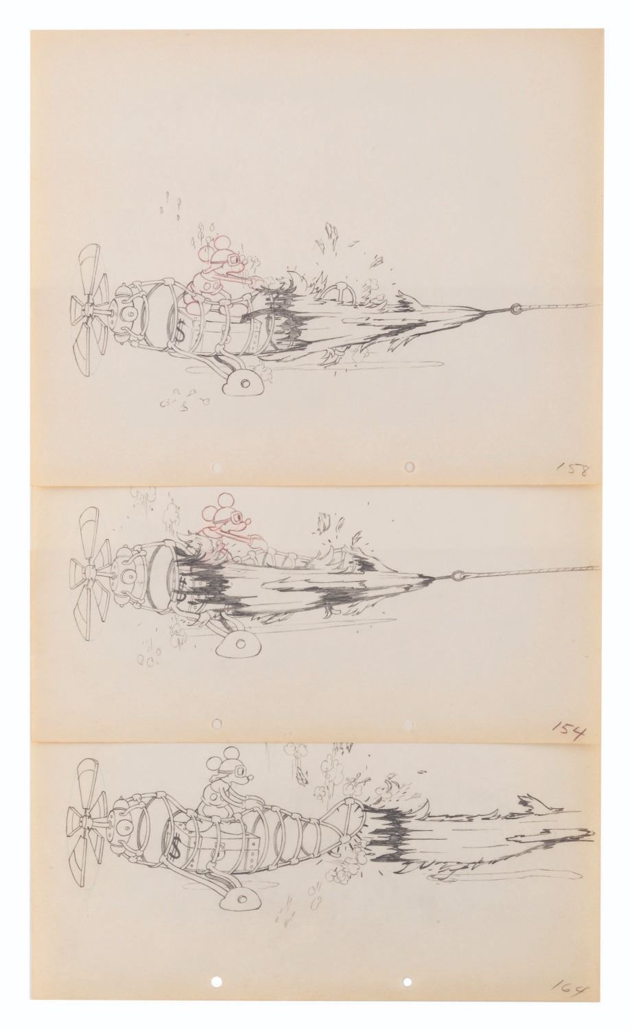 (Disney, 1933) A trio of original production drawings from the early Mickey Mouse short “The Mail Pilot.” Measuring 3.5” x 11” on 9.5” x 11” paper, the graphite and color pencil drawings display in very good production-used condition with light discoloration from age.