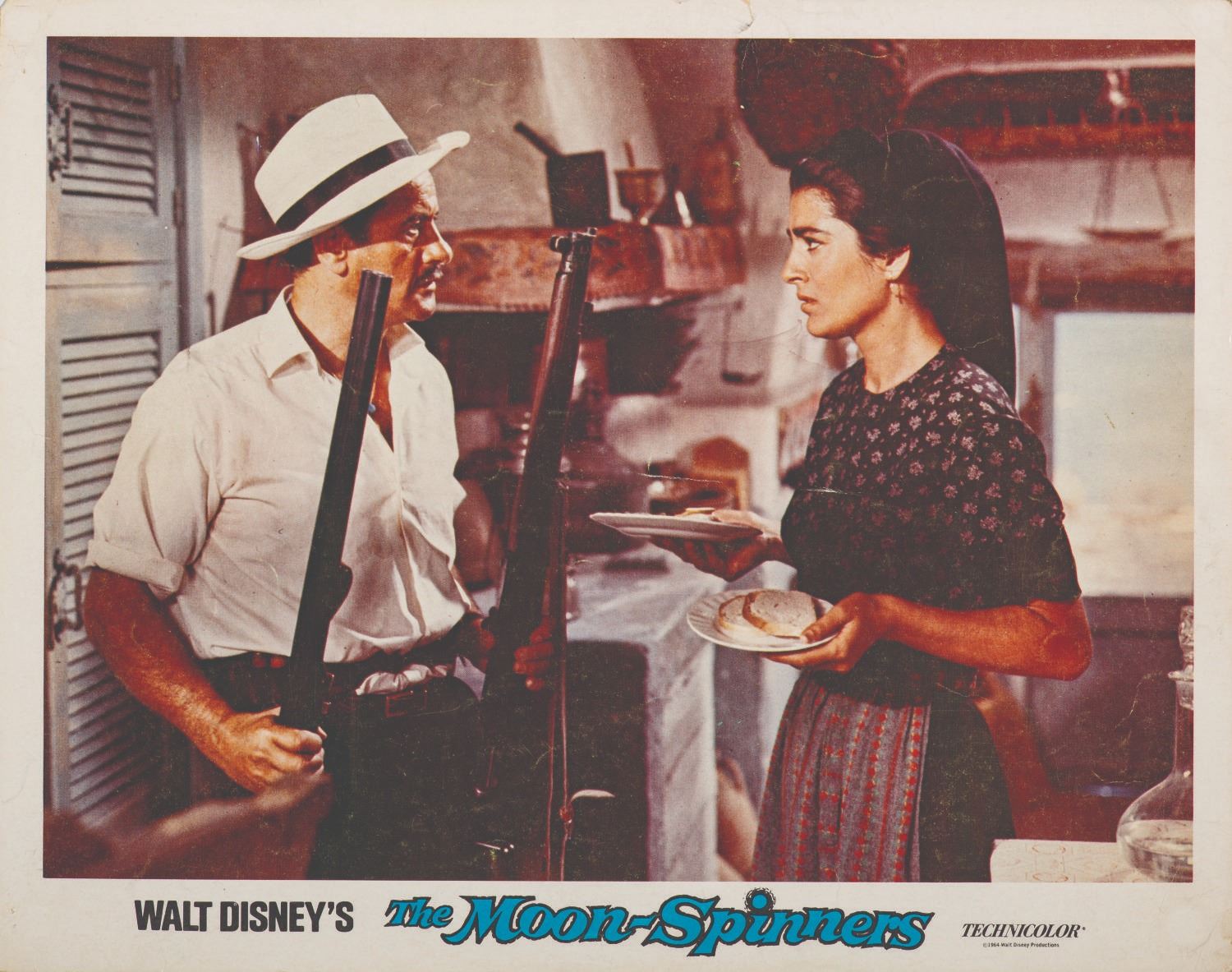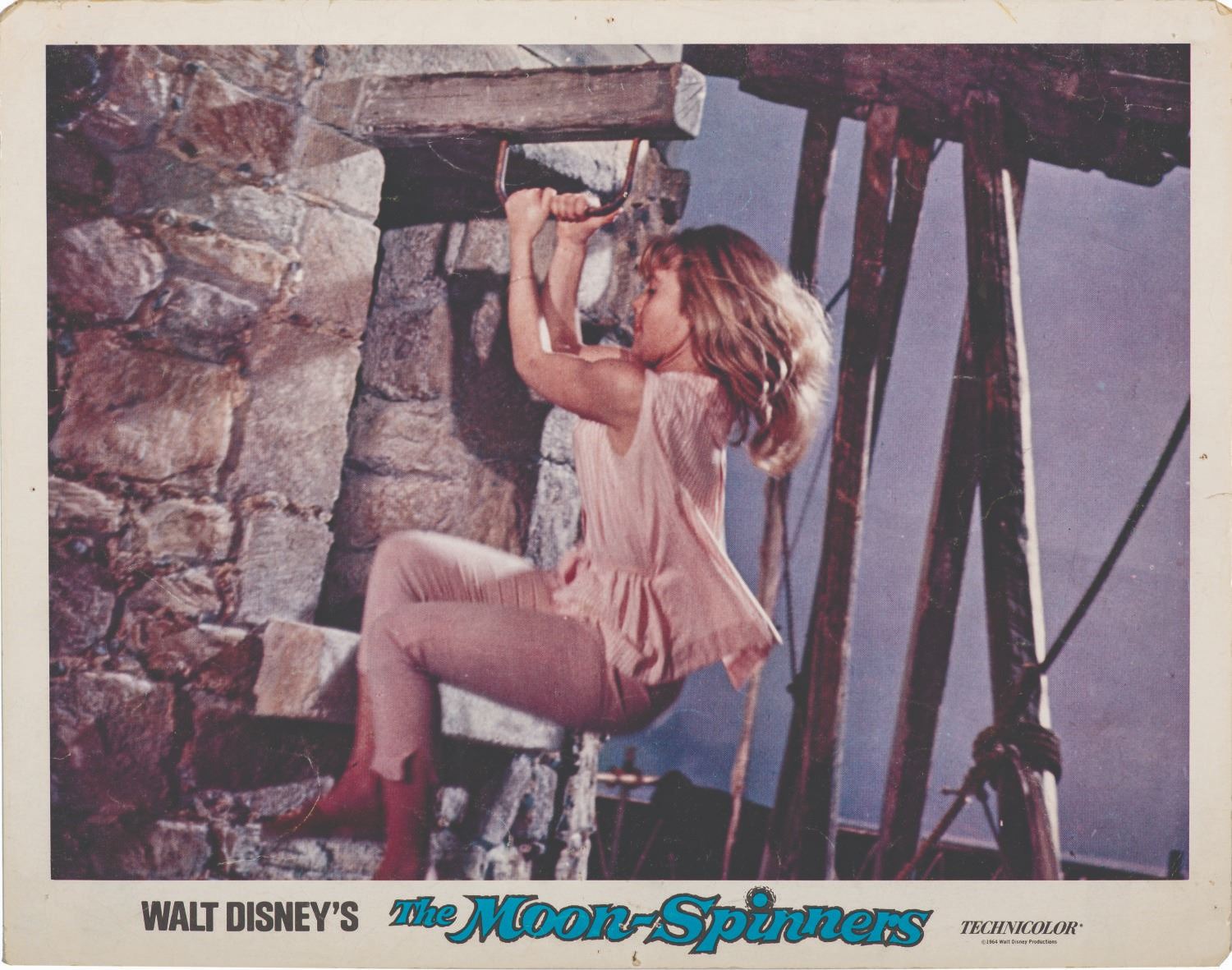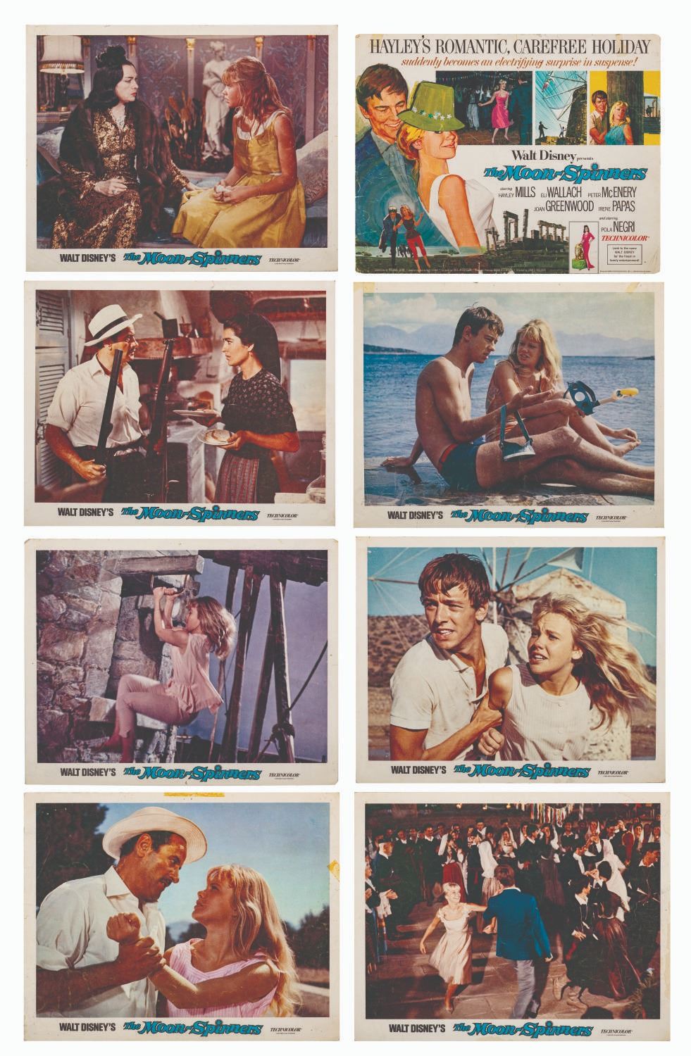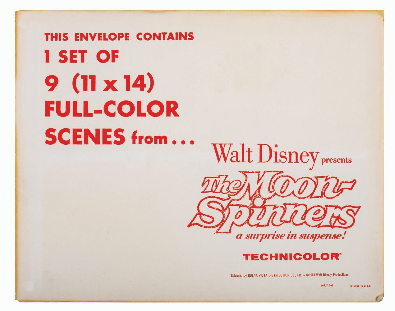 (Disney, 1964) A collection of 8 original release lobby cards for Walt Disney's 1964 film "The Moon Spinners." Measuring 11" x 14", the cards including the original envelope are in good condition, with edge wear, creases, and adhesive tape on the reverse.