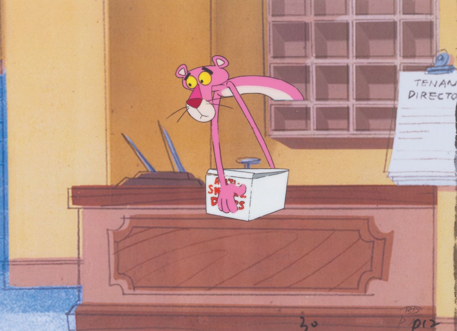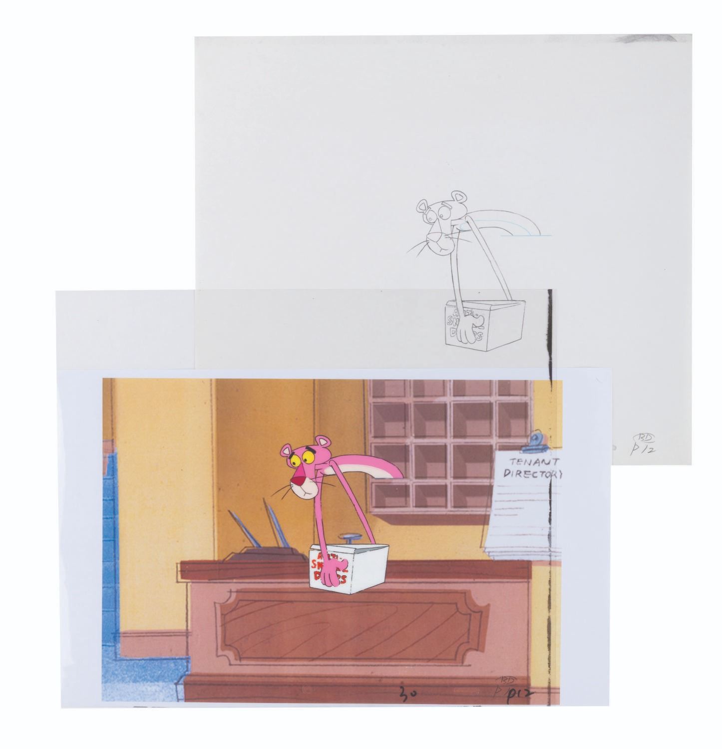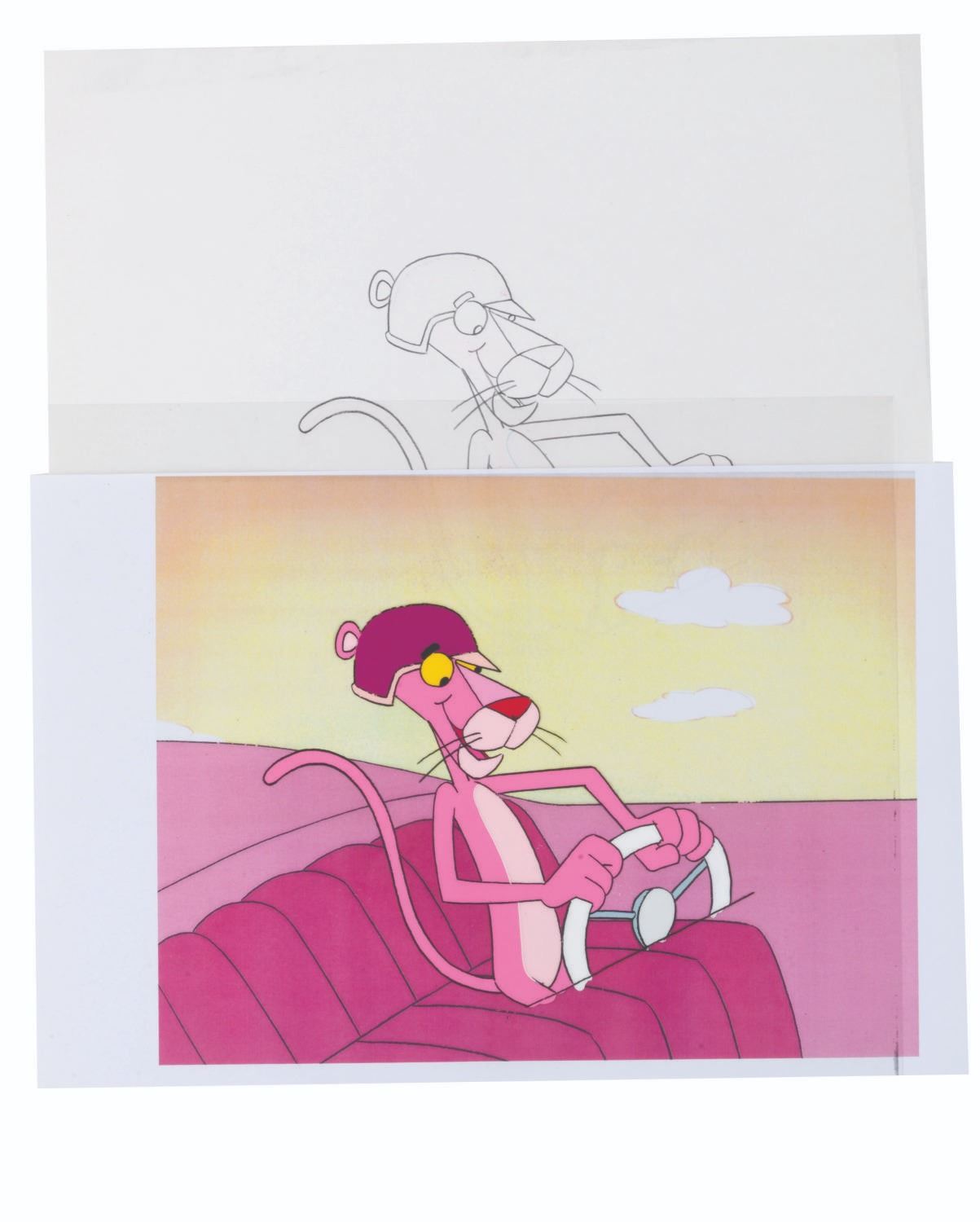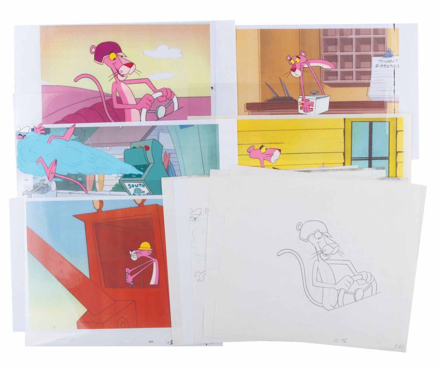(MGM Animation, 1993) A collection of five original production cels and five drawings from “The Pink Panther” 1993 TV series. Measuring 10.5” x 12.5” each, the cels and drawings are in good to very good condition with light wear from production use and light spots of paint residue and line loss. The cels have been paired with color copy backgrounds for presentation purposes.