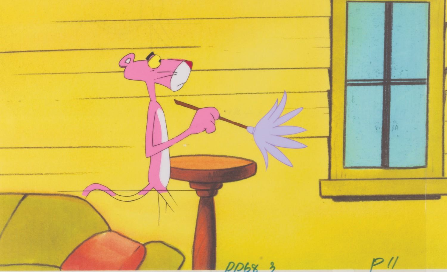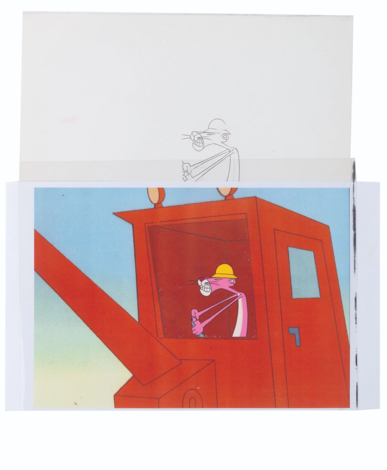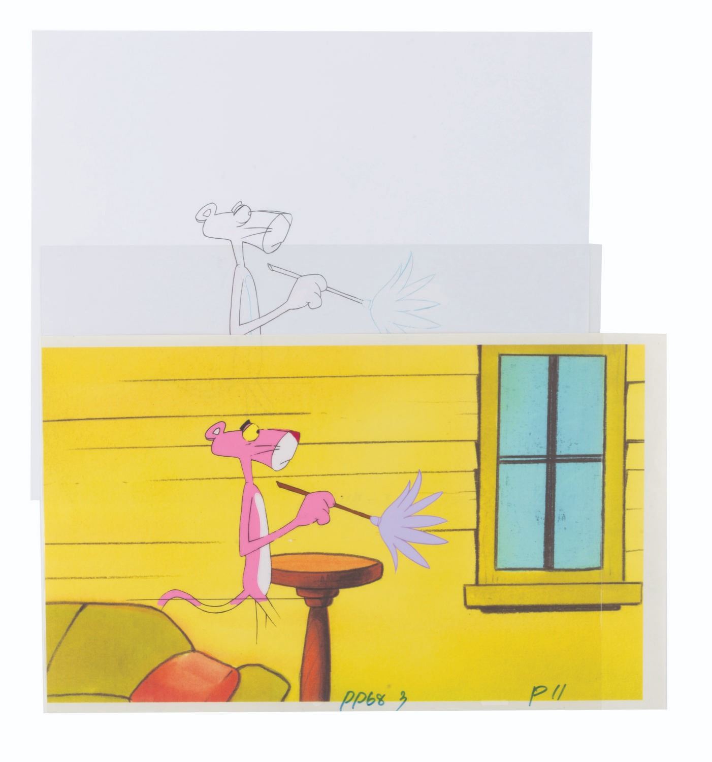 (MGM Animation, 1993) A collection of five original production cels and five drawings from “The Pink Panther” 1993 TV series. Measuring 10.5” x 12.5” each, the cels and drawings are in good to very good condition with light wear from production use and light spots of paint residue and line loss. The cels have been paired with color copy backgrounds for presentation purposes.