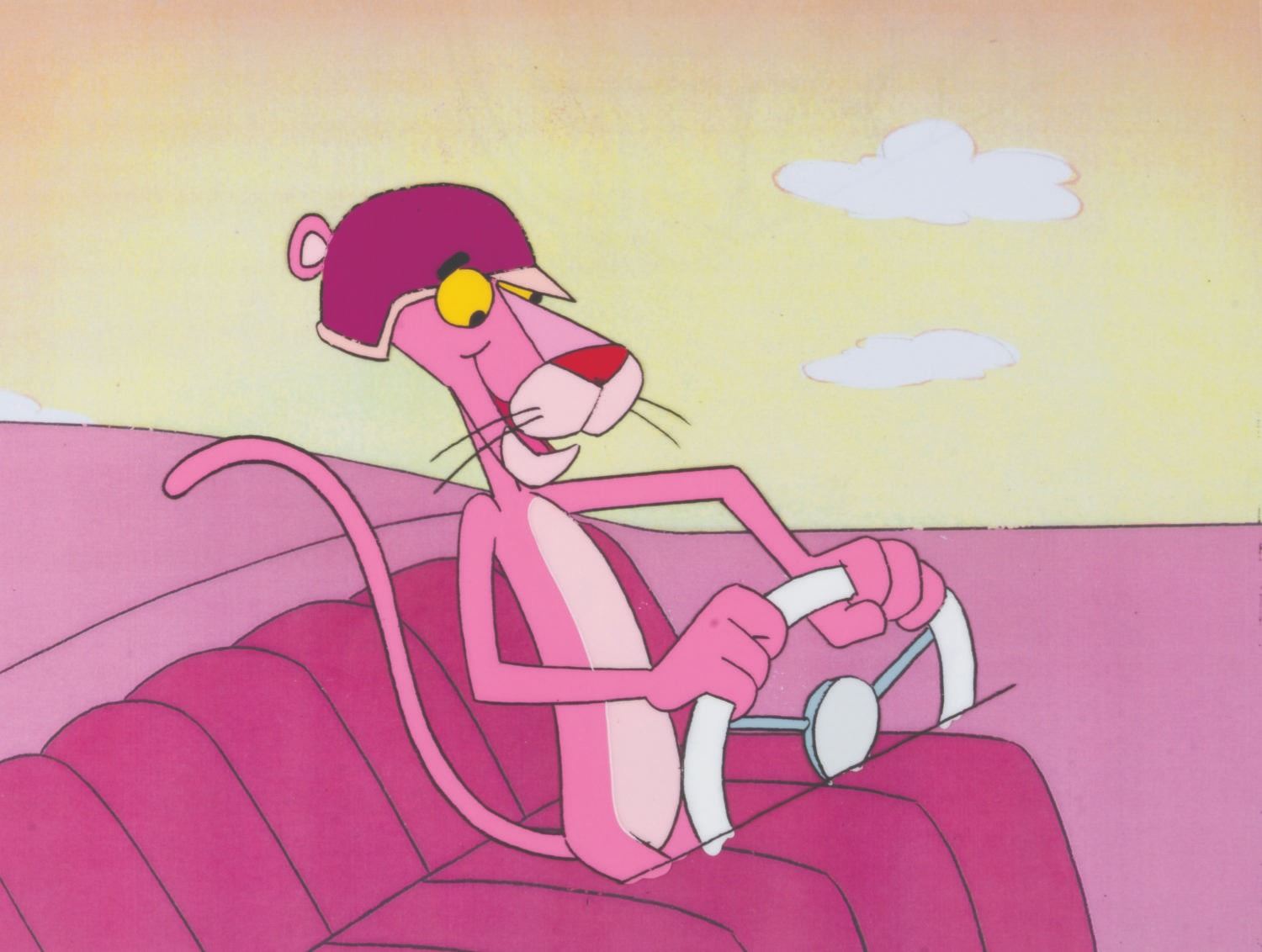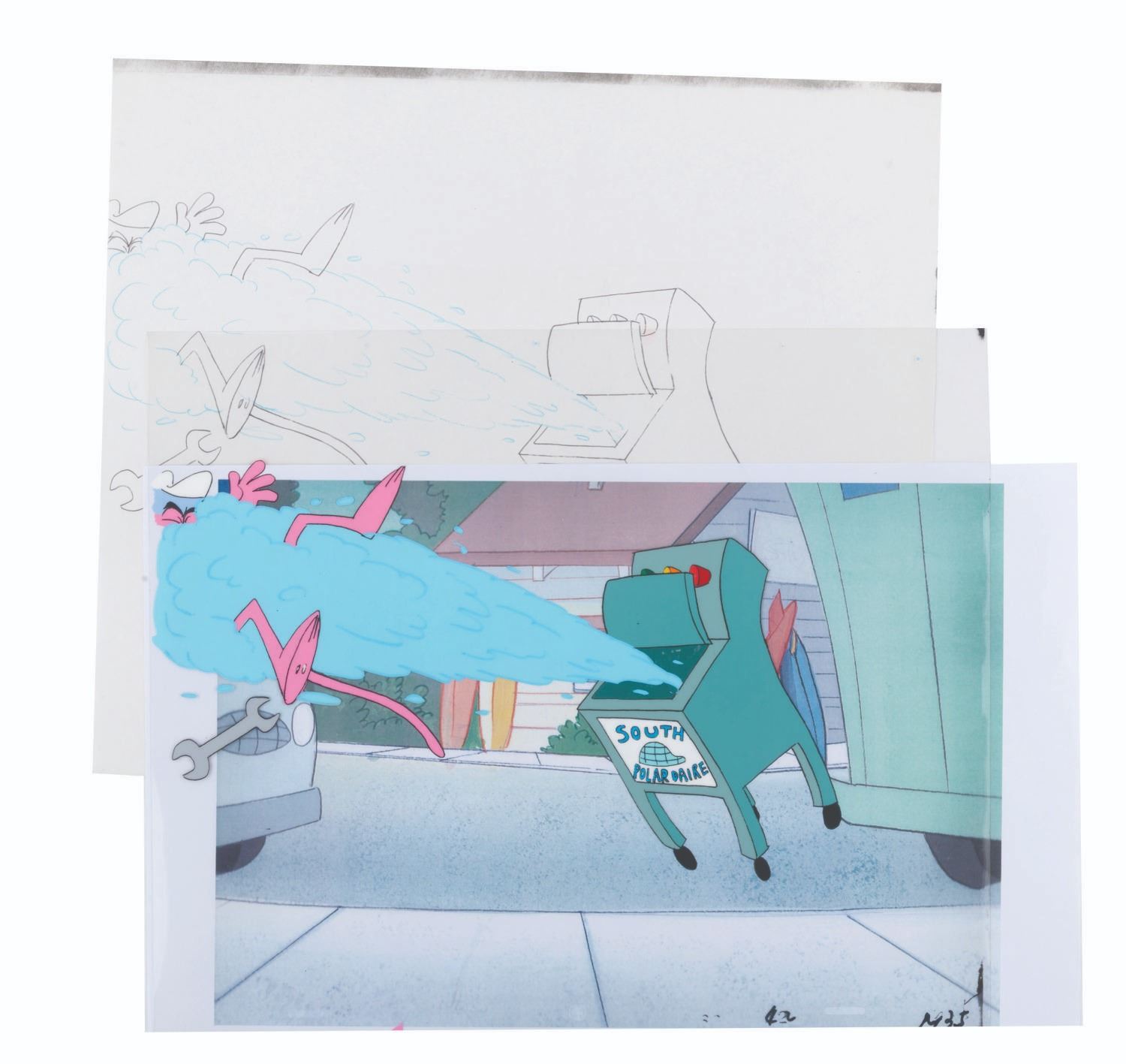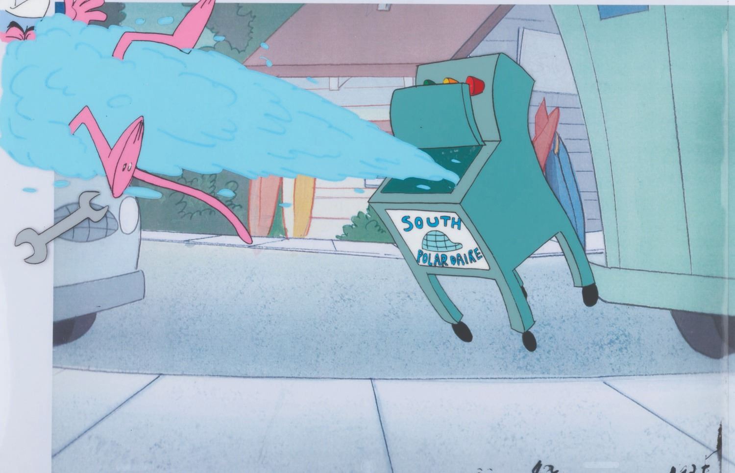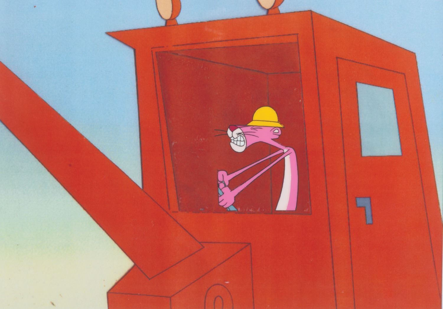 (MGM Animation, 1993) A collection of five original production cels and five drawings from “The Pink Panther” 1993 TV series. Measuring 10.5” x 12.5” each, the cels and drawings are in good to very good condition with light wear from production use and light spots of paint residue and line loss. The cels have been paired with color copy backgrounds for presentation purposes.