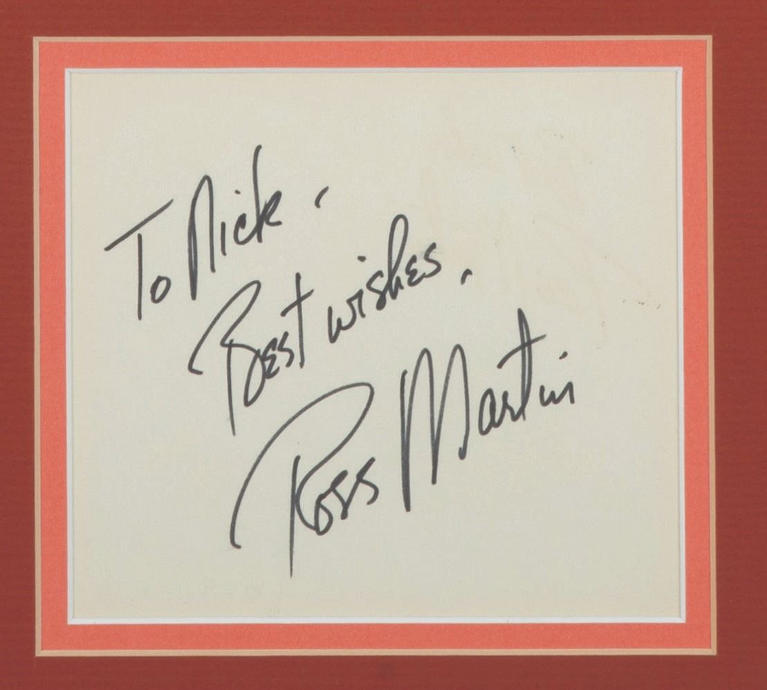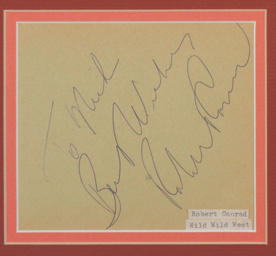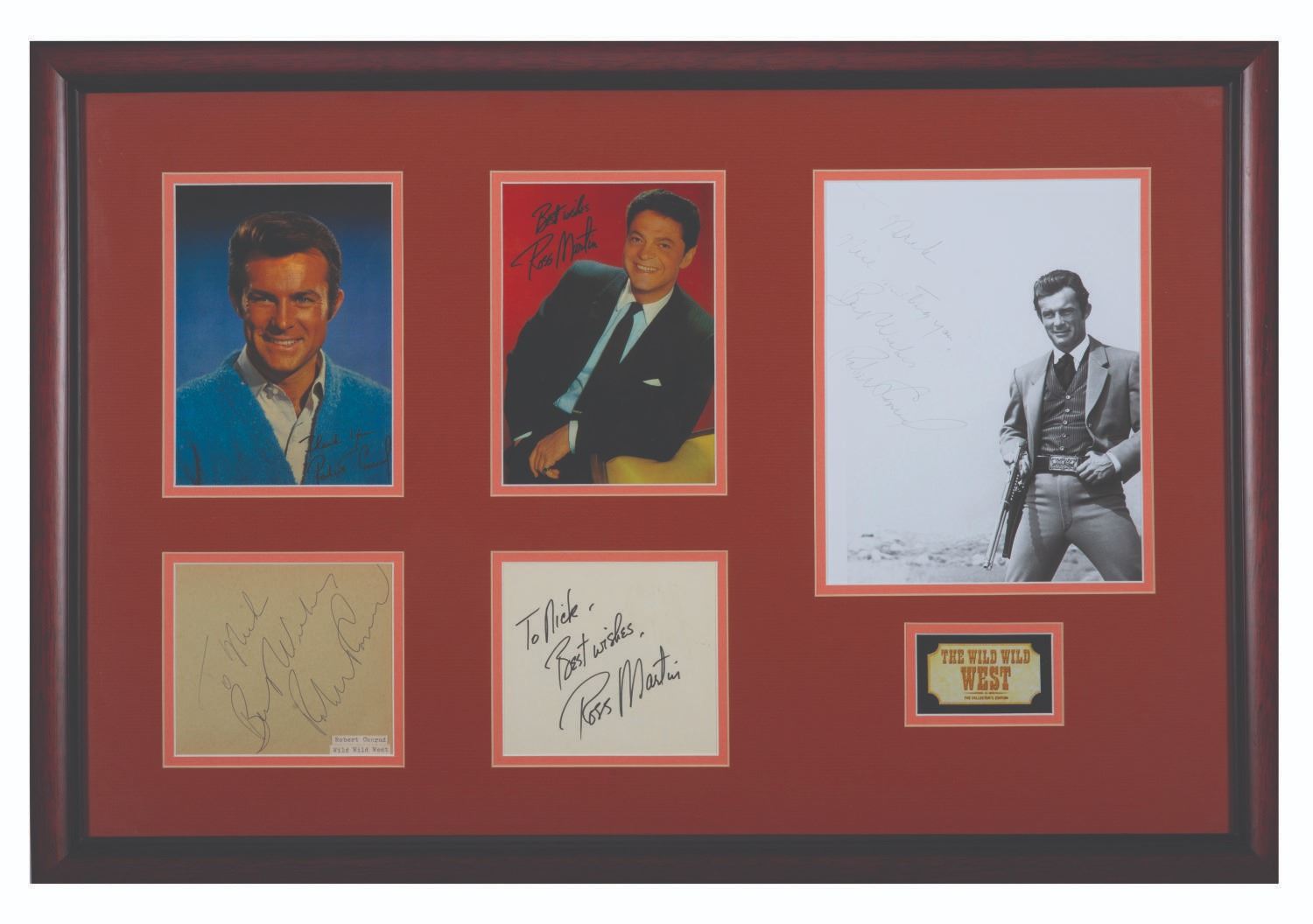 (CBS Productions, 1965) A collection of signatures from the stars of"The Wild, Wild West." Included are a signed photograph of Robert Conrad as James West, and an autograph on paper from both Conrad and his costar Ross Martin, for a total of (3) signatures, each with dedication. The pieces are matted and framed with a pair of portraits of Conrad and Martin with preprinted signatures. The pieces measure between 5"x4.5" and 8"x10", all in very good condition in the 19"x28" frame.