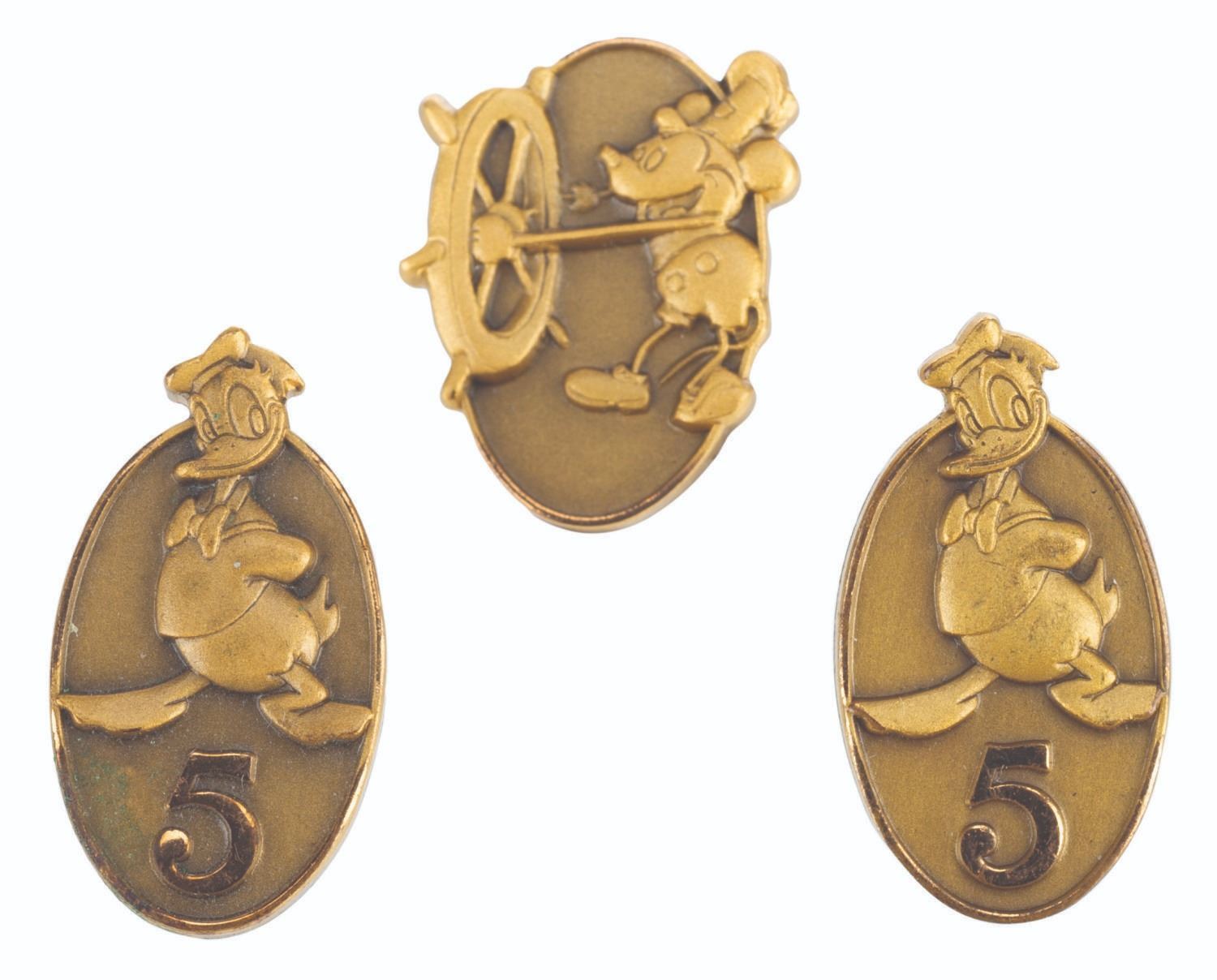 (Disneyland, 1980s-2000s) A collection of three Disneyland Cast Member service award pins. Included are two Donald Duck 5-year anniversary pins and a 1-year Mickey Mouse Steamboat Willie pin. Measuring approximately .75" x .5", the pins are in good-to-very good condition, with light wear to each from use.