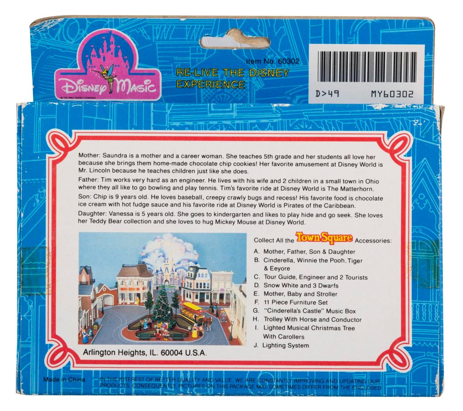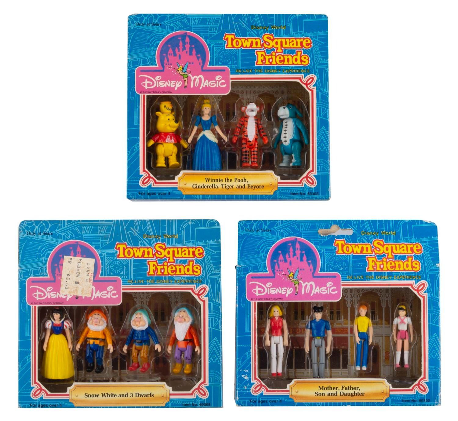 (Sears, 1980s-90s) Three Disney Magic Walt Disney World Town Square Friends sets. Included are sets with Snow White and 3 Dwarfs, Winnie the Pooh with Cinderella, "Tiger," and Eeyore, and a Mother, Father, Son, and Daughter. The figures are in presumed fine condition in their original 6.5" x 1.25" x 6" boxes, in fair condition with heavy edge wear and tape.