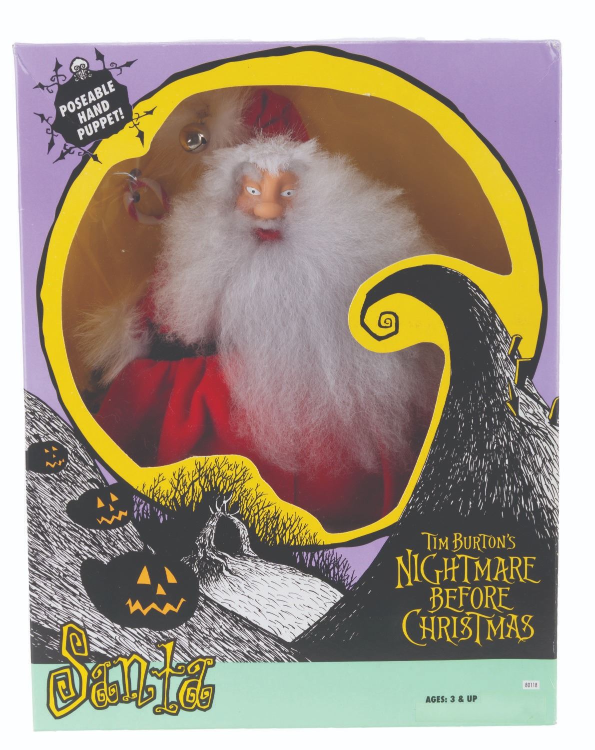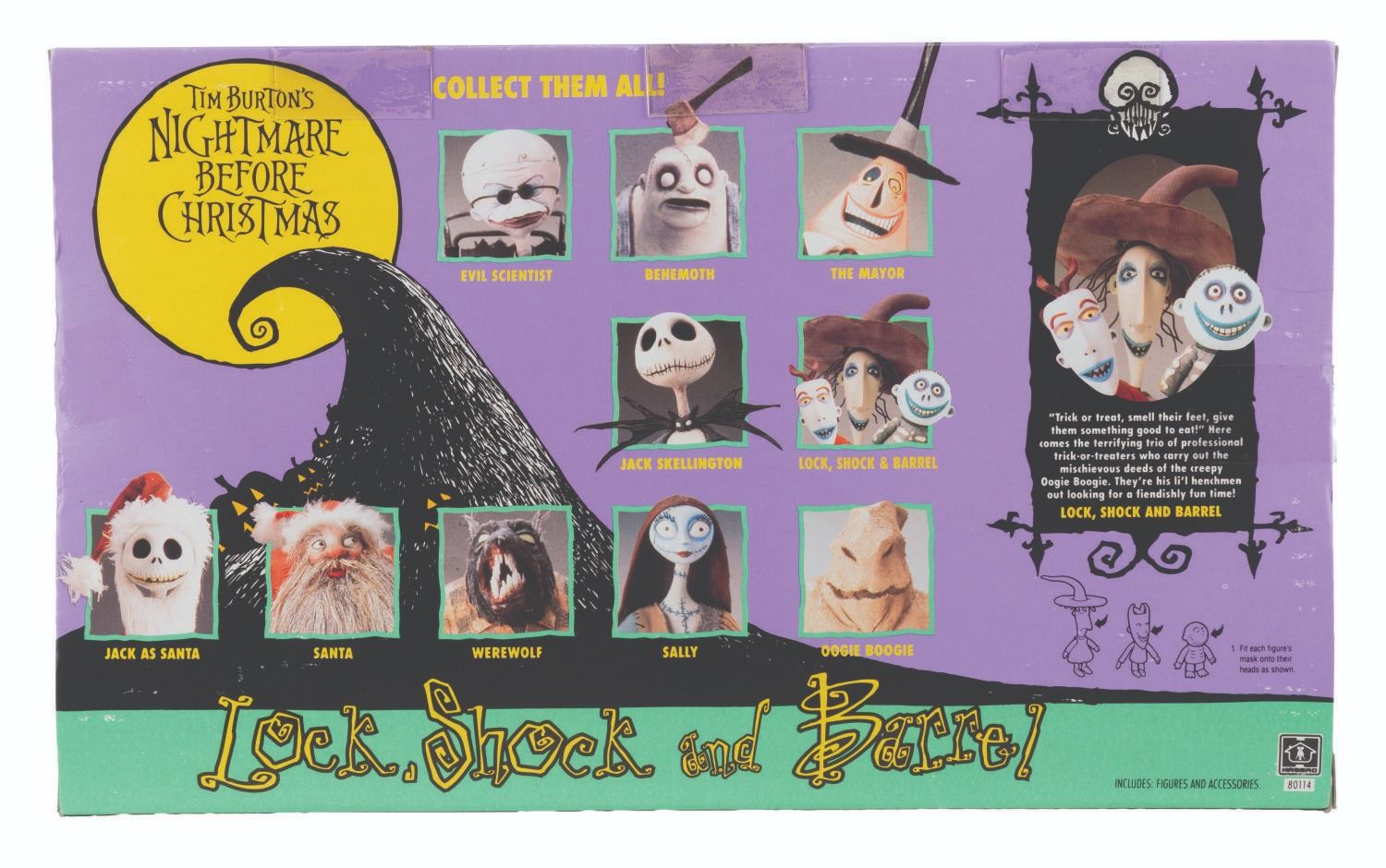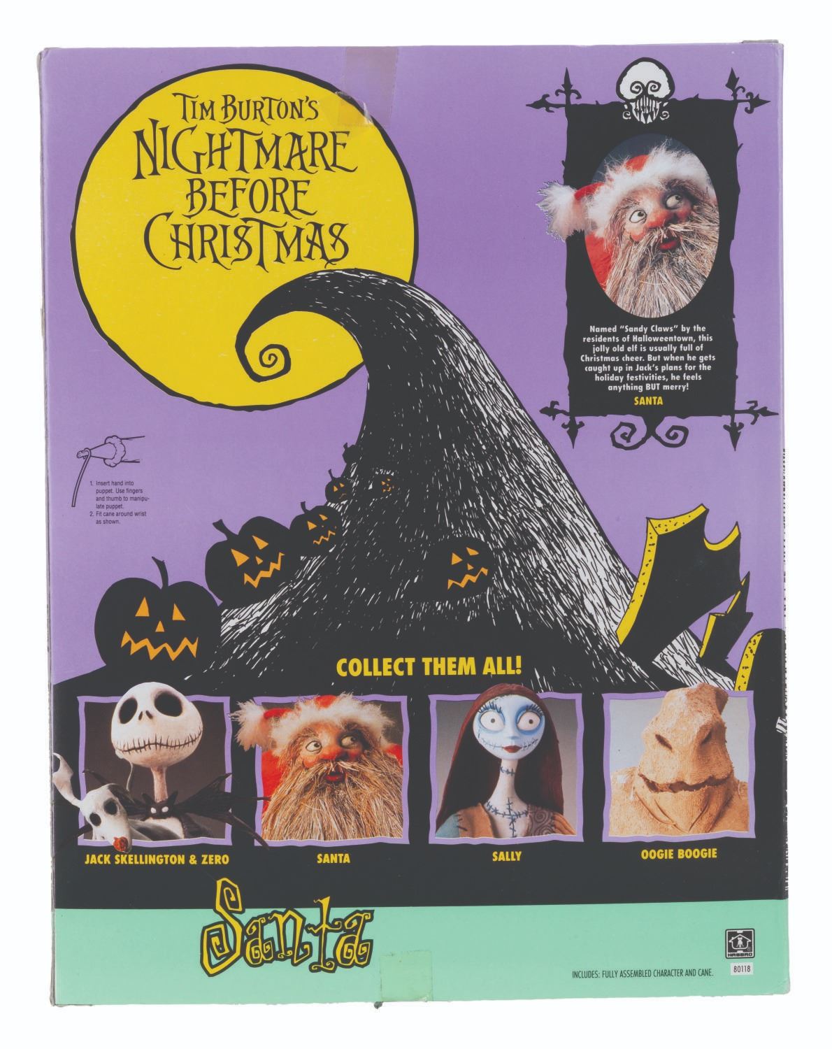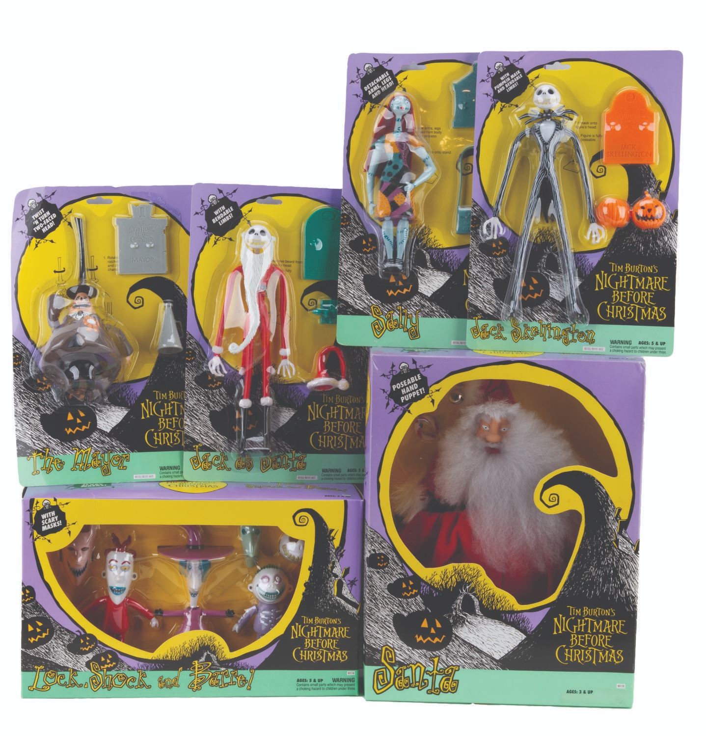 (NECA, 1993) A collection of six "Tim Burton’s The Nightmare Before Christmas" toys. Included are figurines of Jack Skellington, Jack as Santa, Sally, and The Mayor, each sealed with two accessories, a Santa poseable hand puppet, and a Lock, Stock, and Barrel figurine set, also in their original boxes. Measuring 7.75" x 11.5" to 3" x 10" x 13", the collection is in very good condition with wear to the original packaging, including creasing, folds, edge wear, bends, scuffs, and scratches.