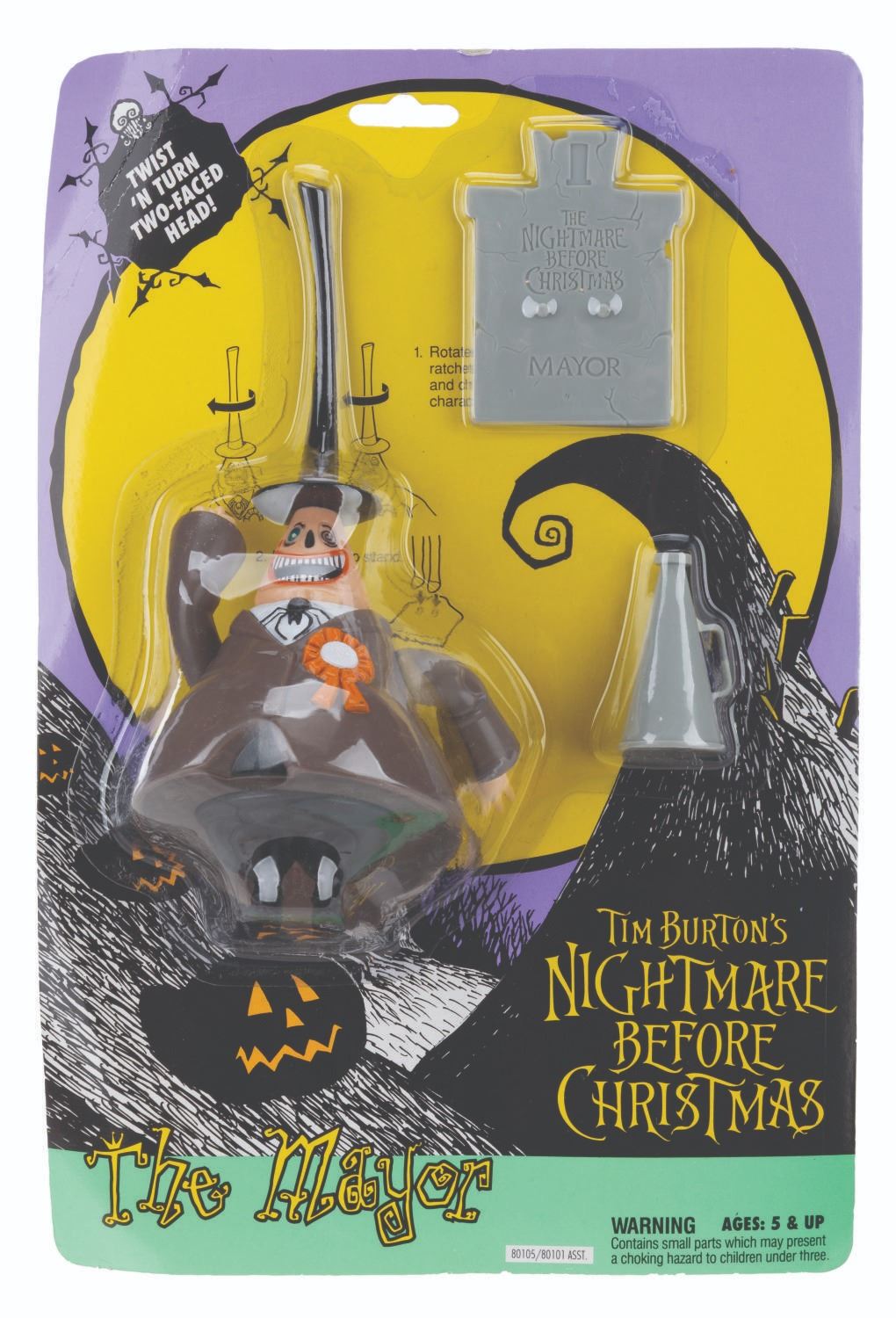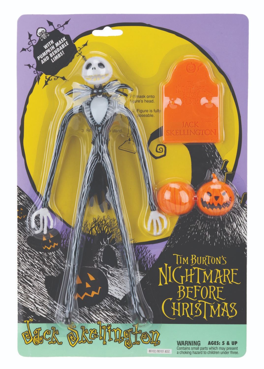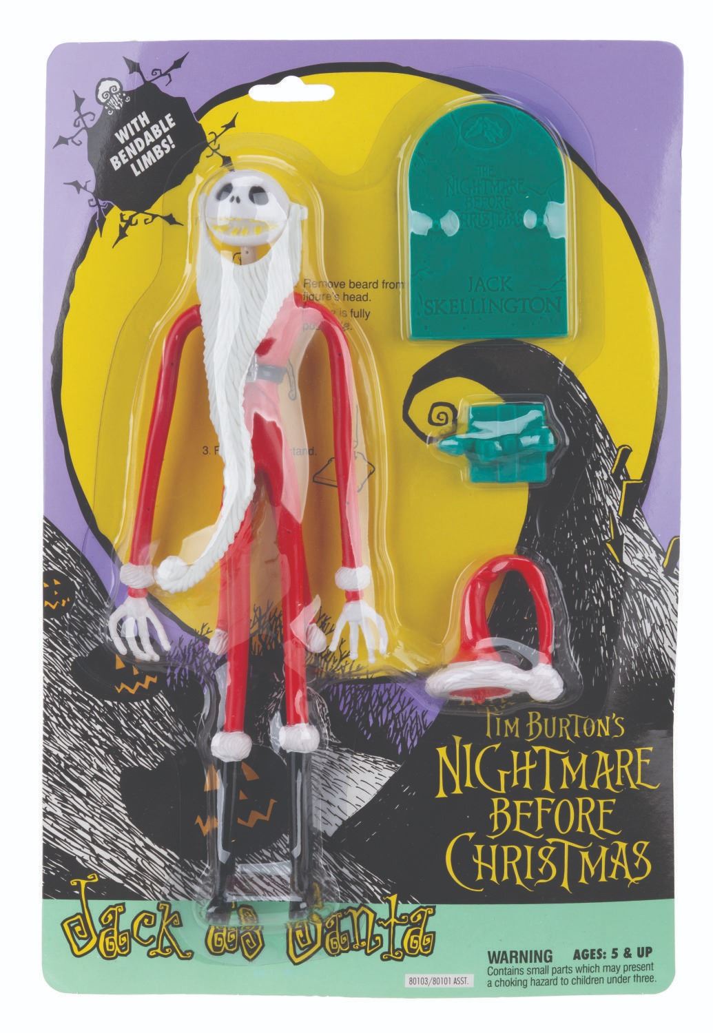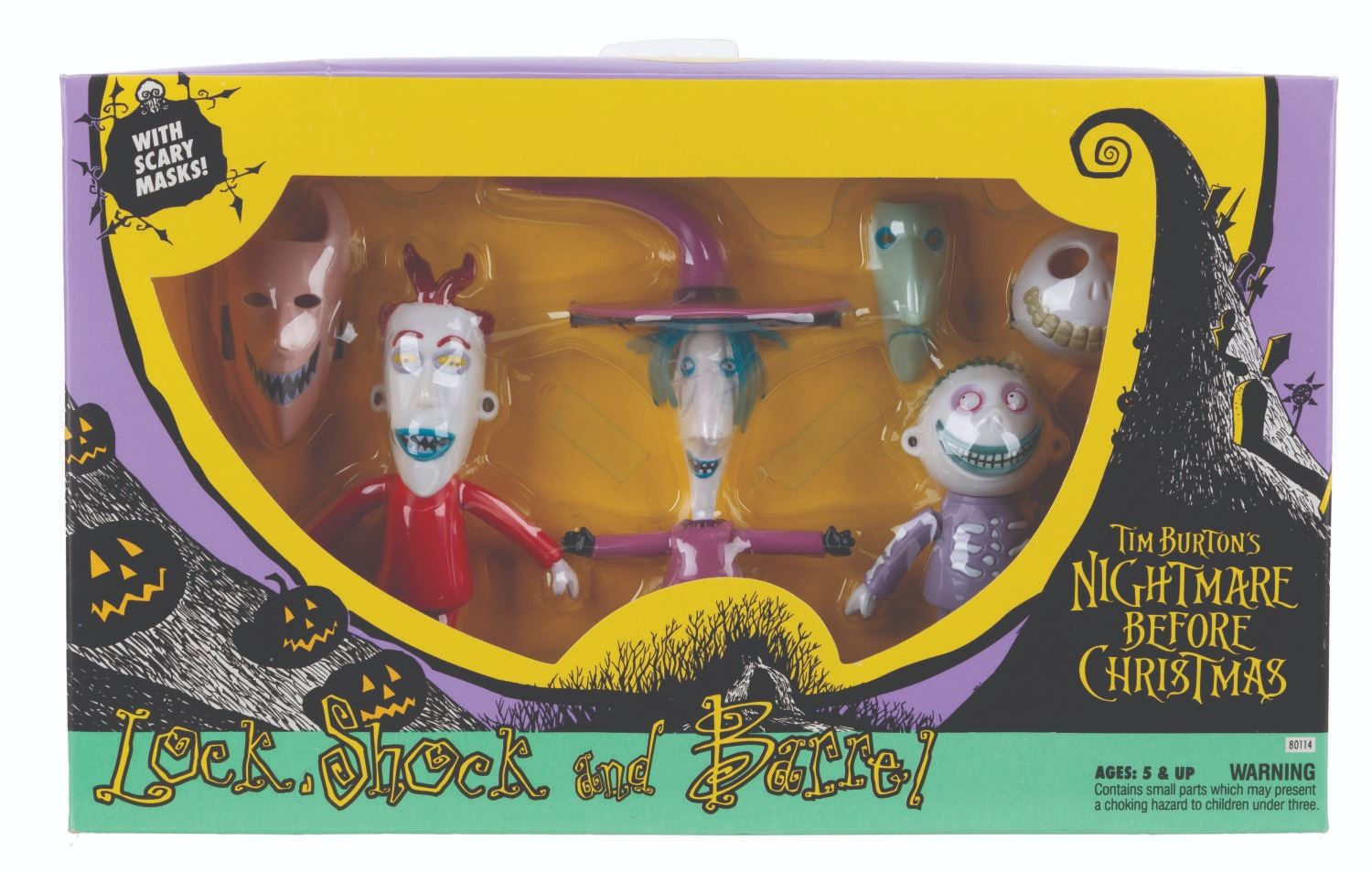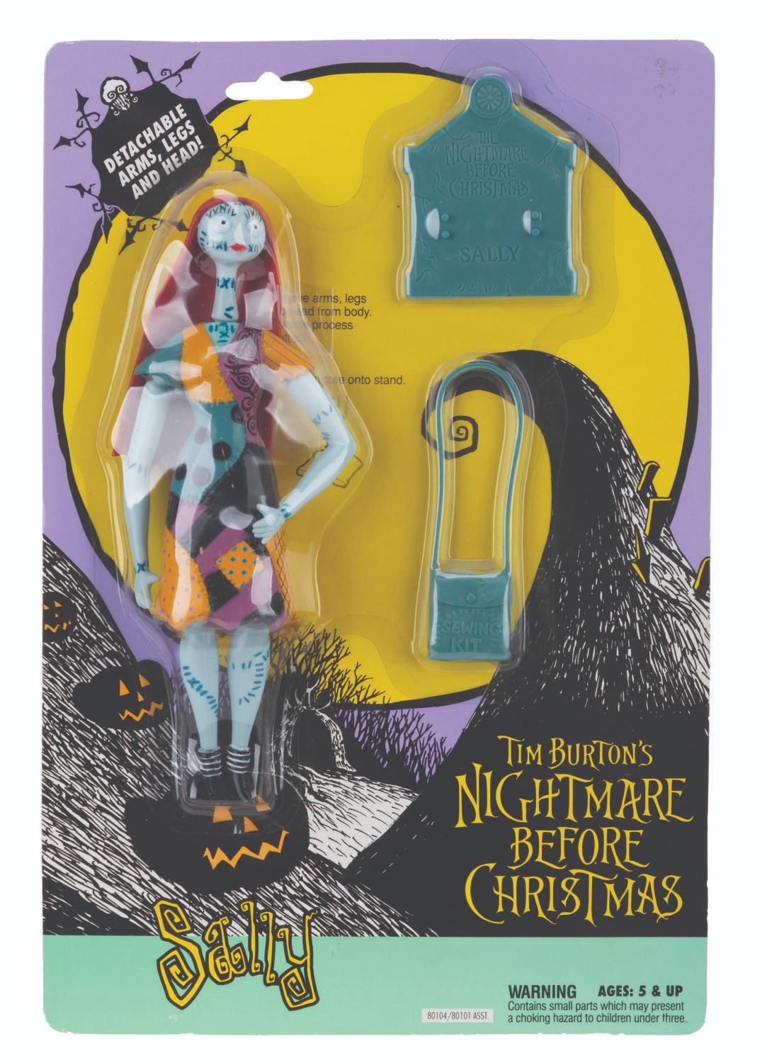(NECA, 1993) A collection of six "Tim Burton’s The Nightmare Before Christmas" toys. Included are figurines of Jack Skellington, Jack as Santa, Sally, and The Mayor, each sealed with two accessories, a Santa poseable hand puppet, and a Lock, Stock, and Barrel figurine set, also in their original boxes. Measuring 7.75" x 11.5" to 3" x 10" x 13", the collection is in very good condition with wear to the original packaging, including creasing, folds, edge wear, bends, scuffs, and scratches.
