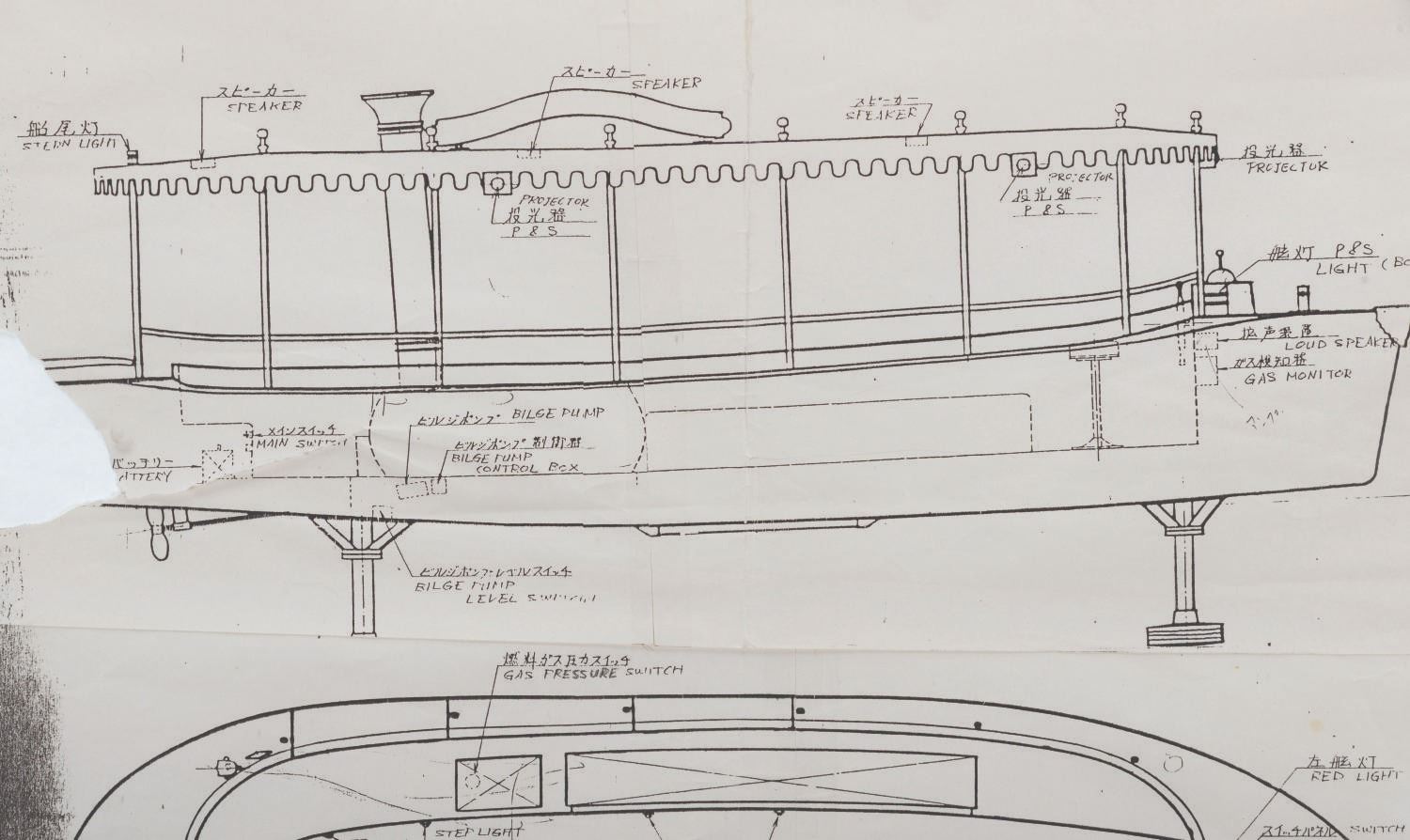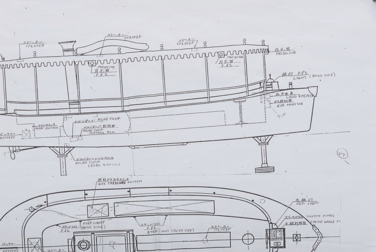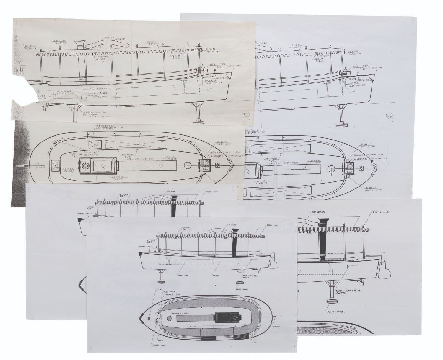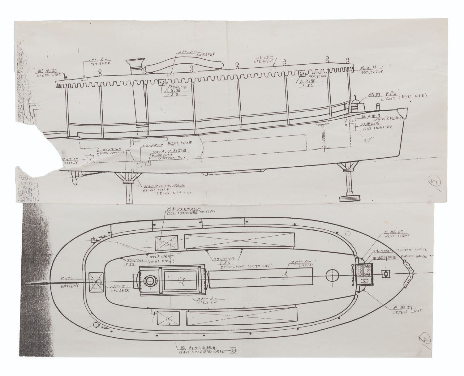 (Tokyo Disneyland, 1983) A five-page collection of technical schematic prints of Jungle Cruise boats from Tokyo Disneyland, with detailed layouts of the boat's main features and equipment. Two different schematics are included, with three copies of one and two of the other. Measuring 11" x 17" to 18" x 19", the schematics are in good condition with edge wear, creasing, discoloration, and tears to one of the prints.