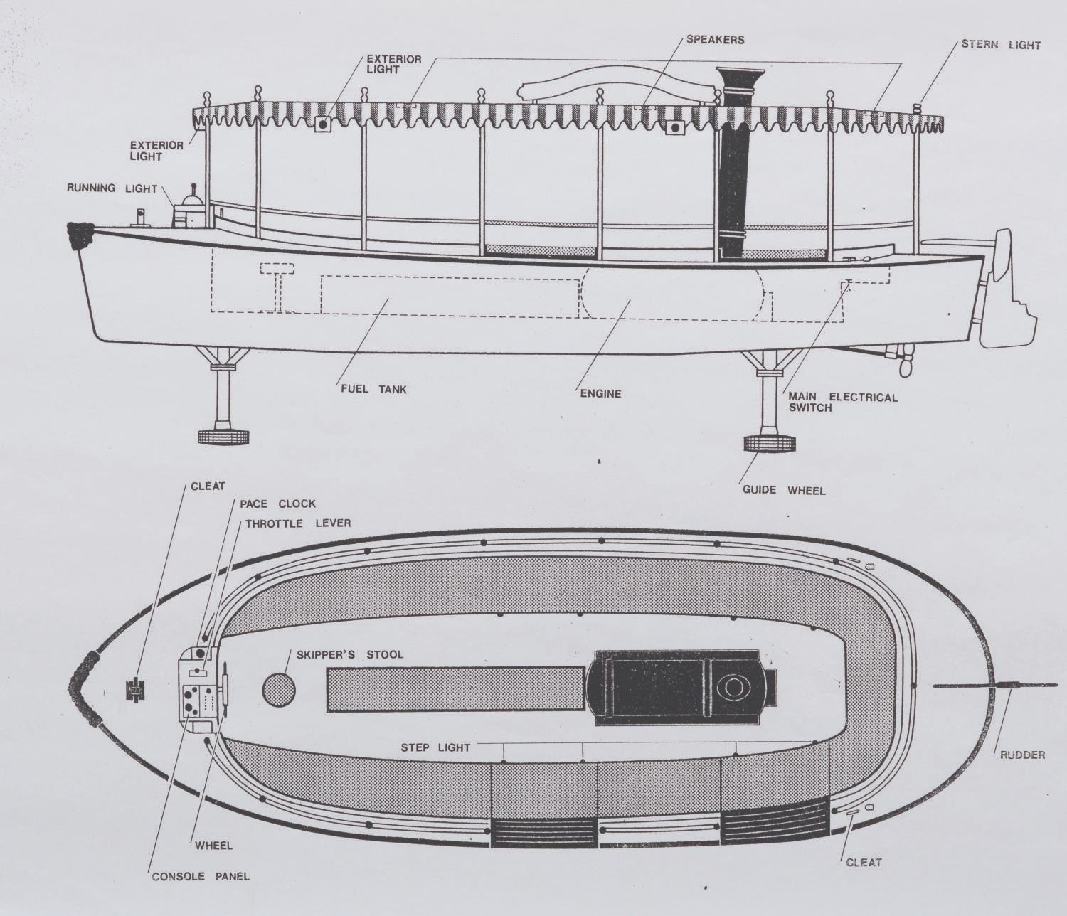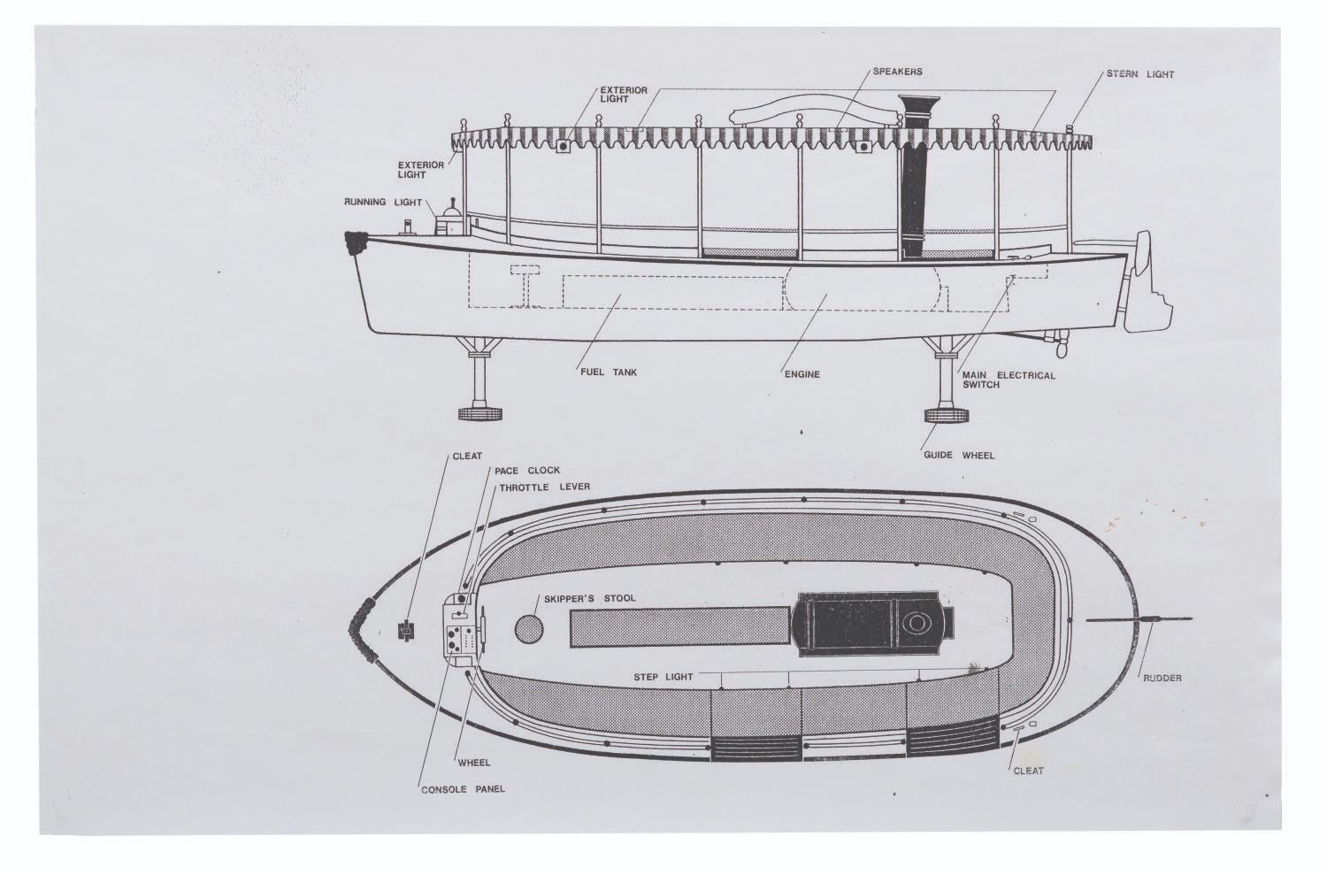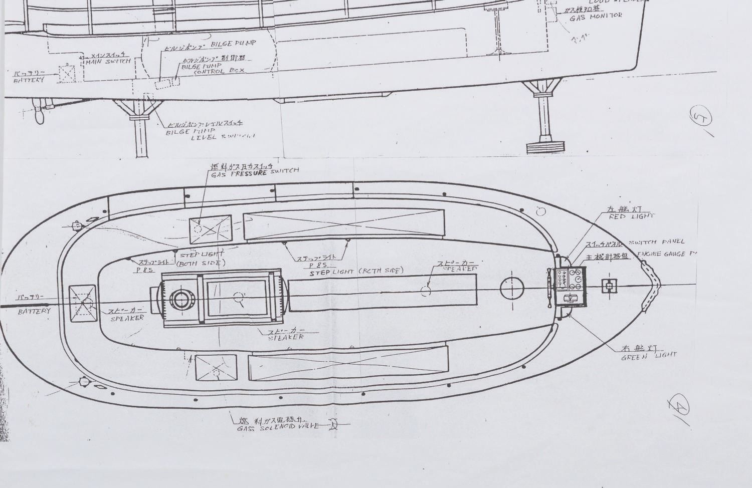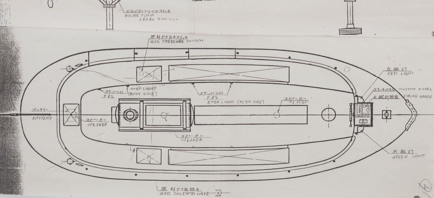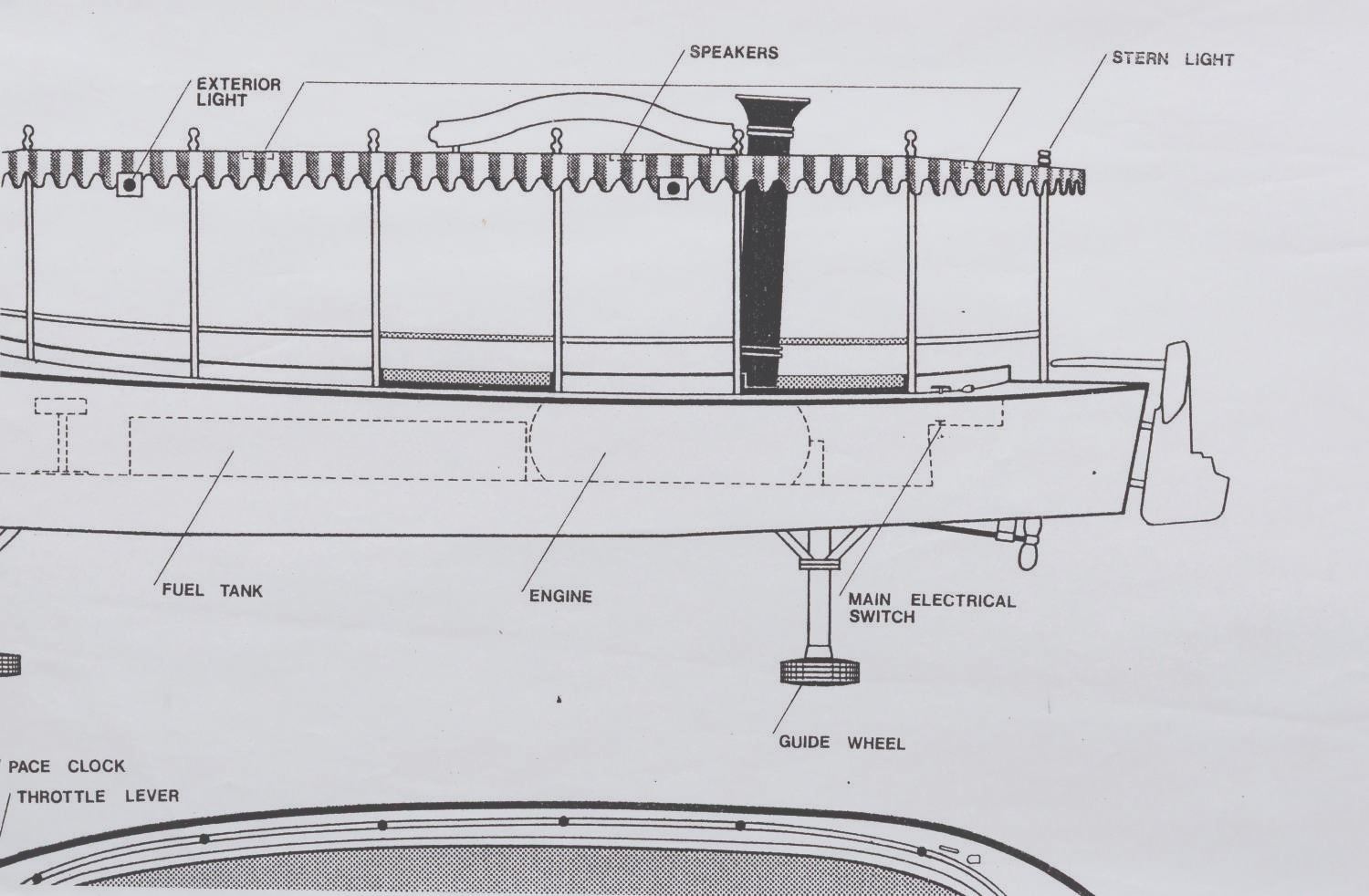 (Tokyo Disneyland, 1983) A five-page collection of technical schematic prints of Jungle Cruise boats from Tokyo Disneyland, with detailed layouts of the boat's main features and equipment. Two different schematics are included, with three copies of one and two of the other. Measuring 11" x 17" to 18" x 19", the schematics are in good condition with edge wear, creasing, discoloration, and tears to one of the prints.