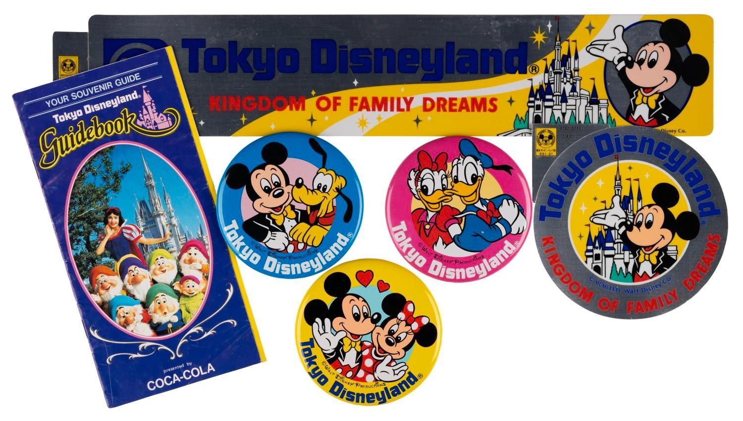 (Tokyo Disneyland, 1980s) A collection of early Tokyo Disneyland Souvenirs including three pinback buttons, a bumper sticker, a Mickey Mouse sticker, and a Park guidebook presented by Coca-Cola. Measuring from the 3.25" diameter button to the 15" x 3" bumper sticker, the items are in very good condition with light scratches. The 3.75" x 7.5" guidebook is in fair condition with notable handling wear.