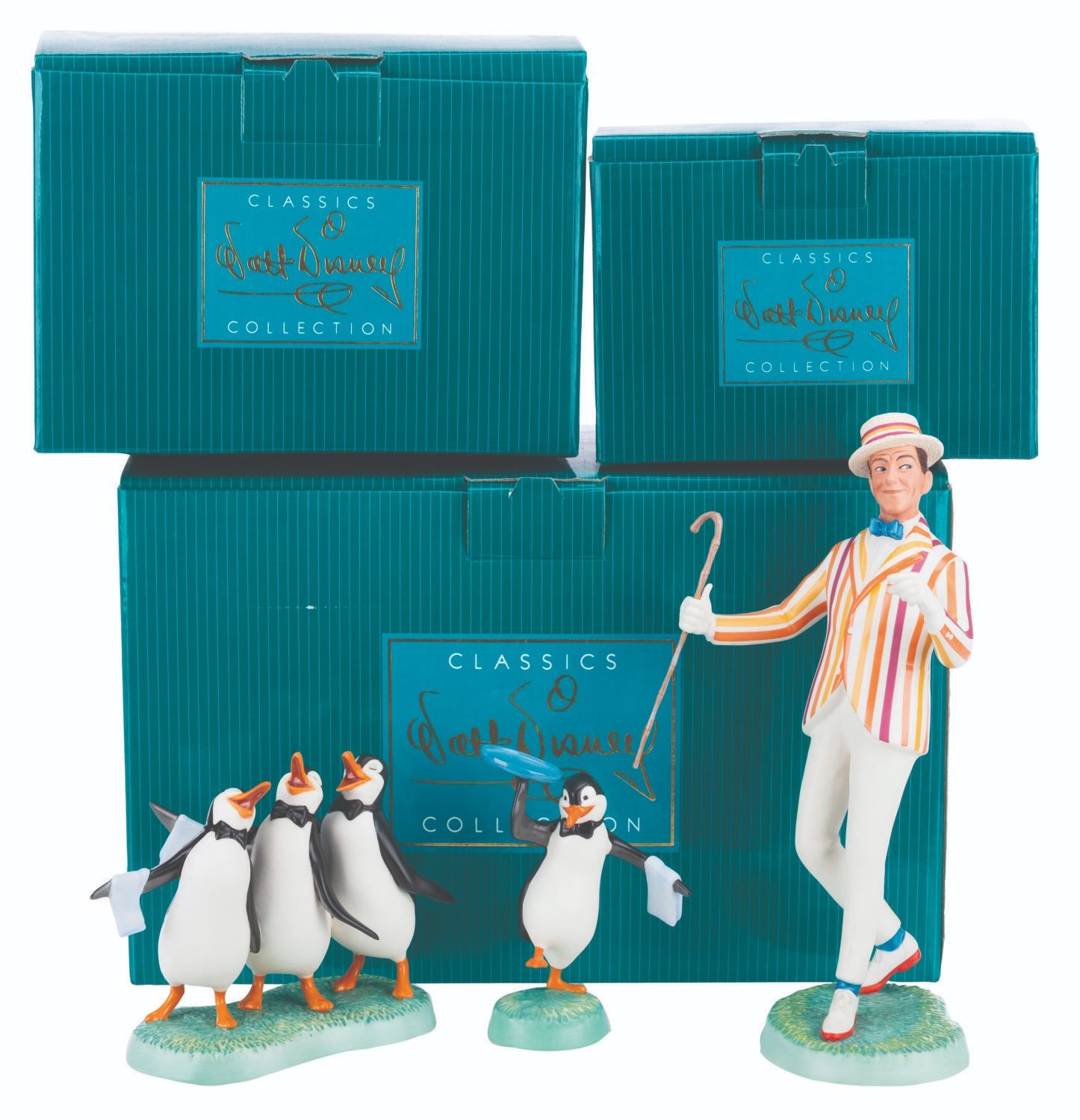 (WDCC, 2000-01) Three Walt Disney Classics Collection figurines of Bert and the Penguin waiters from "Mary Poppins." The figurines are titled "Feeling Grand," "Anything for You, Mary Poppins," and "You're Our Favorite Person." Measuring 4.5" to 9" tall, the figurines are all in fine condition in their original boxes.
