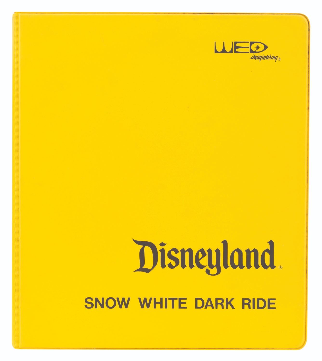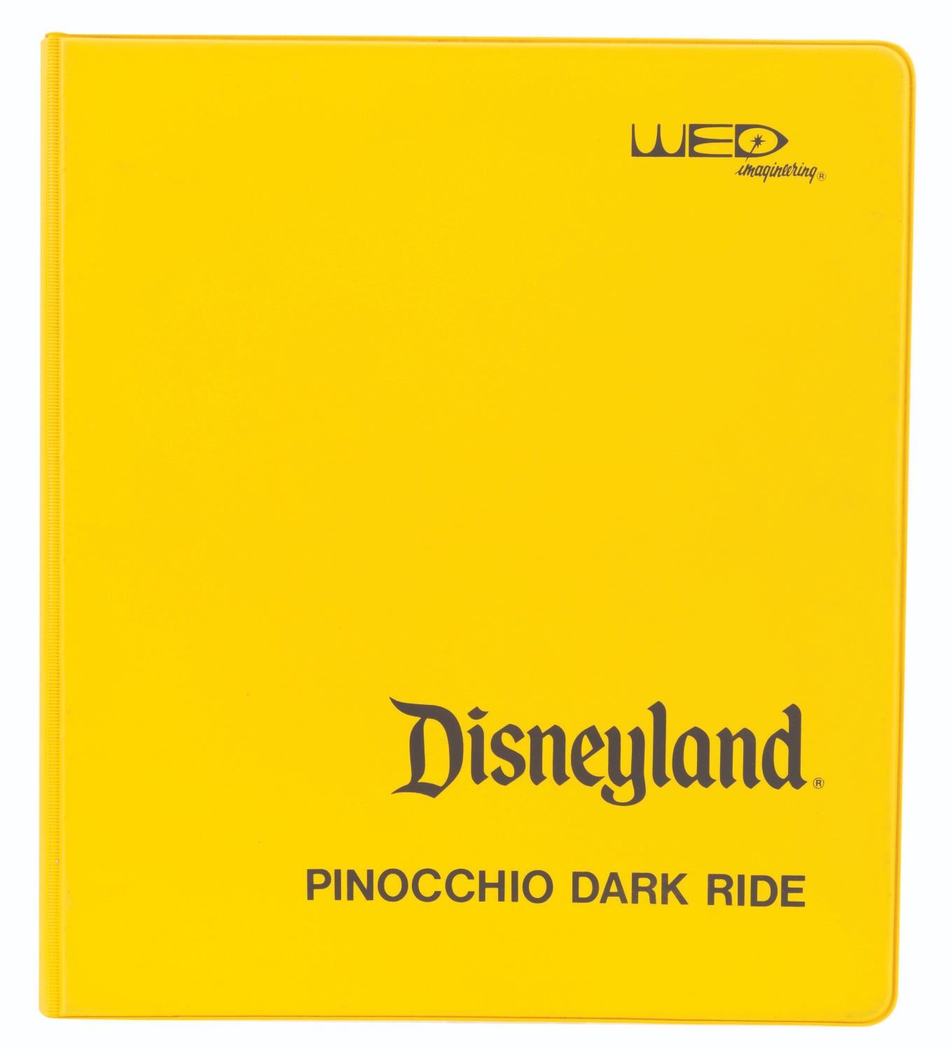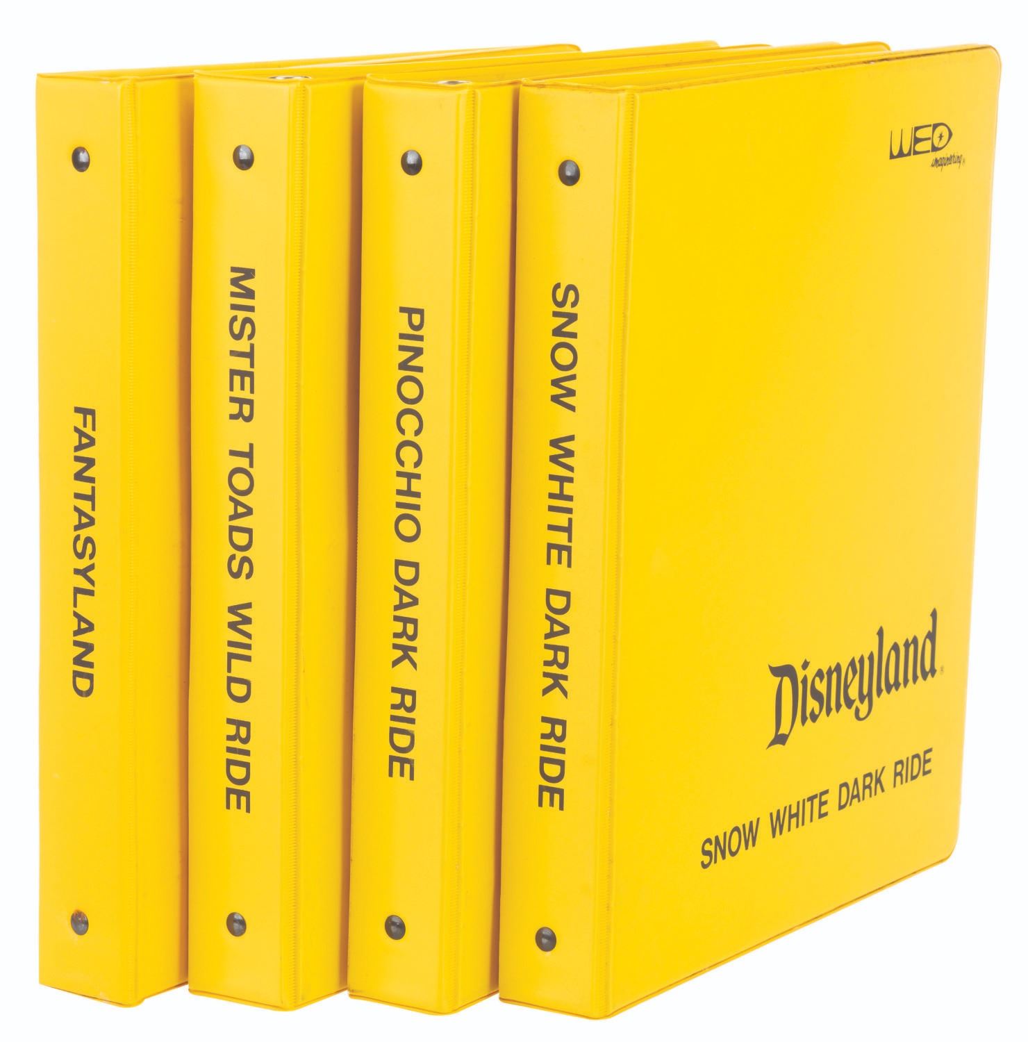 (WED, 1980s) A collection of four empty Disneyland Imagineering binders used for attractions in Fantasyland. The yellow binders are printed with"Fantasyland,""Mister Toad's Wild Ride,""Pinocchio Dark Ride," and"Snow White Dark Ride" on the covers and spines. The 10" x 11.5" three-ring binders are in good condition with expected wear from age and use.