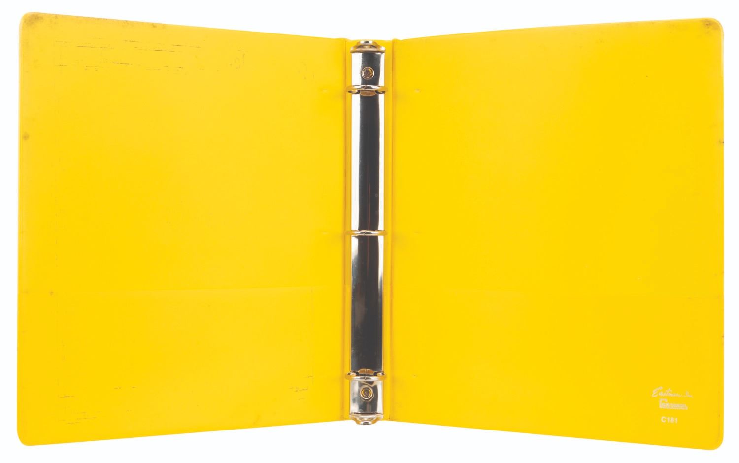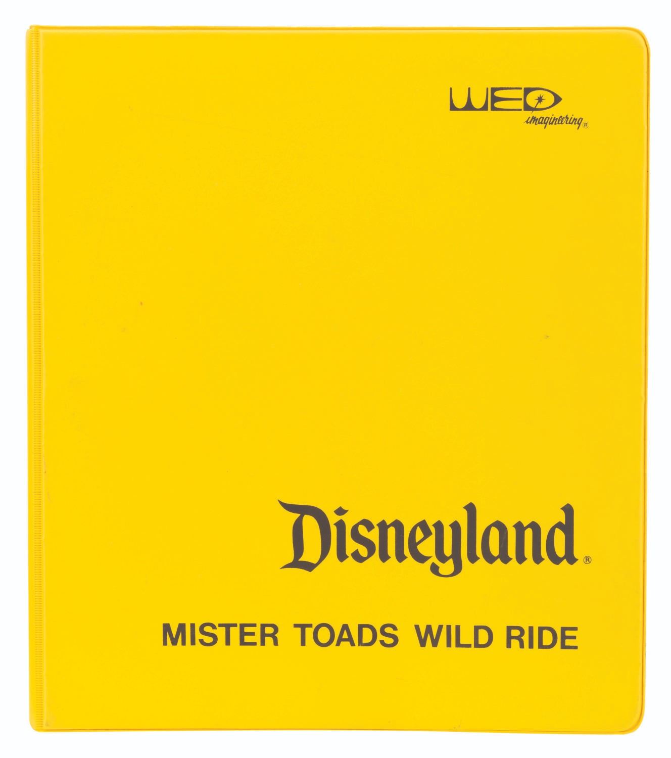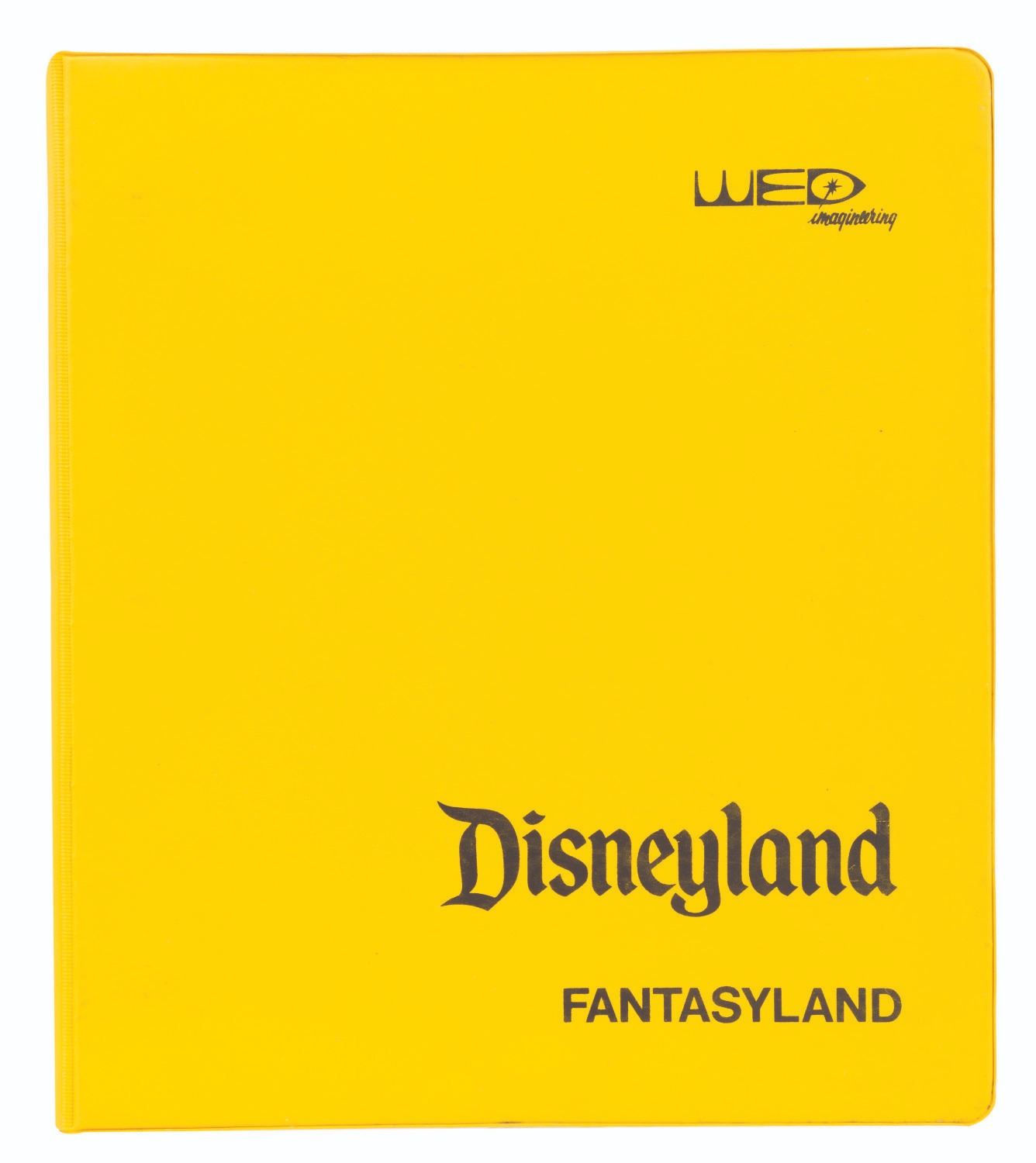 (WED, 1980s) A collection of four empty Disneyland Imagineering binders used for attractions in Fantasyland. The yellow binders are printed with"Fantasyland,""Mister Toad's Wild Ride,""Pinocchio Dark Ride," and"Snow White Dark Ride" on the covers and spines. The 10" x 11.5" three-ring binders are in good condition with expected wear from age and use.
