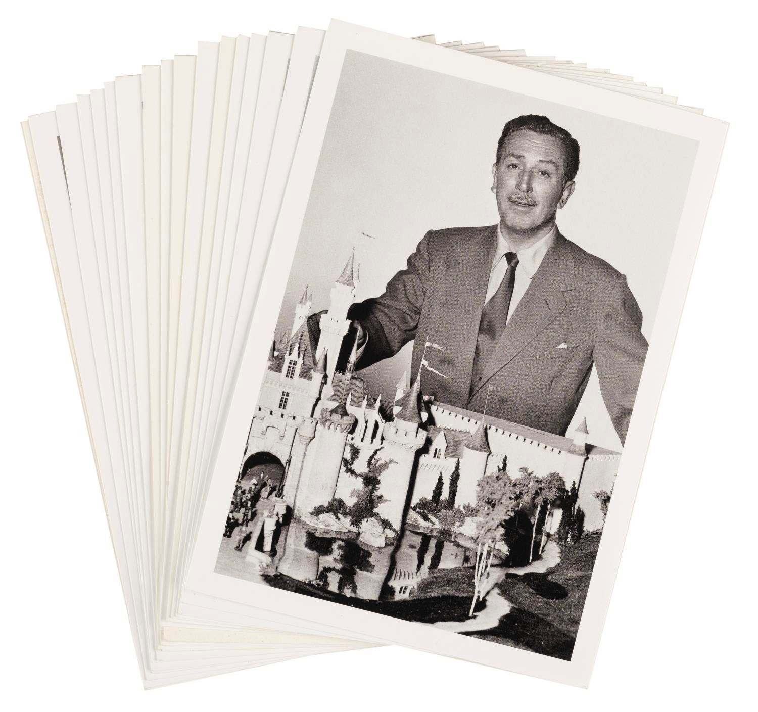 (Disneyland, 2001) A collection of 15 Cast Member exclusive postcards commemorating Walt Disney's 100th birthday, featuring beautiful black and white imagery of Walt. Measuring 4.25"x6" each, the postcards are in fine condition with one postcard displaying a light crease.