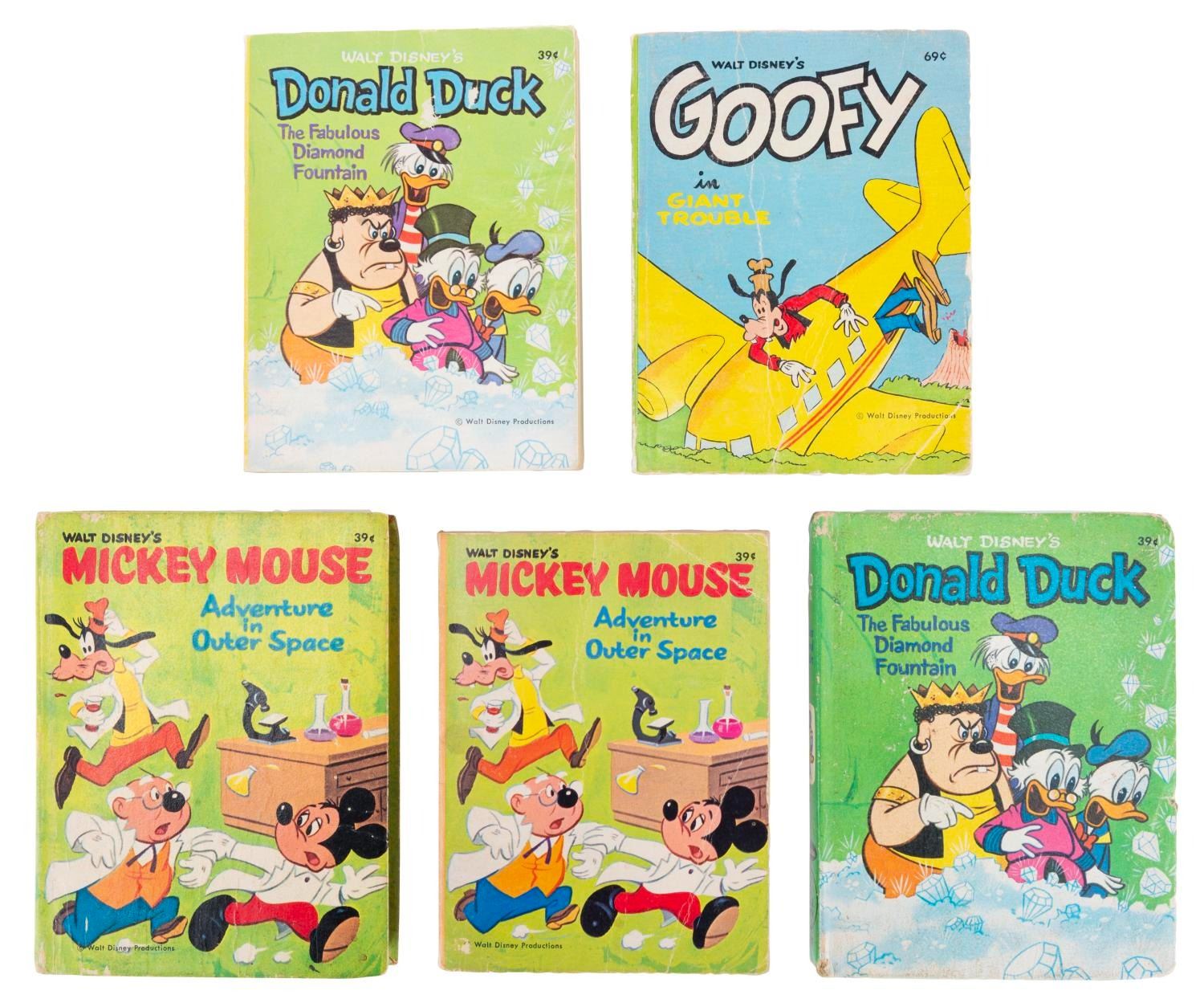 (Whitman, 1967-1968) A collection of five Walt Disney Big Little Books, including both hardcover and softcover copies of "Mickey Mouse Adventure in Outer Space" and "Donald Duck The Fabulous Diamond Fountain," and a softcover copy of "Goofy in Giant Trouble." Measuring 4" x 5", the books are in good condition with some creases, stains, and wear from use.