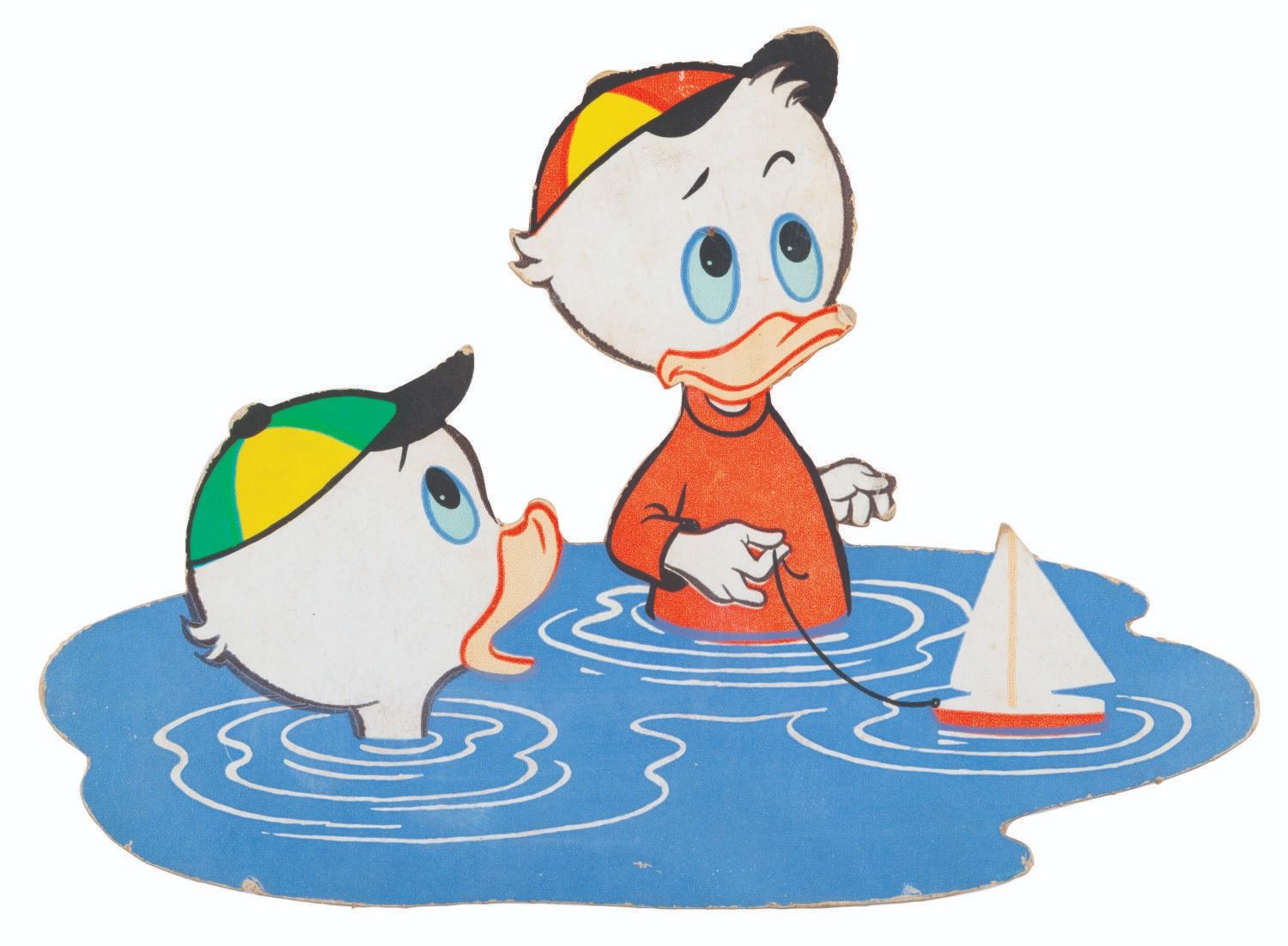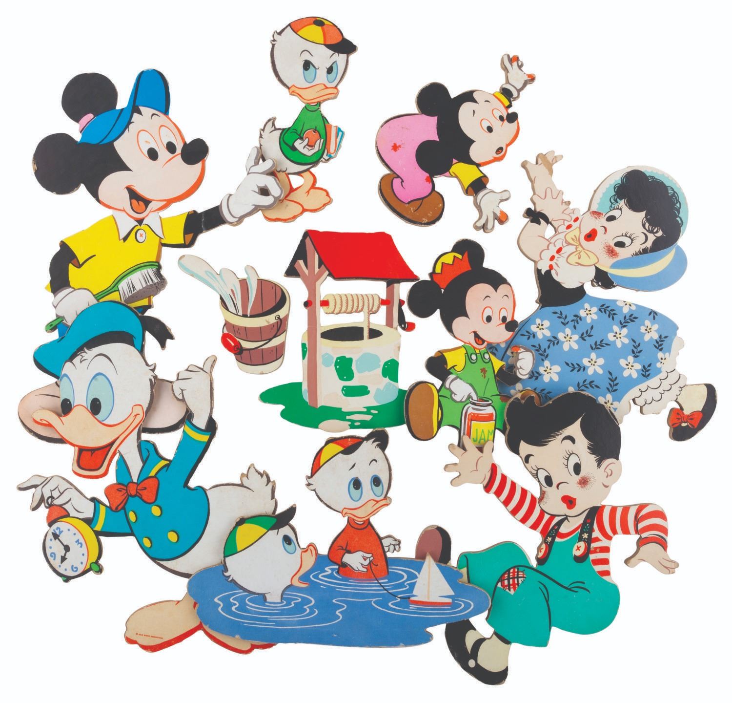 (Dolly Toy, 1950s-60s) A collection of 10 Walt Disney Pin-Ups manufactured by Dolly Toy Company, featuring colorful wall decorations of Mickey and his nephews, Donald and his nephews, and the Mother Goose characters, Jack and Jill. Measuring 5.5” x 7.25” to 9.5” x 14”, the chipboard decorations display in good condition with light scuffs, wear, creasing, and light discoloration from age.