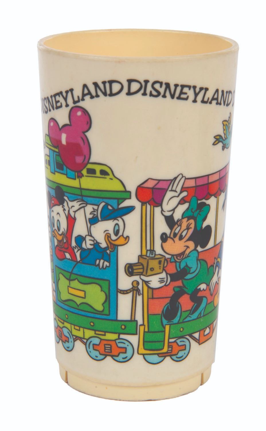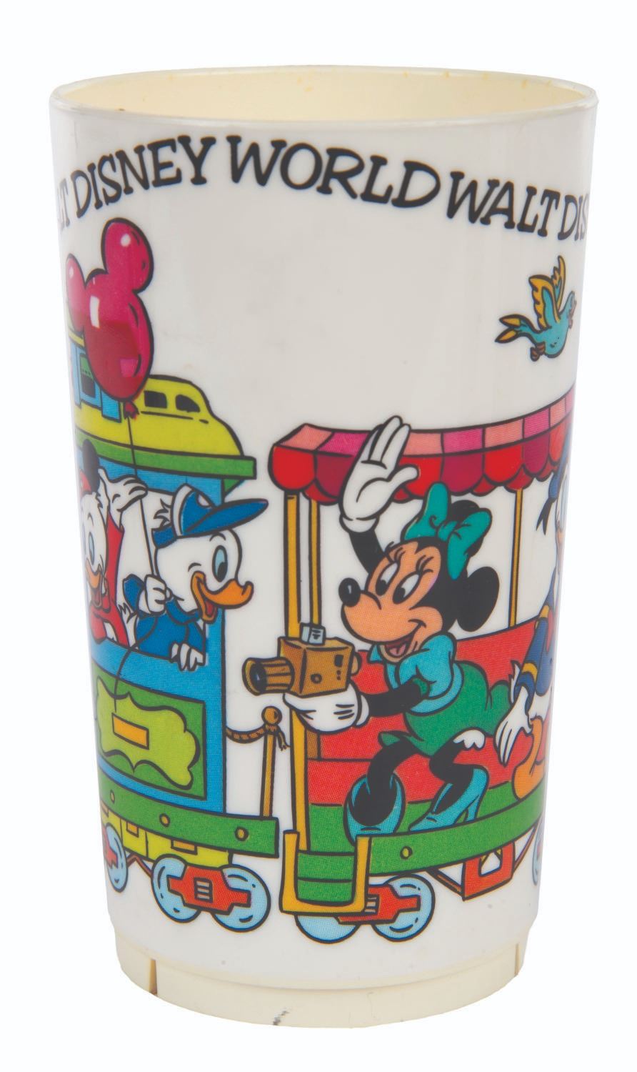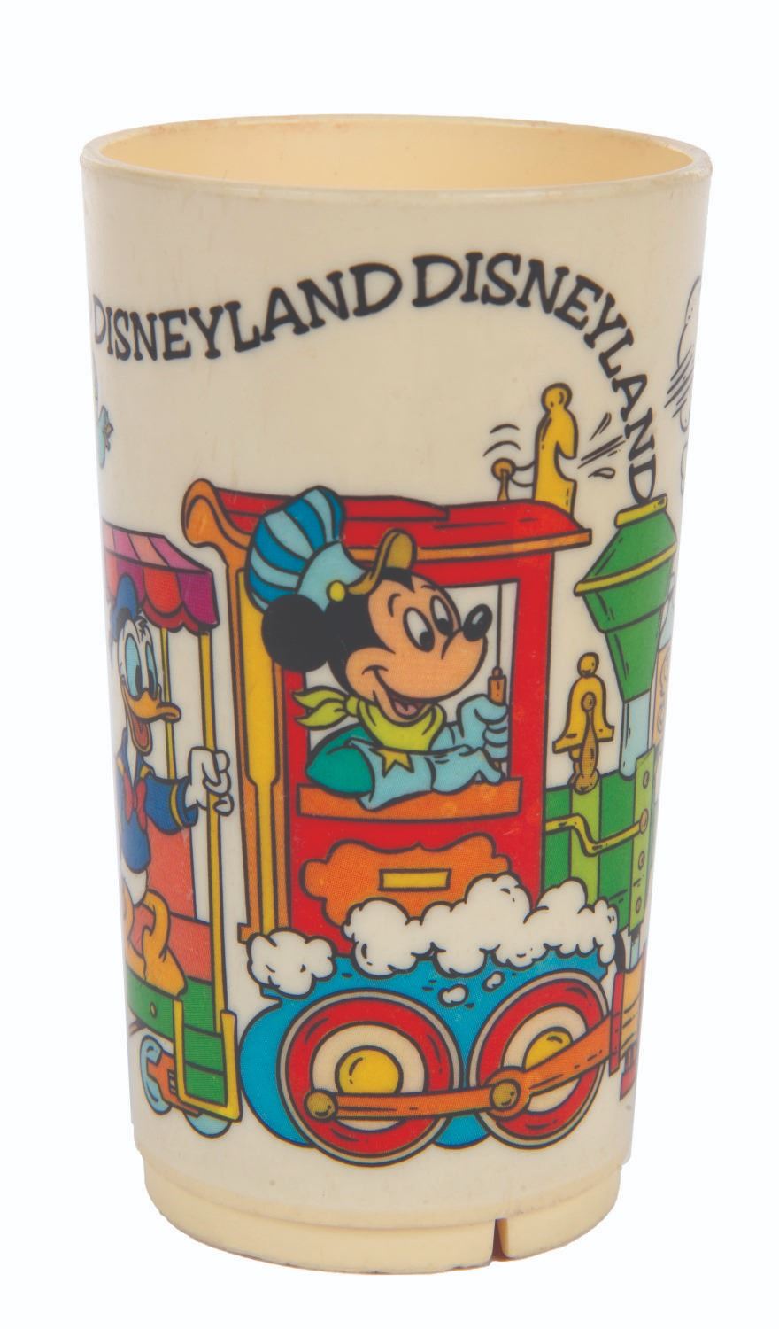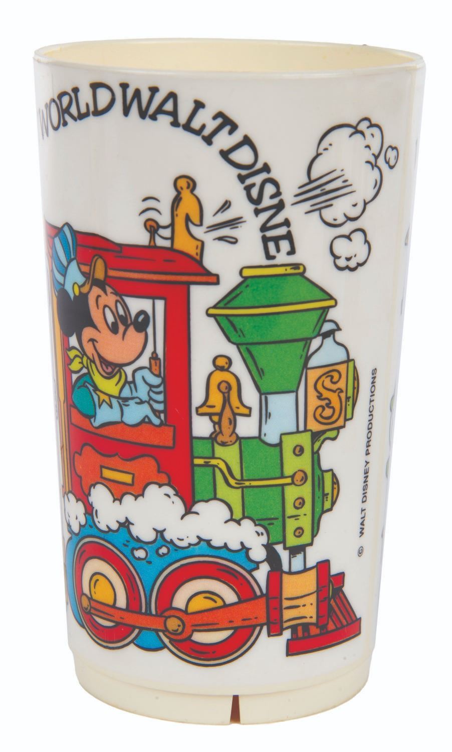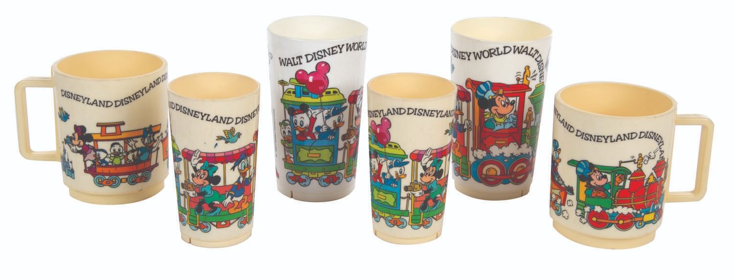(Disneyland/WDW/deka, c.1980s) A collection of (6) souvenir cups of Disneyland and walt Disney World by deka plastics. The cups feature imagery of Disney characters enjoying steam trains and monorail trains at both parks. Measuring from 3.75" to 4", the cups are in good condition, despite some yellowing and wear from use.