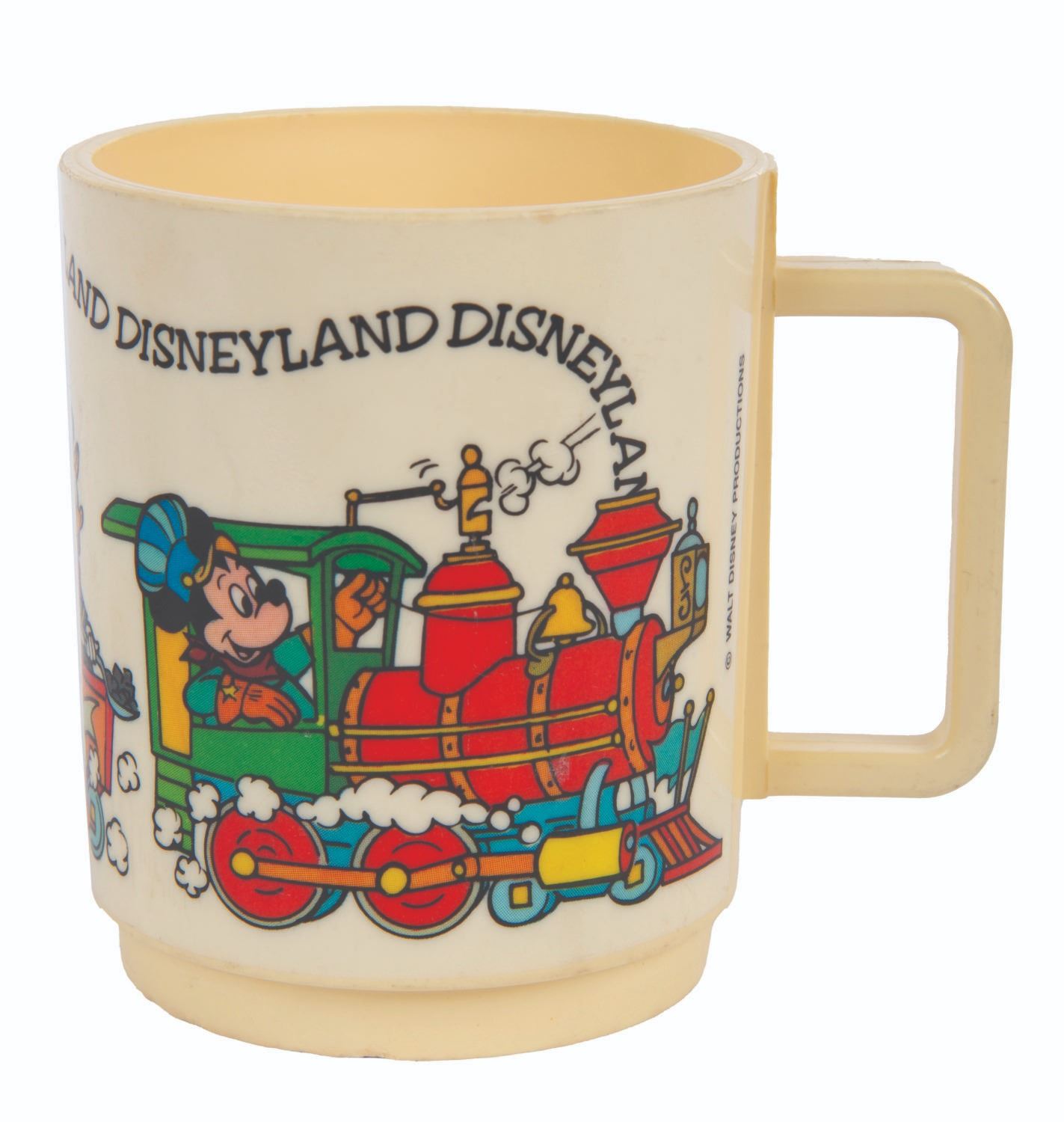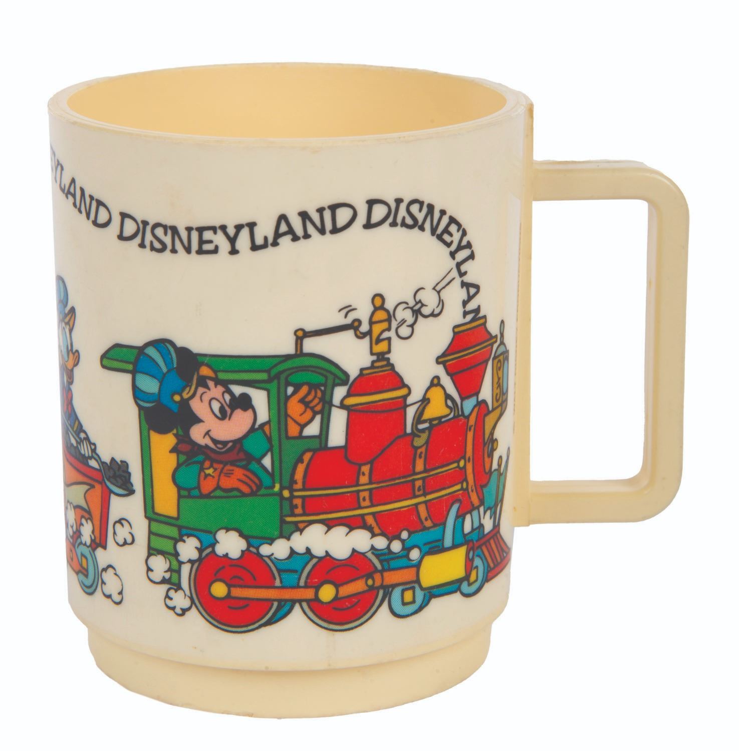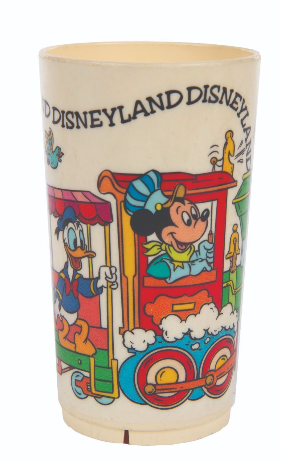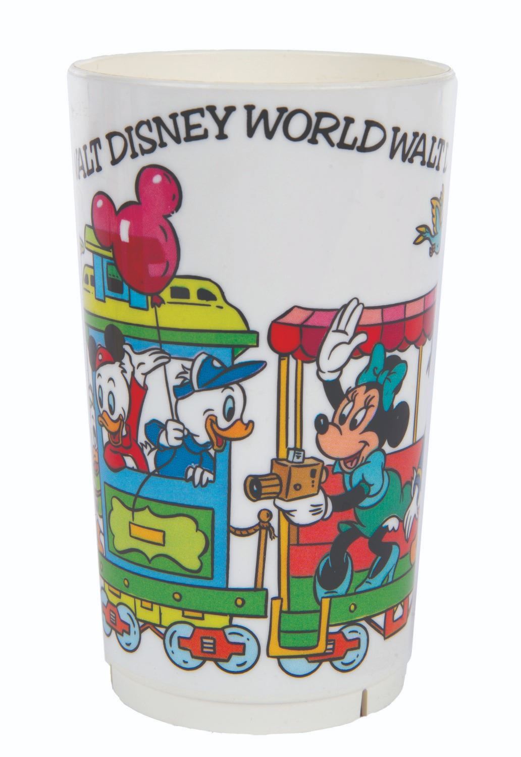 (Disneyland/WDW/deka, c.1980s) A collection of (6) souvenir cups of Disneyland and walt Disney World by deka plastics. The cups feature imagery of Disney characters enjoying steam trains and monorail trains at both parks. Measuring from 3.75" to 4", the cups are in good condition, despite some yellowing and wear from use.