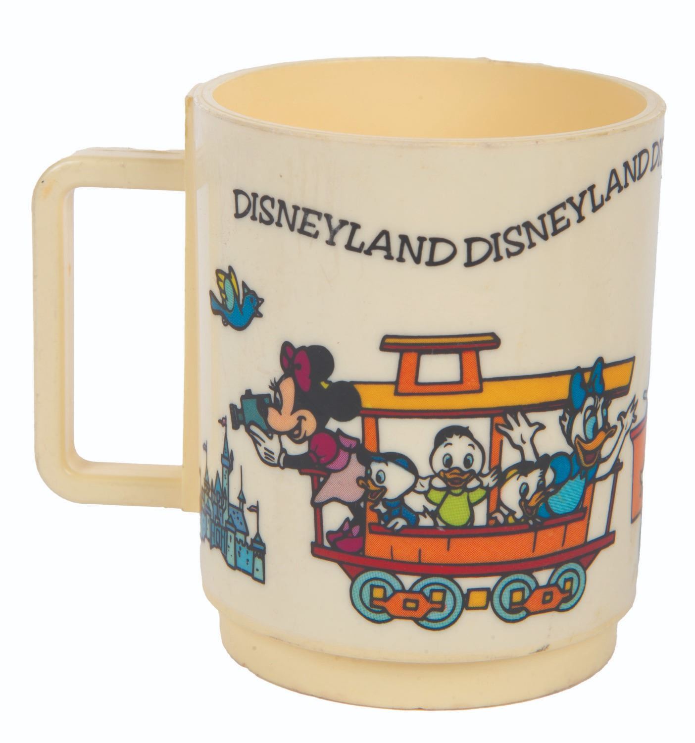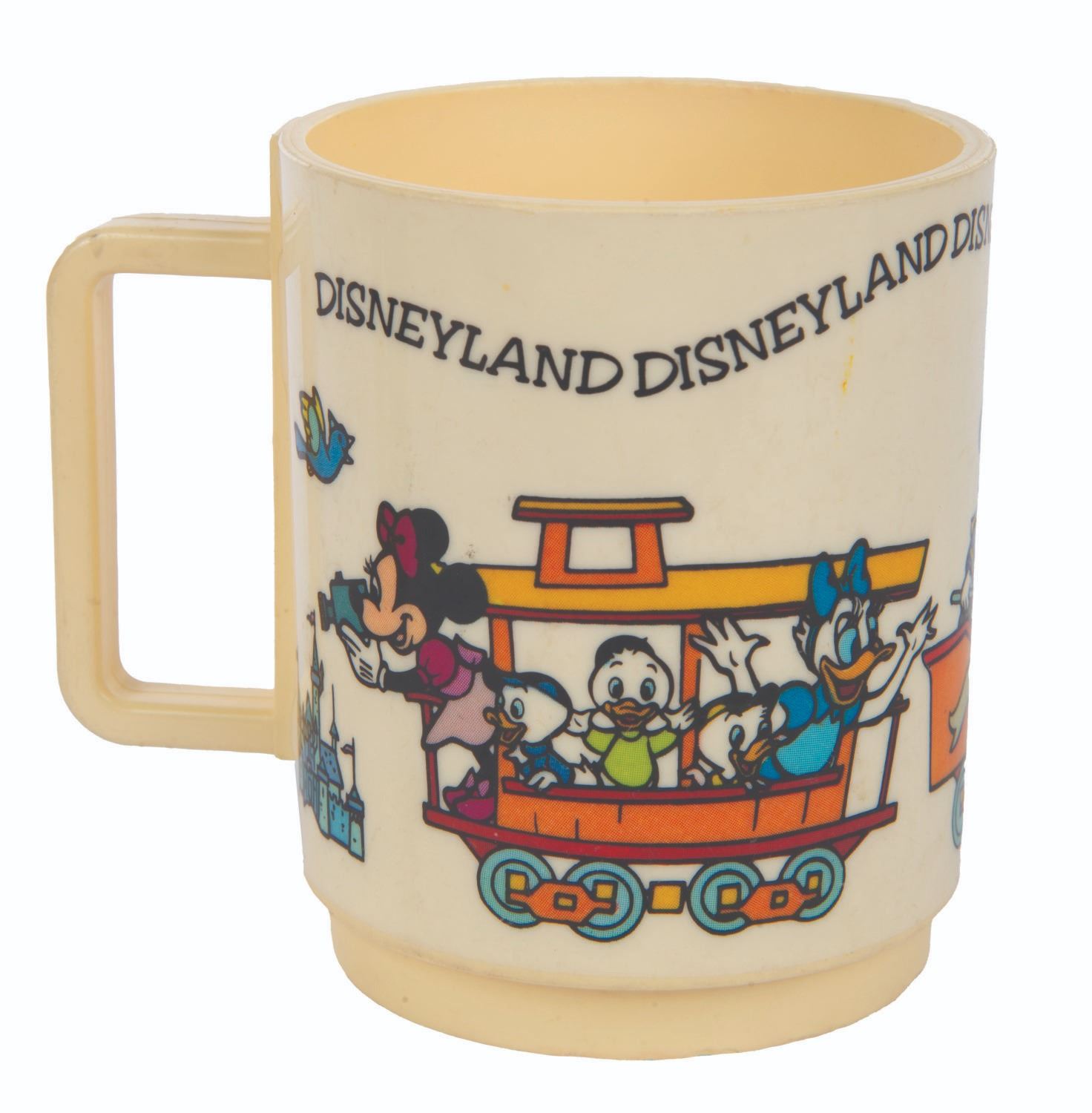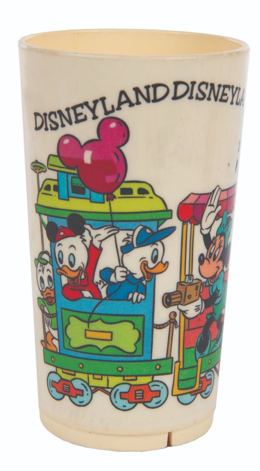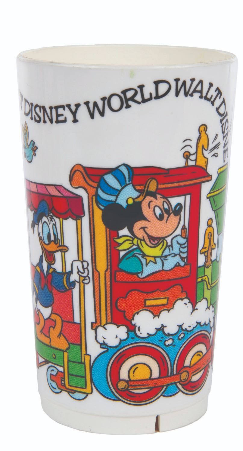 (Disneyland/WDW/deka, c.1980s) A collection of (6) souvenir cups of Disneyland and walt Disney World by deka plastics. The cups feature imagery of Disney characters enjoying steam trains and monorail trains at both parks. Measuring from 3.75" to 4", the cups are in good condition, despite some yellowing and wear from use.