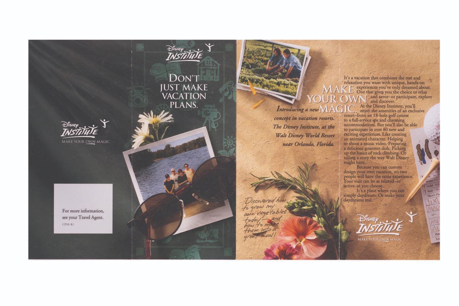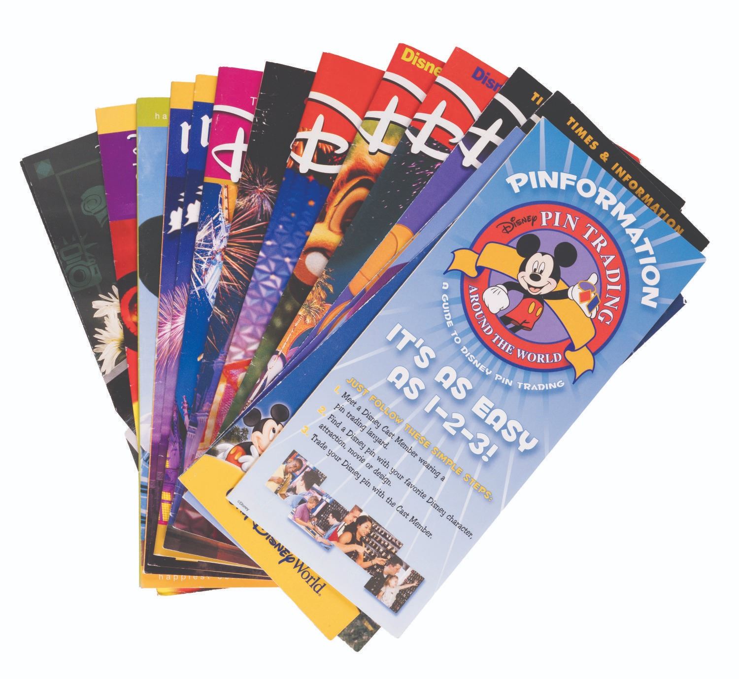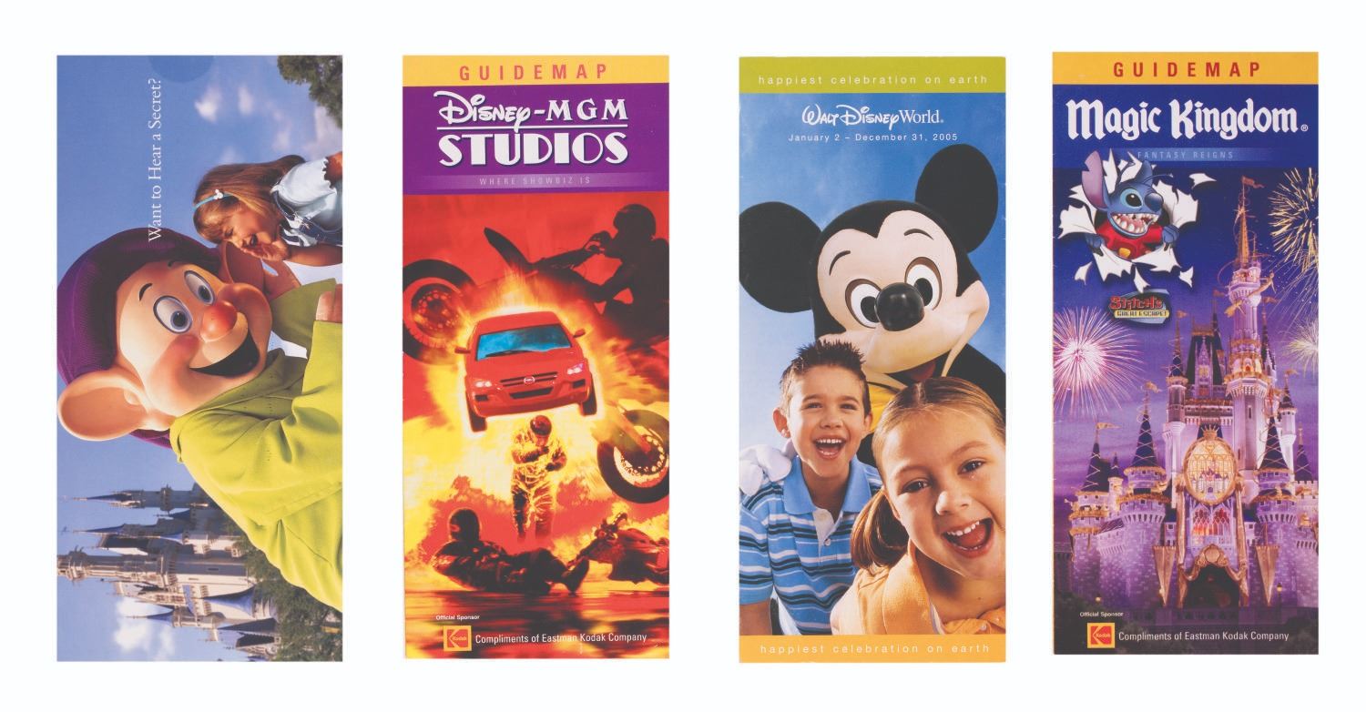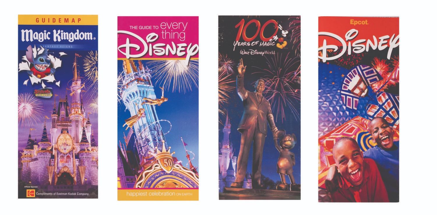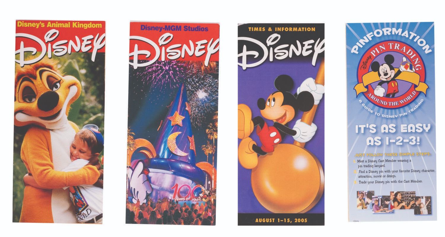 (Walt Disney World, 2000s) A collection of 18 guide brochures, schedules, and information brochures from the Parks at Walt Disney World Resort including Epcot Center, Animal Kingdom, Disney-MGM Studios, and the Magic Kingdom. The brochures are in very good condition with typical handling wear.