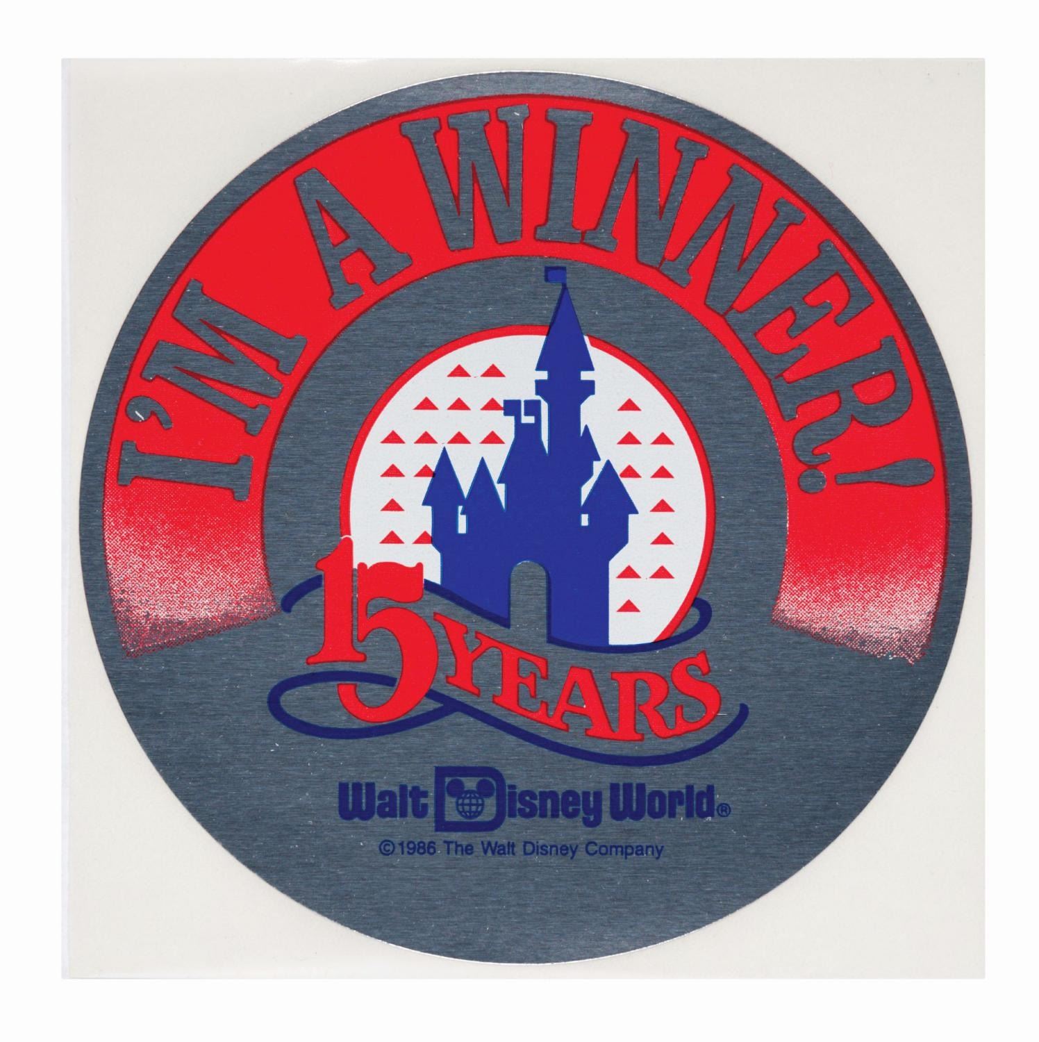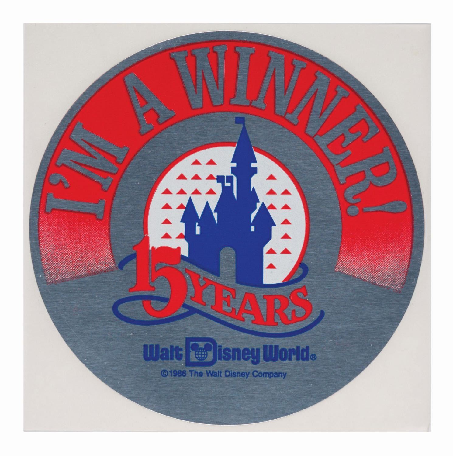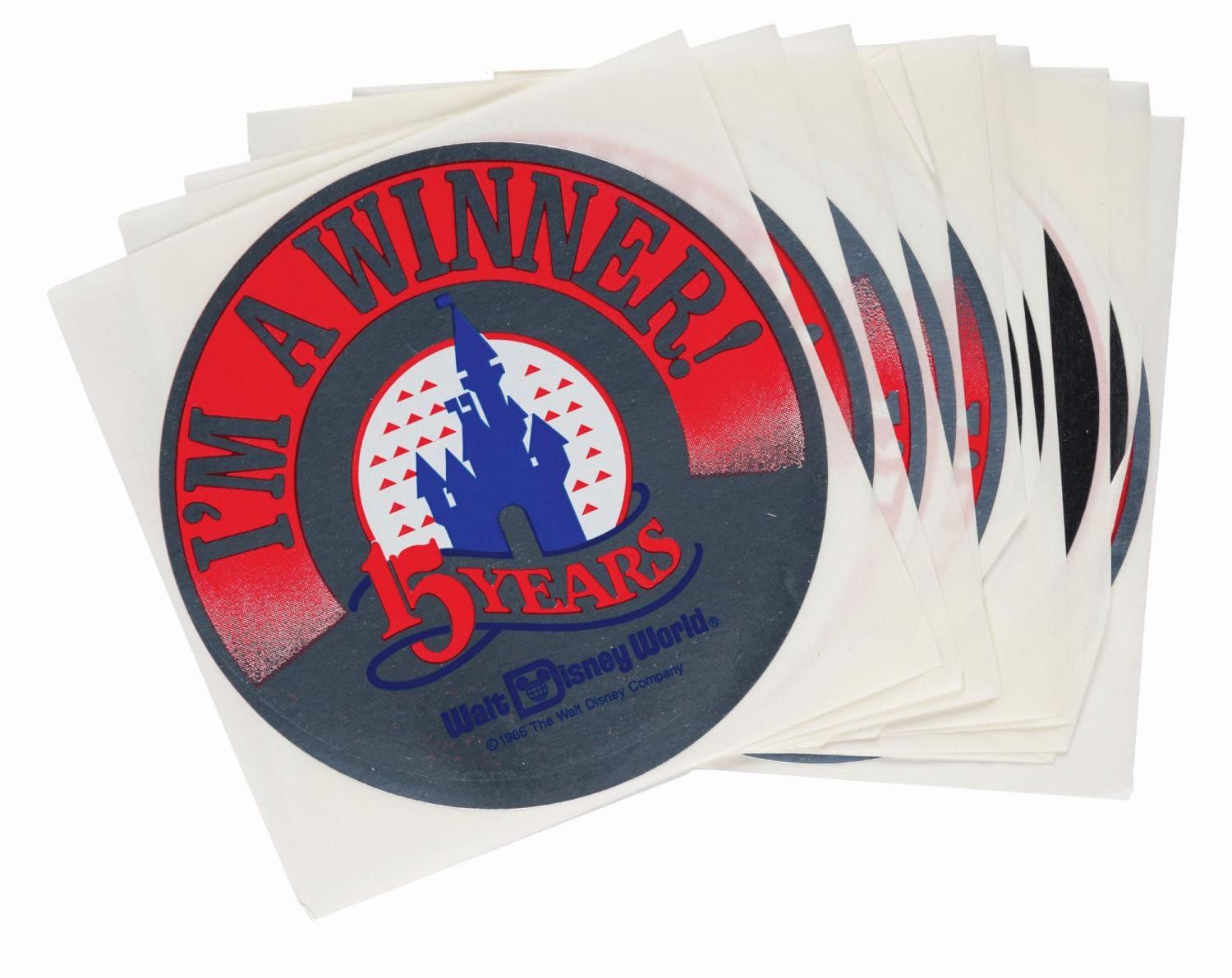 (Walt Disney World, 1986) A collection of ten "I’m a Winner!" stickers from Walt Disney World’s 15th anniversary celebration and promotion. Each measuring 4" in diameter, the stickers are in very good to fine condition with some light handling wear.