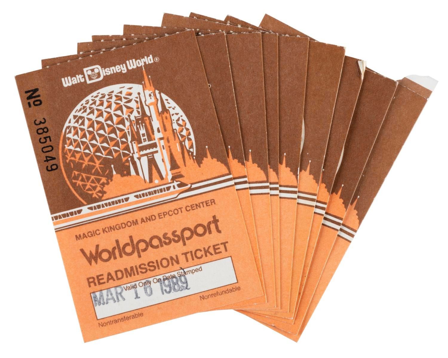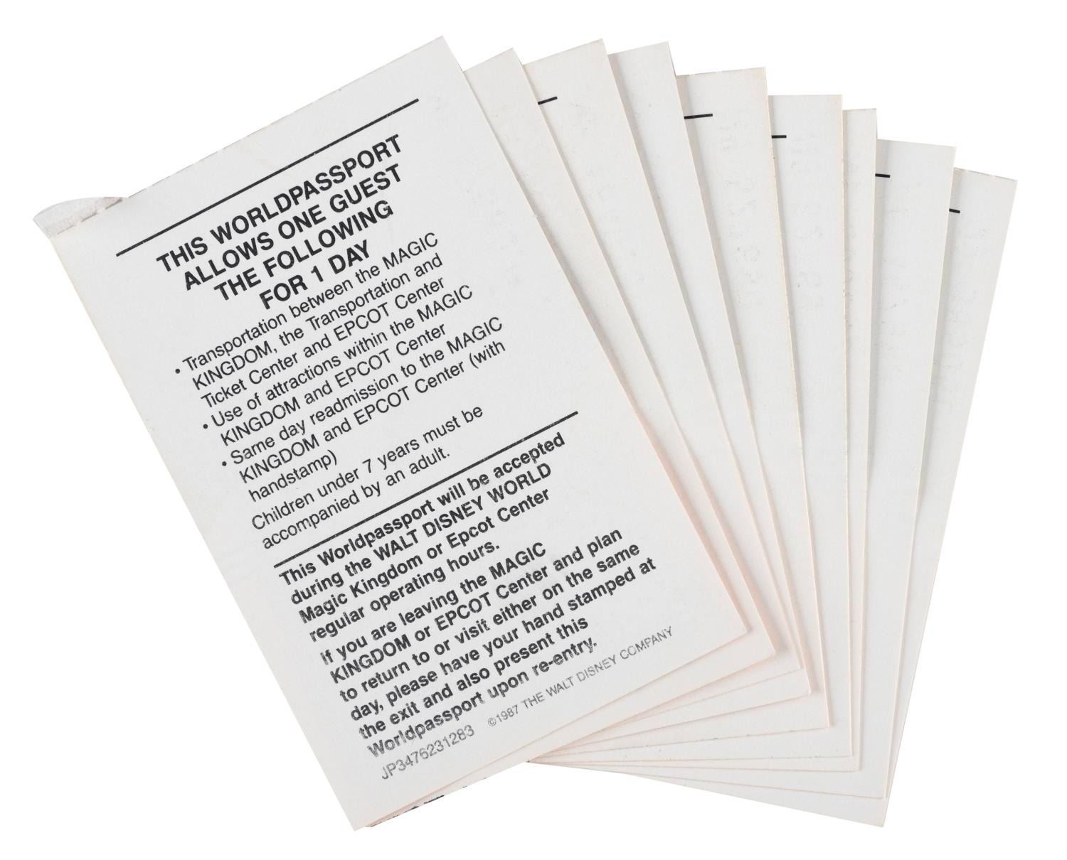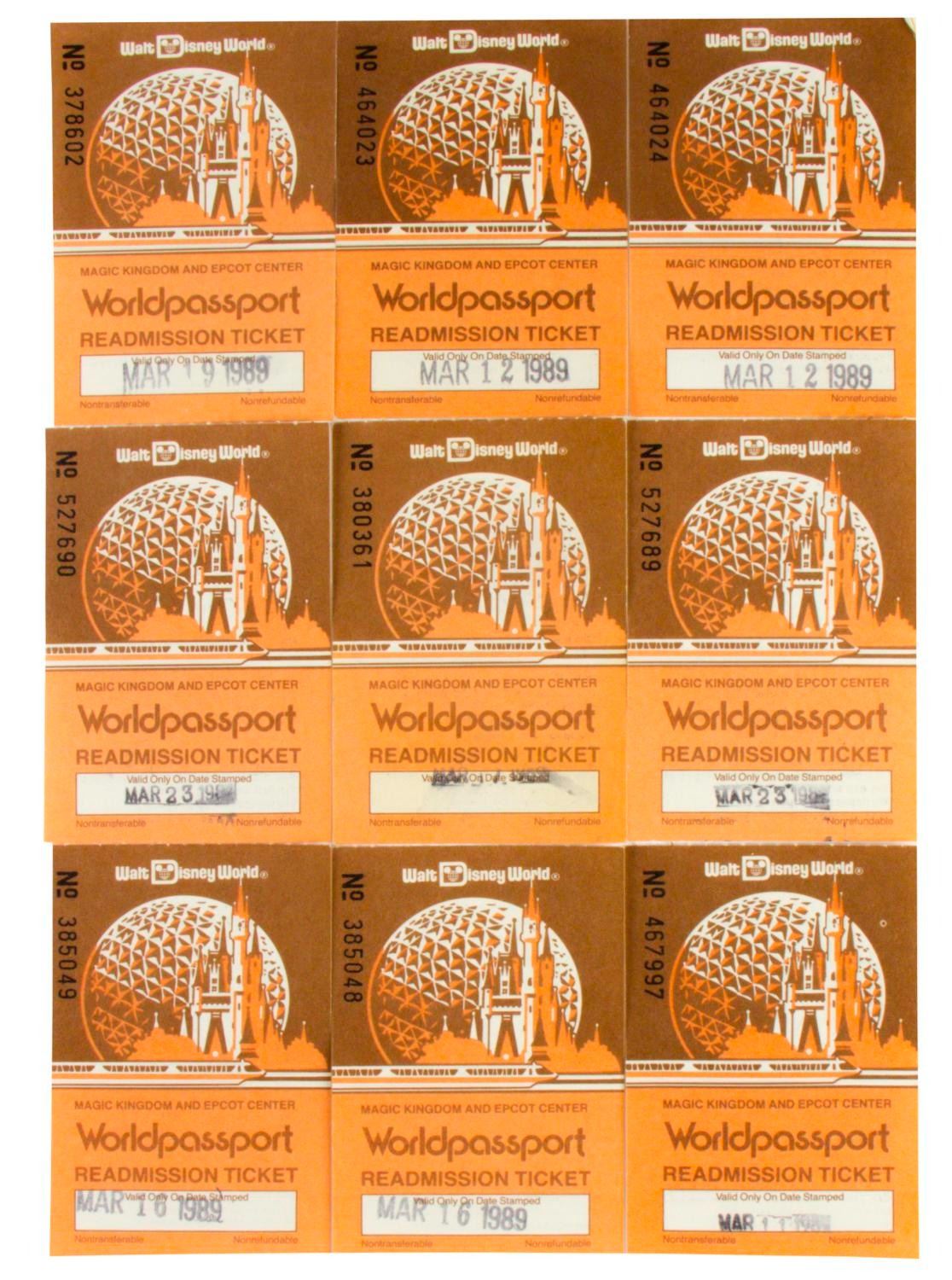 (Walt Disney World, 1989) A collection of nine Walt Disney World Worldpassport readmission tickets, all stamped with dates in March of 1989. Measuring 2.5" x 3.5", each passport is in very good condition with light wear.