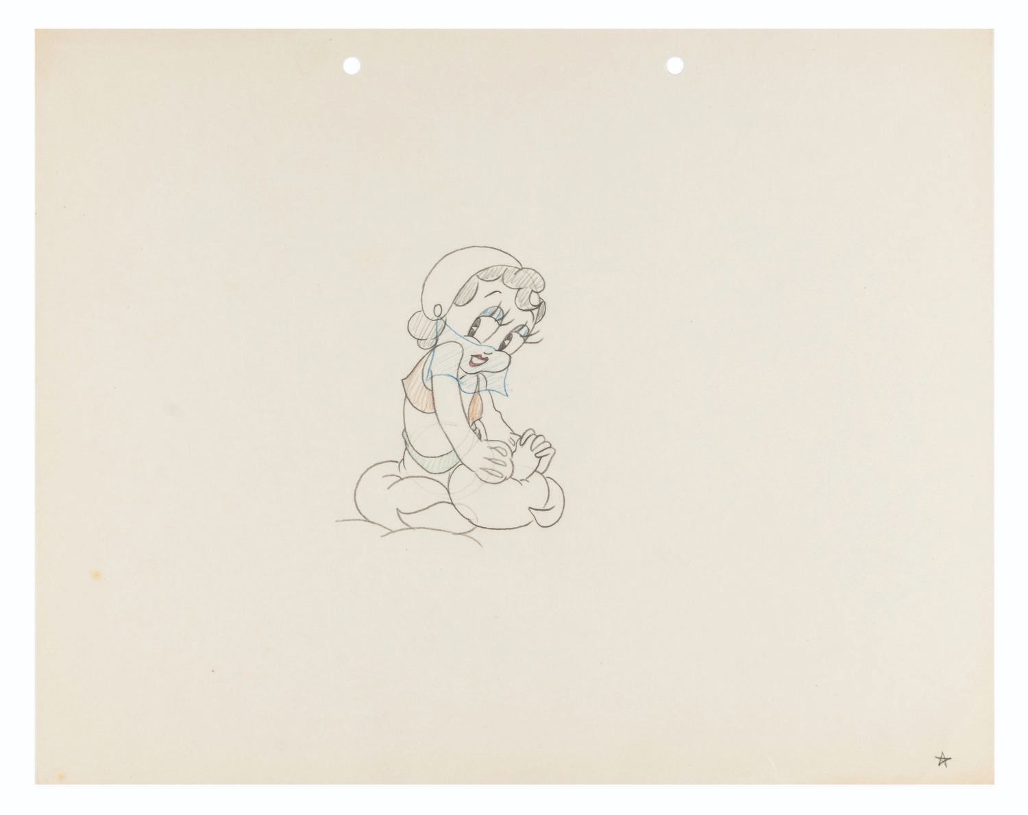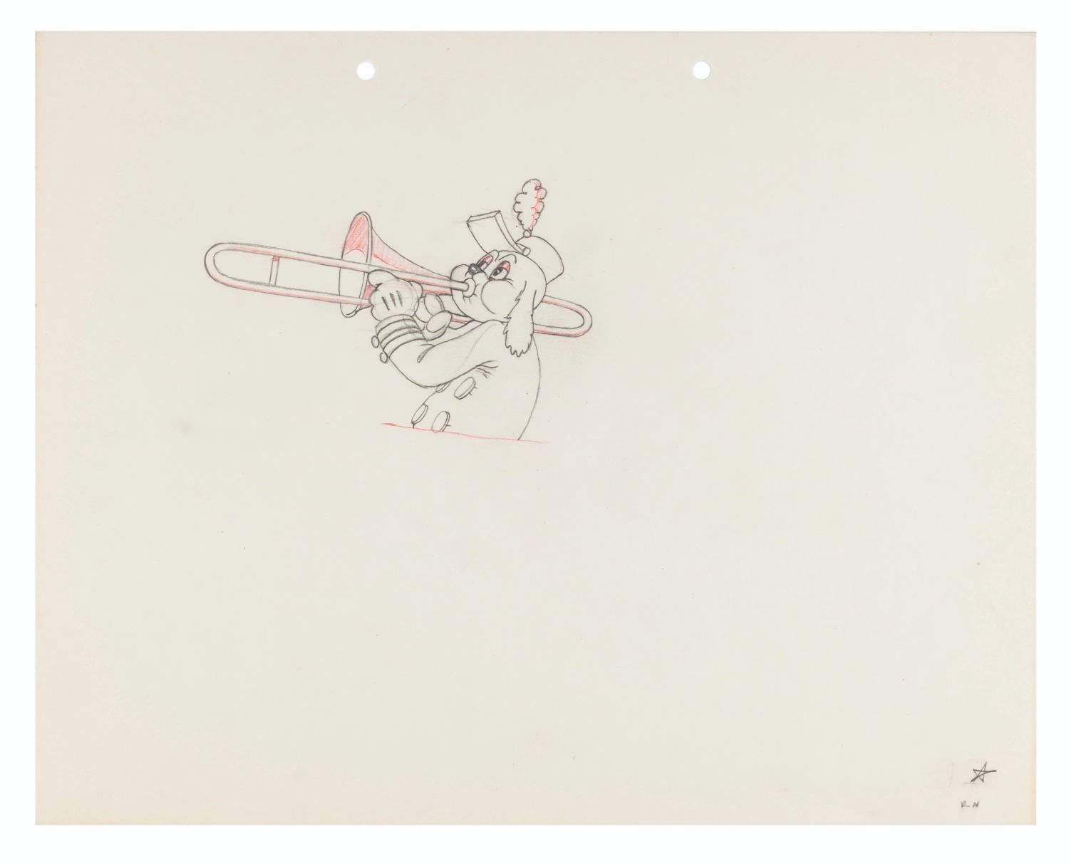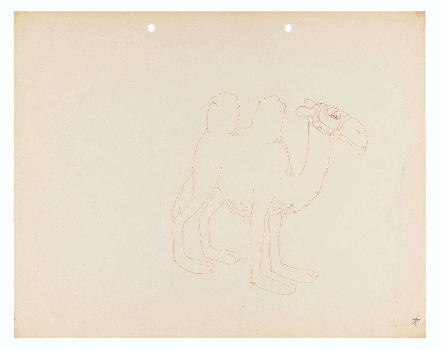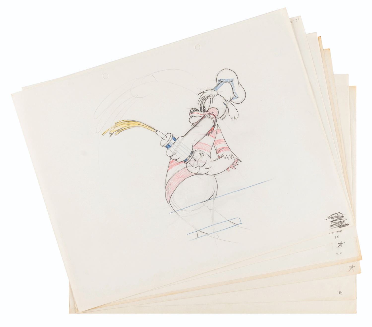 (Warner Bros., 1938-1939) A collection of seven Warner Bros. Merrie Melodies production drawings, three from the 1939 short "Hobo Gadget Band," three from the 1938 short "A-Lad-In Baghdad," and one from an unknown production. With image sizes measuring from 1.5" x 1.75" to 6.5" x 7" on 9.5" x 12" animation paper, the drawings accomplished in graphite and colored pencils display in very good condition with light wear, minor stains, light creasing, and discoloration from age.