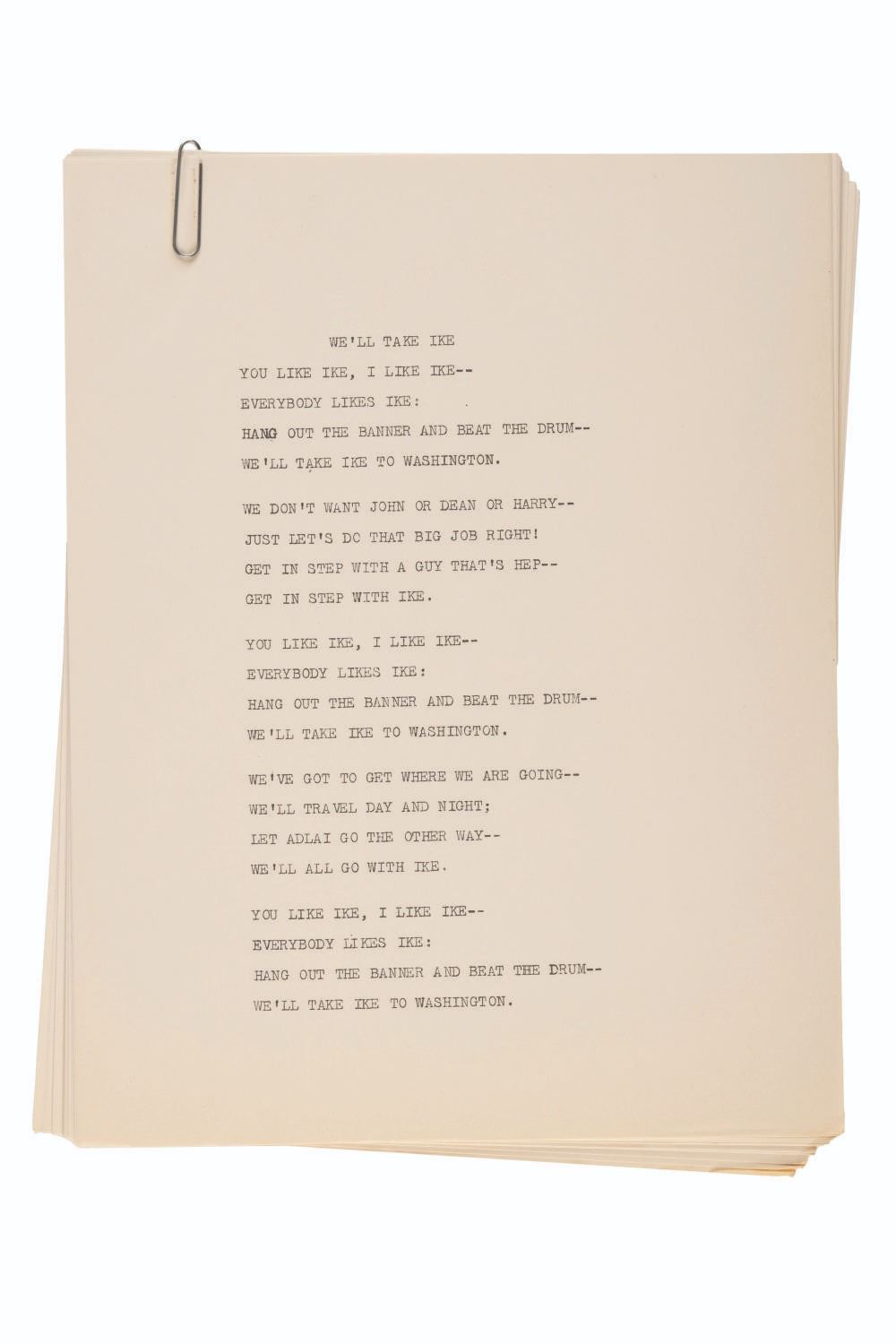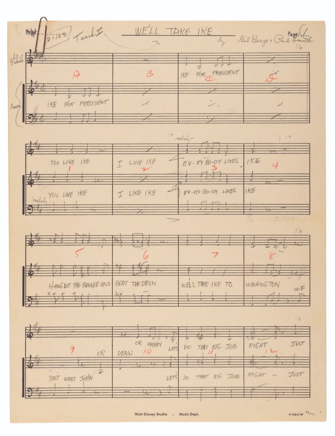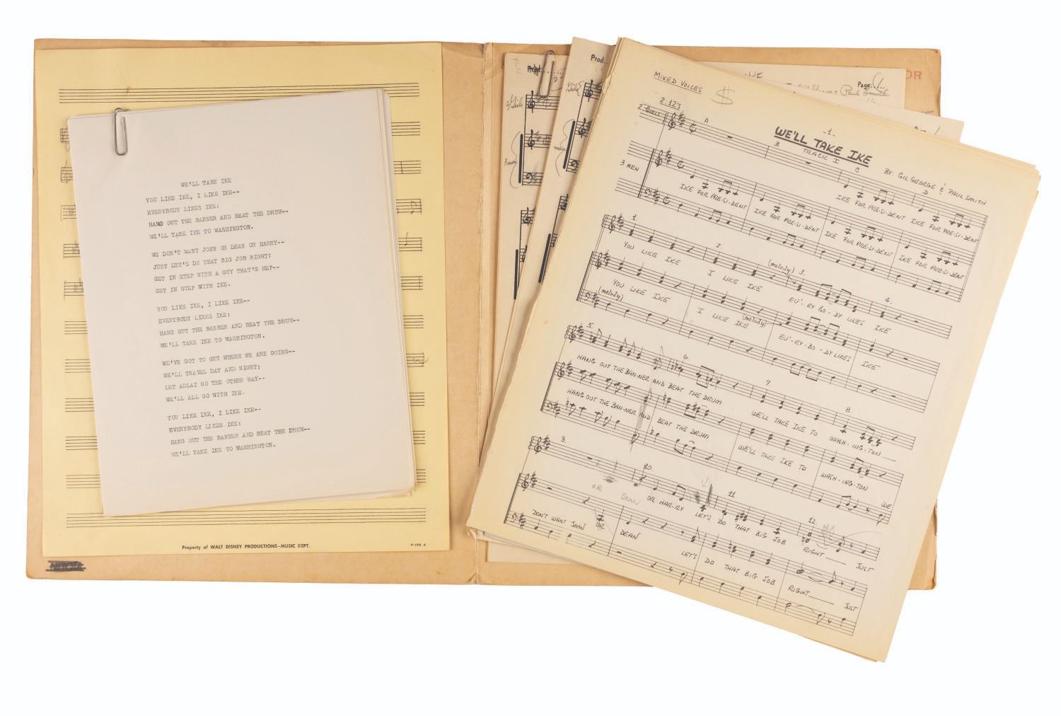 (Disney, 1952) A collection of 28 pages of sheet music and 30 duplicate pages of lyrics from the production of the Dwight Eisenhower “We’ll Take Ike” political ad. The ads were co-created by Disney volunteers outside of normal working hours and featured music written by George and Paul Smith. The animated short helped popularize the phrase "I Like Ike." Ranging in size from 8.5” x 11” to 11.25” x 14”, the sheet music and lyrics are in very good condition with light creases, wear, marks from a paper clip, and discoloration from age.