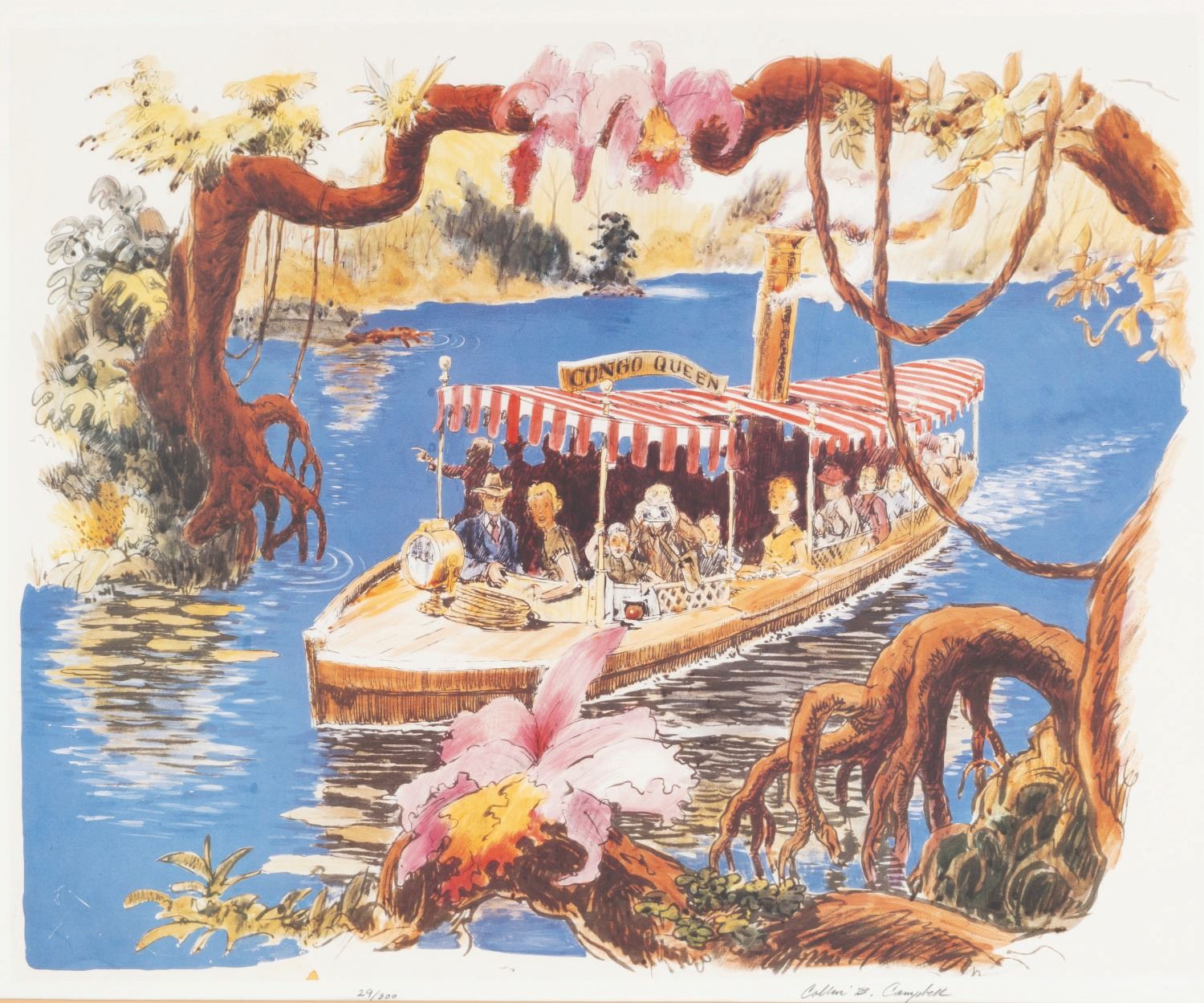 (Disney Gallery, 1987) A print of Harper Goff’s original Congo Queen concept art for the Jungle Cruise, released in a limited edition of 300. The piece was signed by Imagineer Collin Campbell who had colored the original piece. Numbered 29/300, the piece measuring 23” x 28” is in good condition, with some small scratches in the lower left corner.