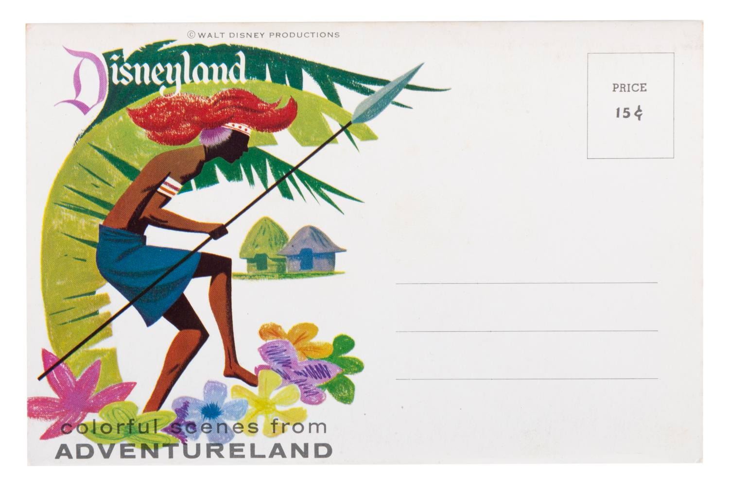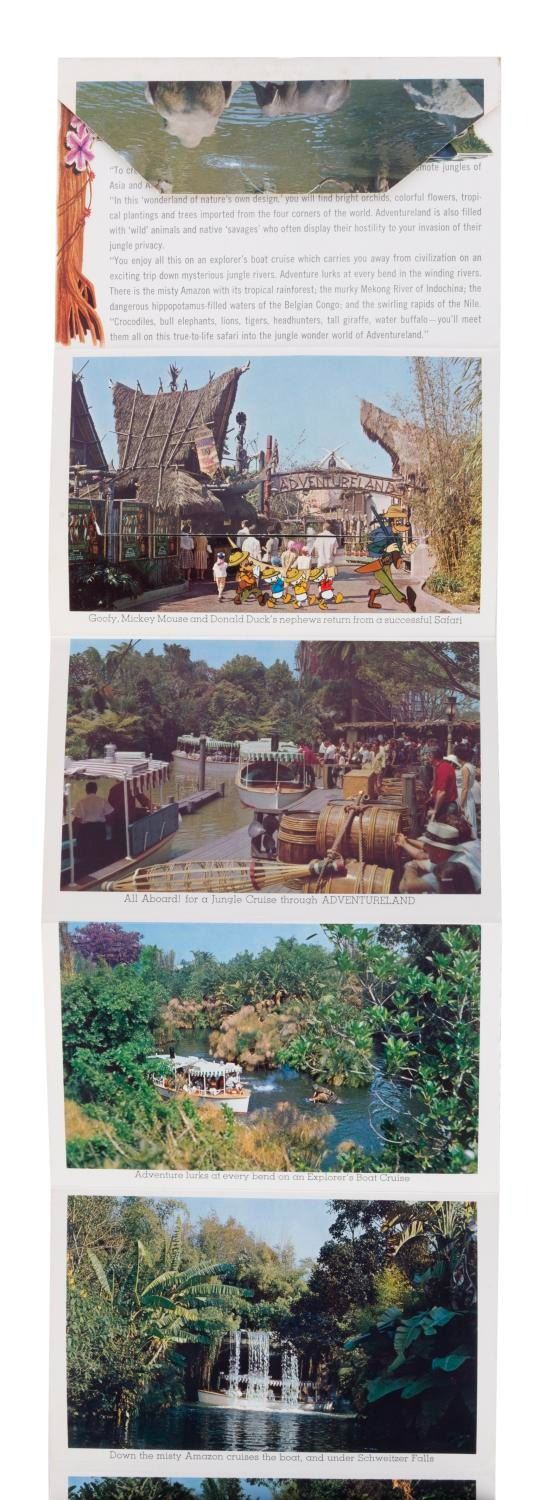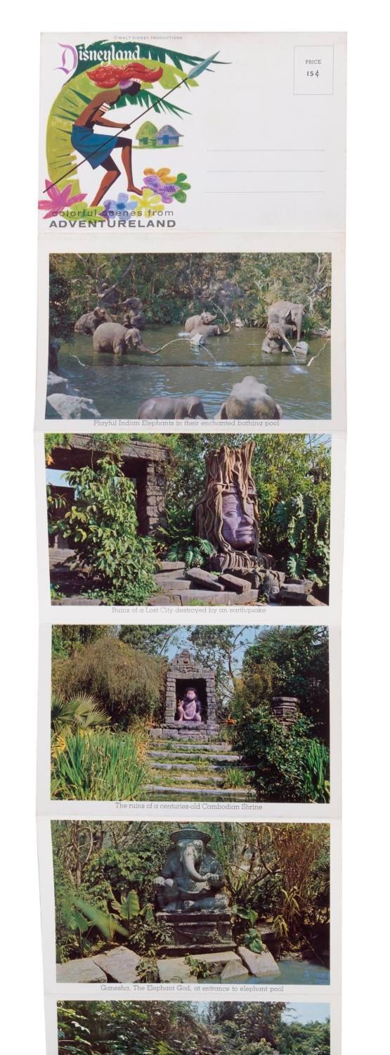 (Disneyland, 1960s) A Disneyland Colorful Scenes from Adventureland Postcard Book. This postcard book features (6) photographic images of Adventureland and its newest addition of Walt Disney’s Enchanted Tiki Room, supplemented with Disney characters. Measuring 6”x3.75”, the postcard book is in very good condition, with unpunched cards and a few signs of wear to edges or corners.