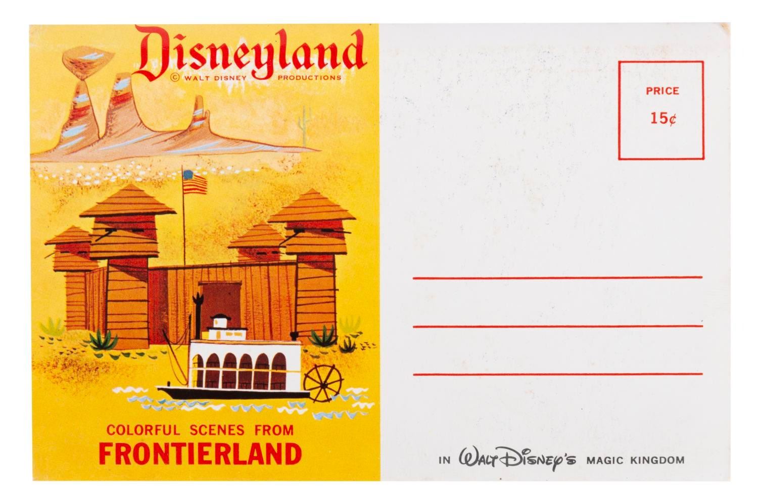 (Disneyland, 1960s) A Disneyland Colorful Scenes from Frontierland Postcard Book. This postcard book contains (12) photographic images of Frontierland including the Indian Village, Golden Horseshoe Revue, Tom Sawyer Island, and Rainbow Caverns. Measuring 6”x3.75”, the postcard book is in very good condition, with unpunched cards and wear to edges or corners.