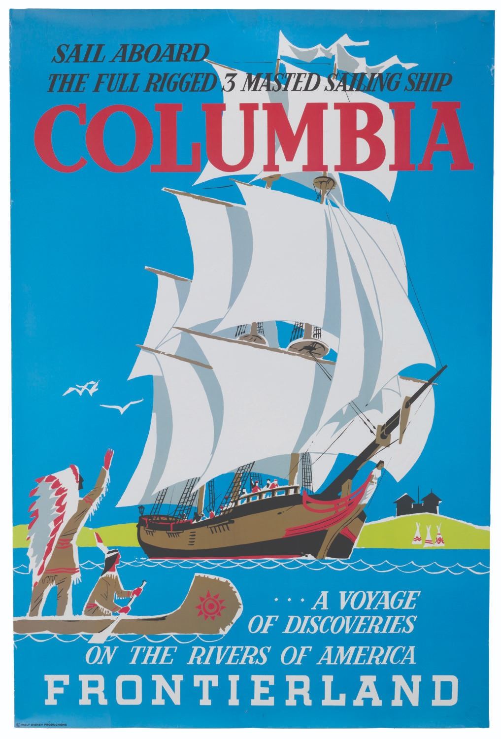 (The Disney Gallery, 1998) A full-size 40th anniversary reproduction of the Sailing Ship Columbia attraction poster designed by Bjorn Aronson. The poster was available at The Disney Gallery and features a commemorative embossing in the lower right corner. Measuring 36" x 54", the poster is in good condition with edge wear and creasing.
