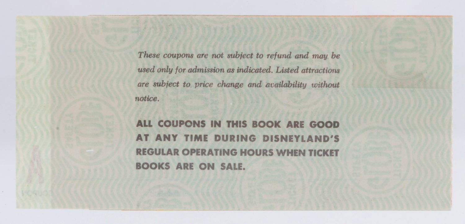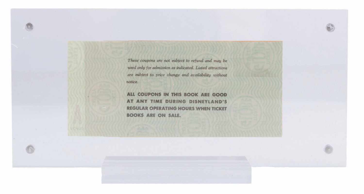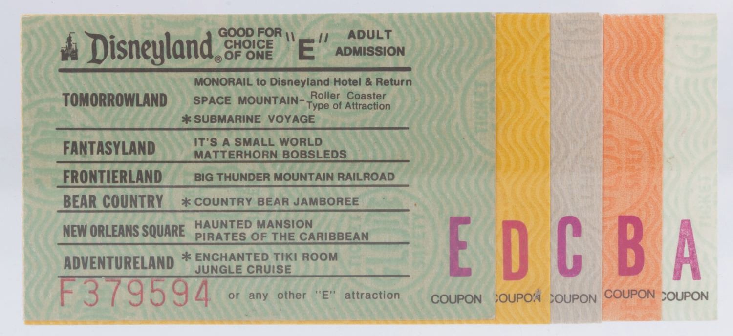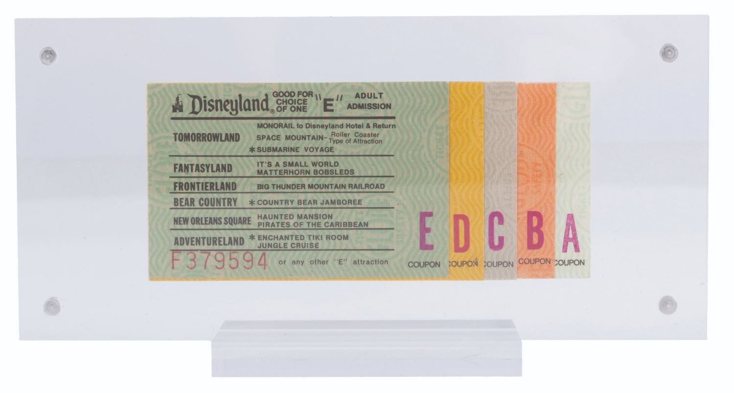 (Disneyland, 1980) A set of five"A” thru"E” tickets from a Disneyland Adult Admission book from 1980, including the newest attraction Big Thunder Mountain Railroad. The tickets are in fine condition with a plexiglass display.