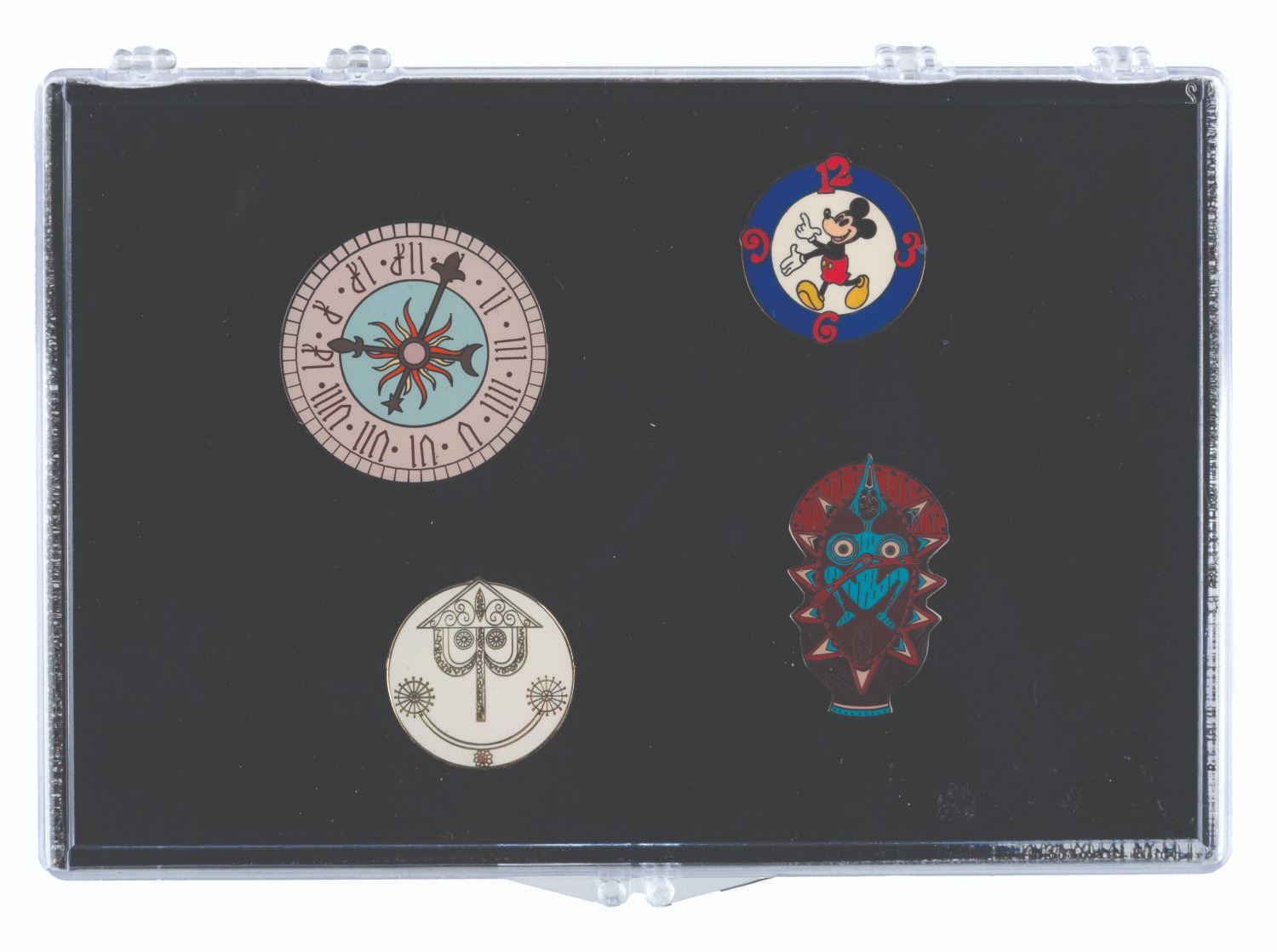 (Disneyland, 2001) A complete set of four Disneyland clock face pins, each given by management exclusively to Cast Members who enhanced a Guests' pin trading experience. Included are pins for Fantasyland, the Enchanted Tiki Room, It's a Small World, and Mickey's Toontown. Measuring up to 1.25” in diameter, the pins are in fine condition.