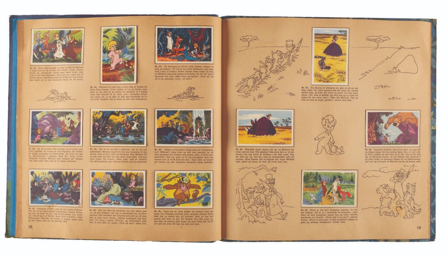 (Rich’s, 1953) A "Peter Pan" sticker book from Denmark, complete with 196 stickers in place telling the story of Peter Pan. Measuring 11" x 11", the sticker book is in good condition with edge wear, scuffs to the cover, and pages browning from age.