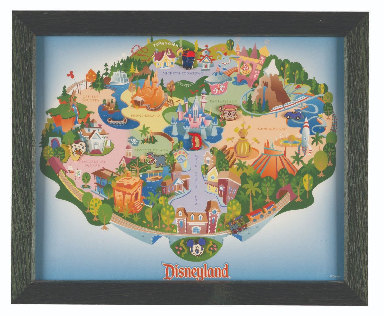 (Disneyland, 2000) A framed complete set of nine gift-with-purchase pins from Disneyland. Released in a limited edition of 5000, the pins commemorate Disneyland’s "lands” and come mounted to a Park map. Measuring 9” x 11” framed, the pin set is in fine condition.