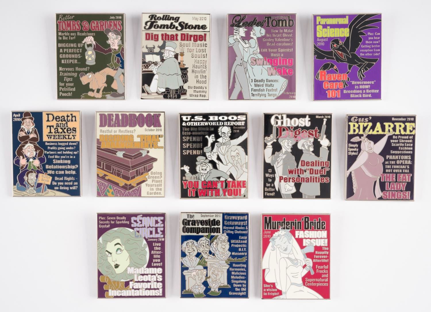 (Disney Parks, 2010) A complete collection of twelve Haunted Mansion pins parodying famous magazines. The pins are in fine condition with few signs of wear from handling.