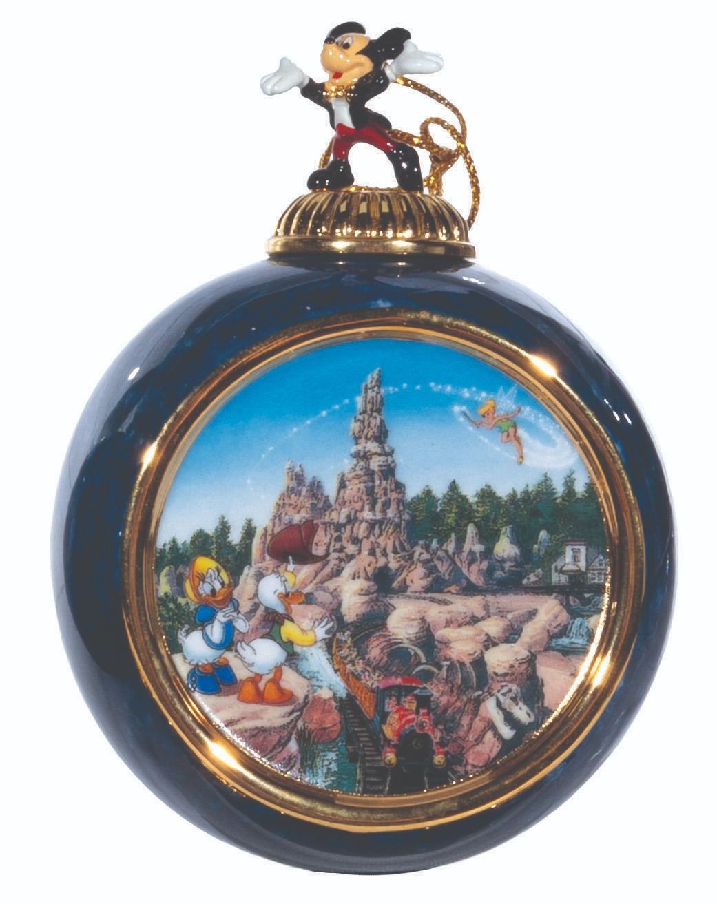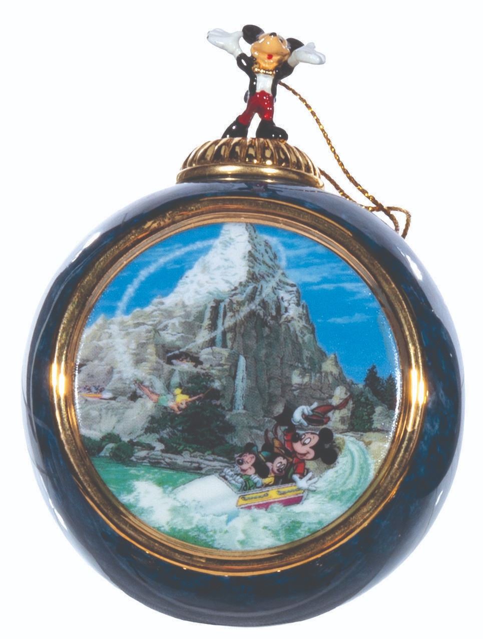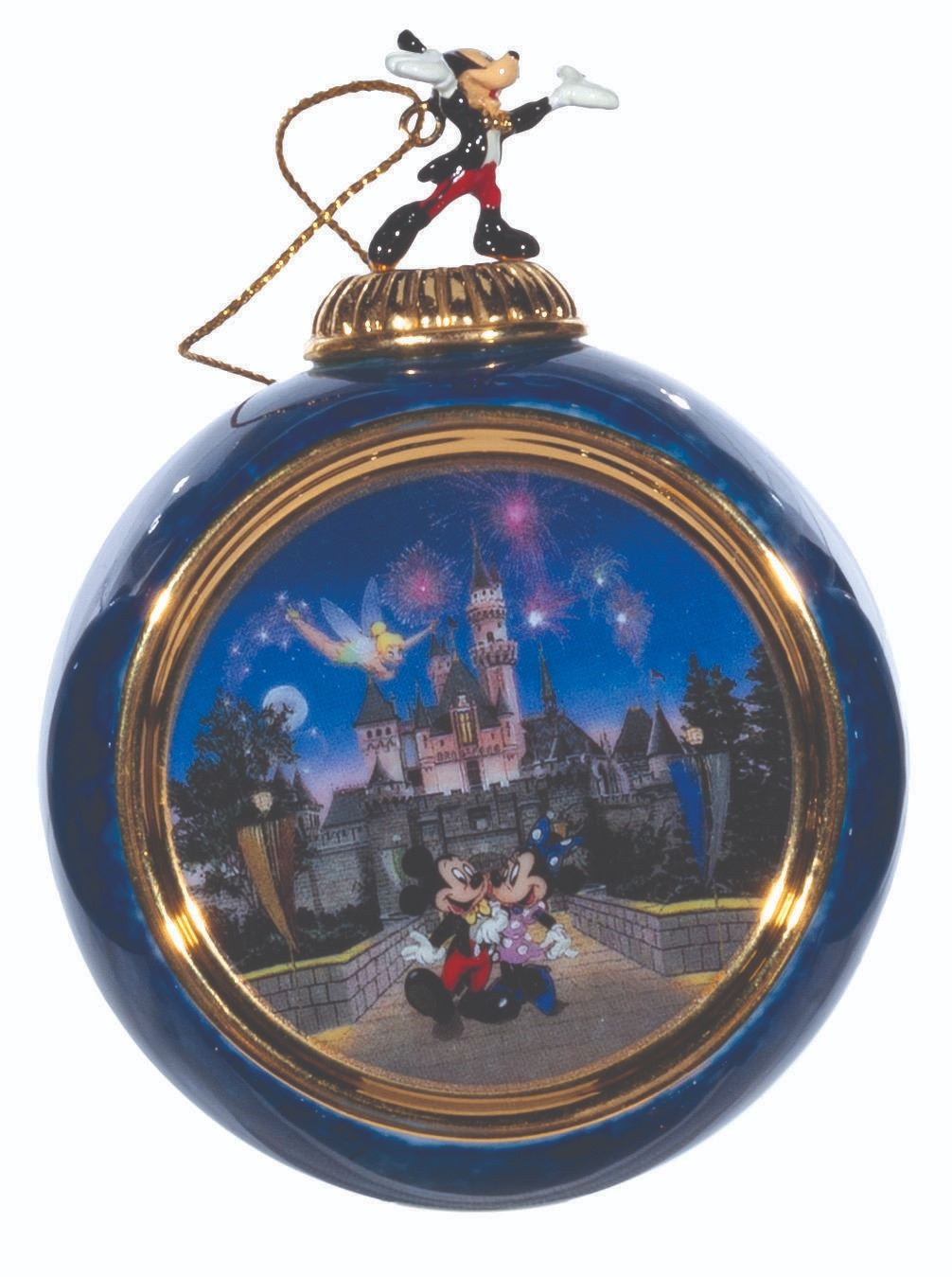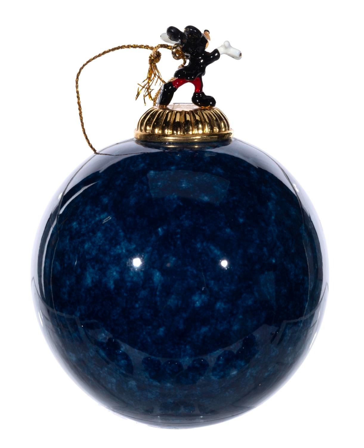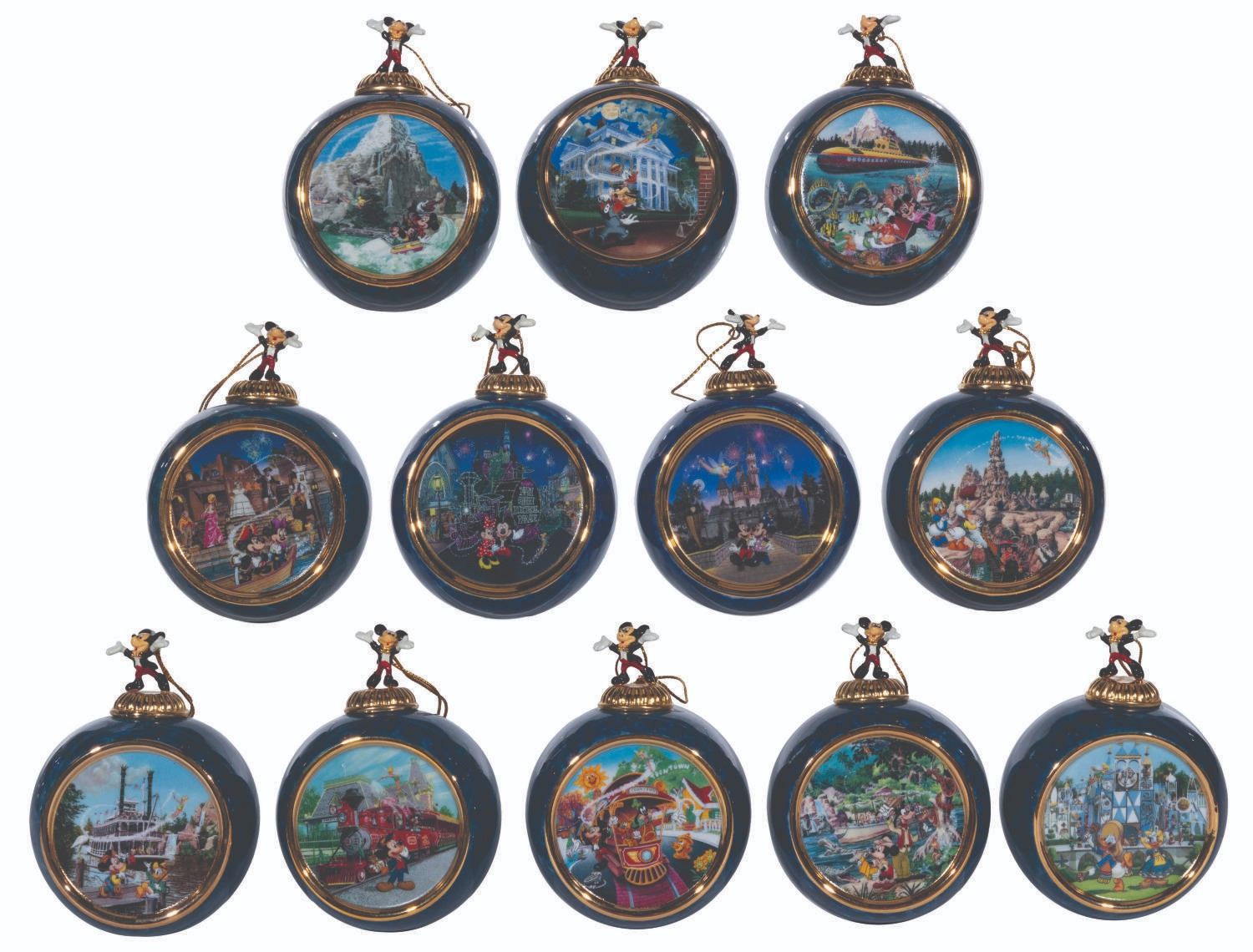 (Bradford Exchange, 2000) A complete set of 12 Christmas ornaments from the "Celebrating the Magic of Disney" Collection by Bradford Exchange. The blue-marbled porcelain ornaments feature an image of Mickey and friends at Disneyland attractions and locations. Each ornament is topped with a figural Mickey Mouse with a gold hanging cord. Measuring 4” x 3” x 2.25” deep the ornaments are in fine condition.